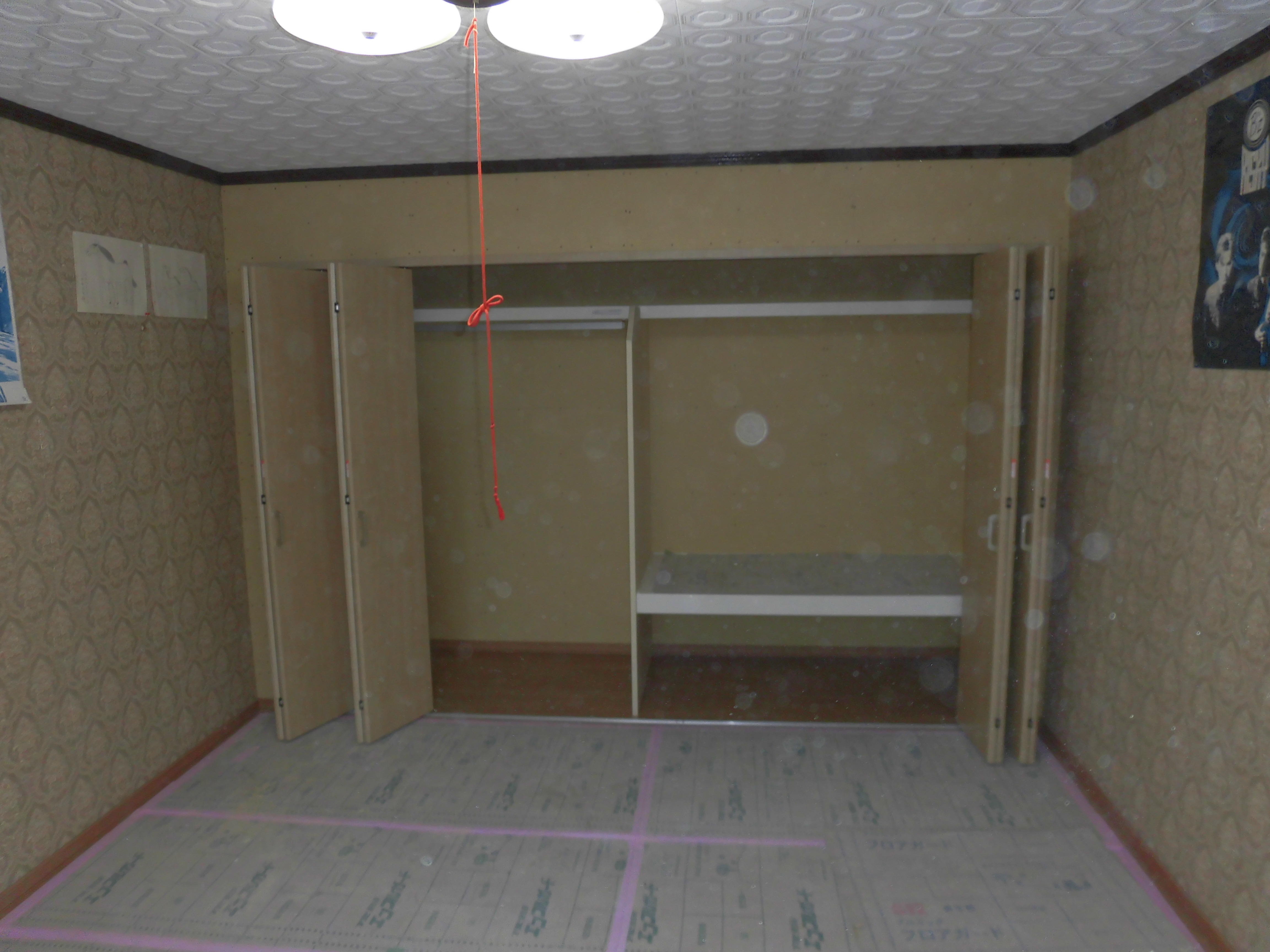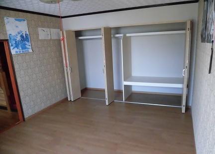 押入は、広々と収納がしやすくしたいと言うことで、折れ戸の広い物で施工しました。床はフローリングでの施工です。
