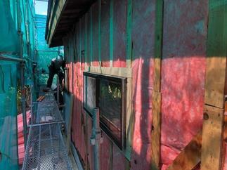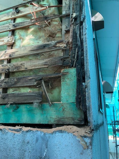 既存の外壁はモルタル仕上げのため亀裂より浸水箇所も多々あり外壁を剥がし腐食部分を取替、断熱材も入れ替えました。
