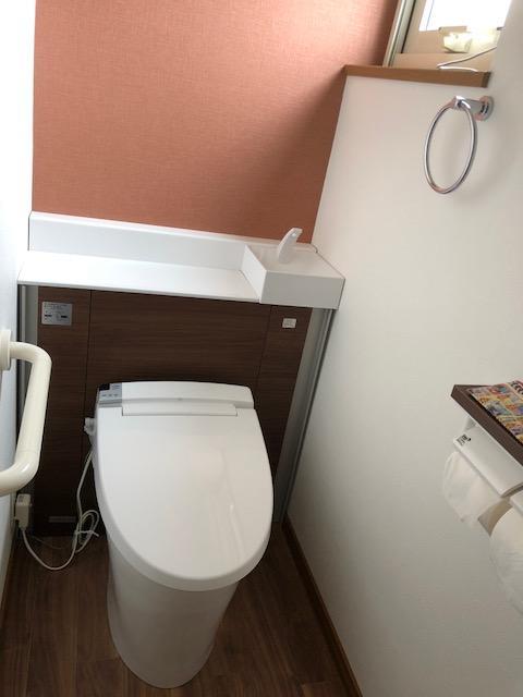 外壁屋根は耐候性の高いシリコン塗装にて塗り替え。 トイレはリフォレ取替に合わせて内装材も張替。正面壁のクロス色を変えただけでも 雰囲気の違うトイレに変身しました。