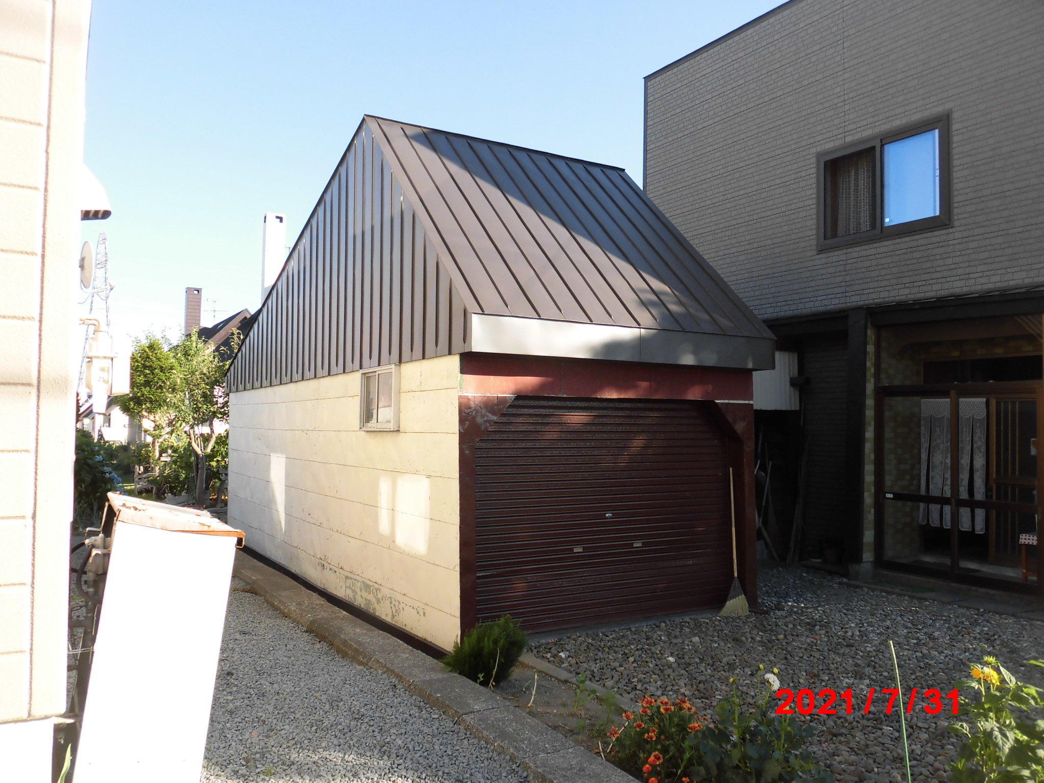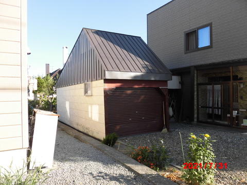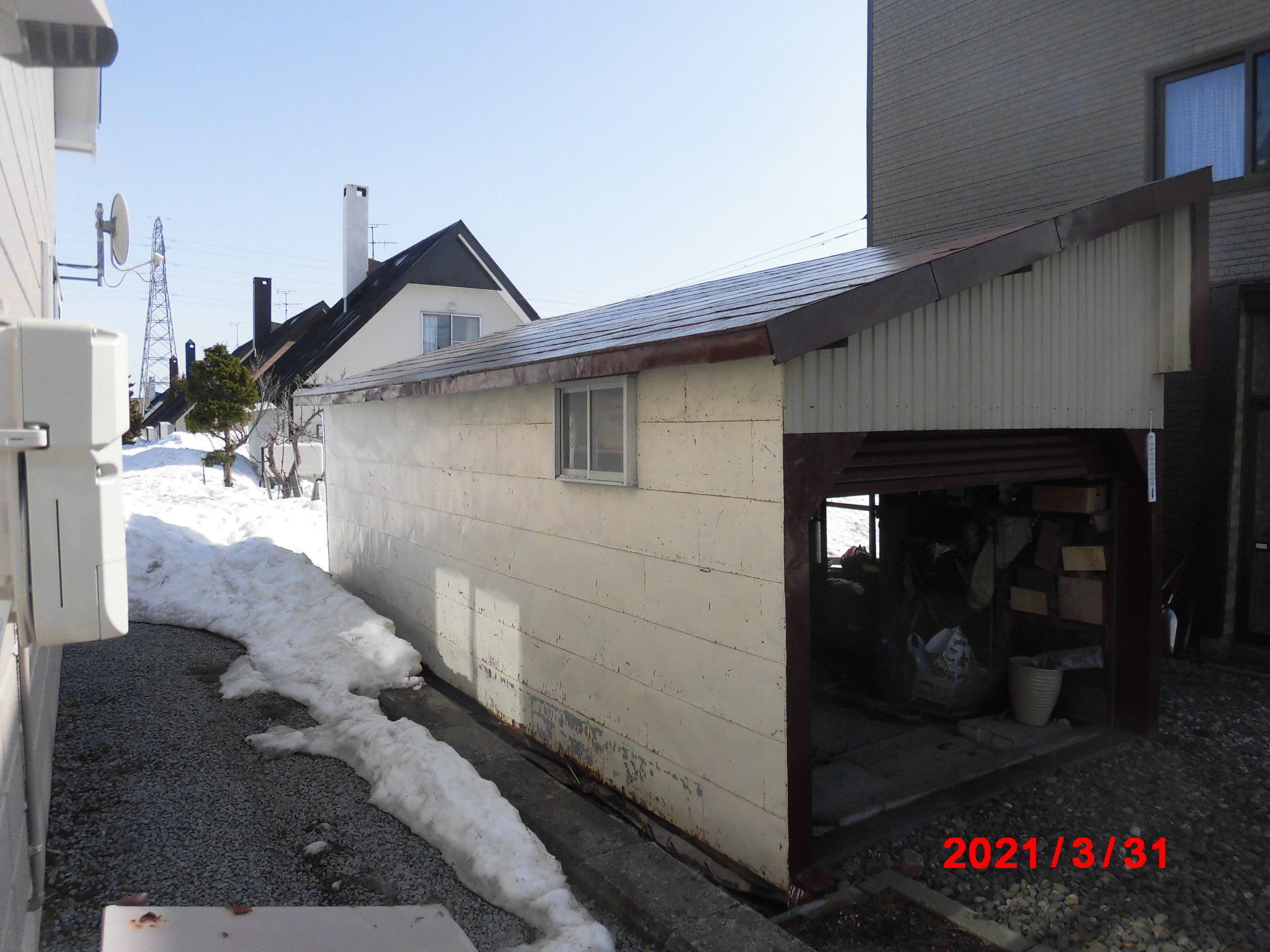 車庫の屋根から落ちた雪が、隣の家の壁まで