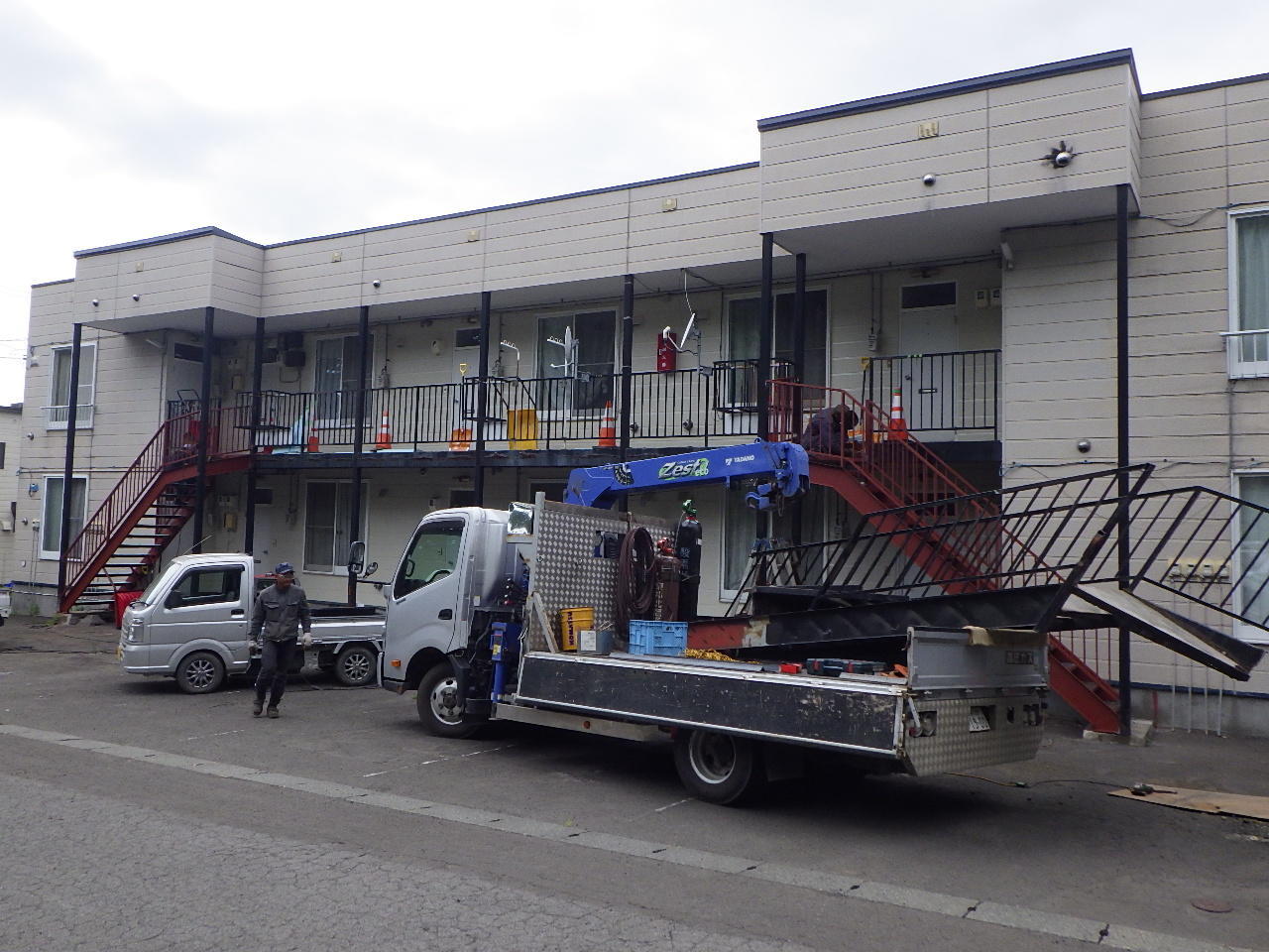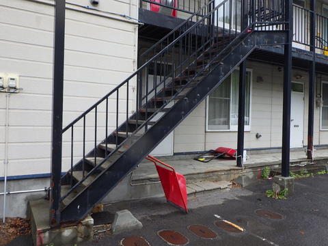 マンションの共用鉄骨階段 左右2ヶ所の 取替及び鉄骨腐食部分補修と通路 左官補修です。 入居者の方のご協力で無事、工事を完了させる事が 出来ました。ご協力感謝いたします。 (塗装工事は、別な塗装屋さんで当社はここまでです。)