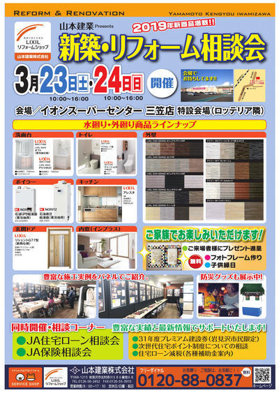 3/23・24 → イオンスーパーセンター三笠店 場所:三笠市岡山1059-1 (店舗内ロッテリア隣にて開催) 両日 AM10:00~PM16:00☆いわみざわ住宅新築&リフォームフェア