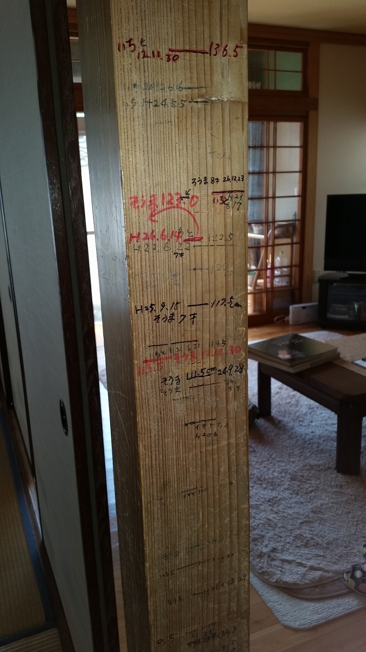 お子様たちの身長が記された柱を