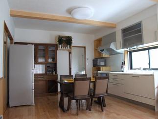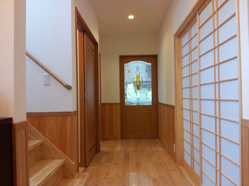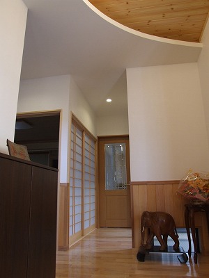 諫早市天満町の住宅密集地にお住まいのお客様です。敷地が建物に囲まれており、南には3階建てのビルも。「明るさ」をいかに確保するか、限られた敷地でお客様のご要望をいかに取り入れ反映させるか… 特に悩んだ点でした。幸い東側にお隣の広いお庭があり、いつもいるであろうLDKを東側に配し、『借景』させていただくことで明るいLDKになりました。
