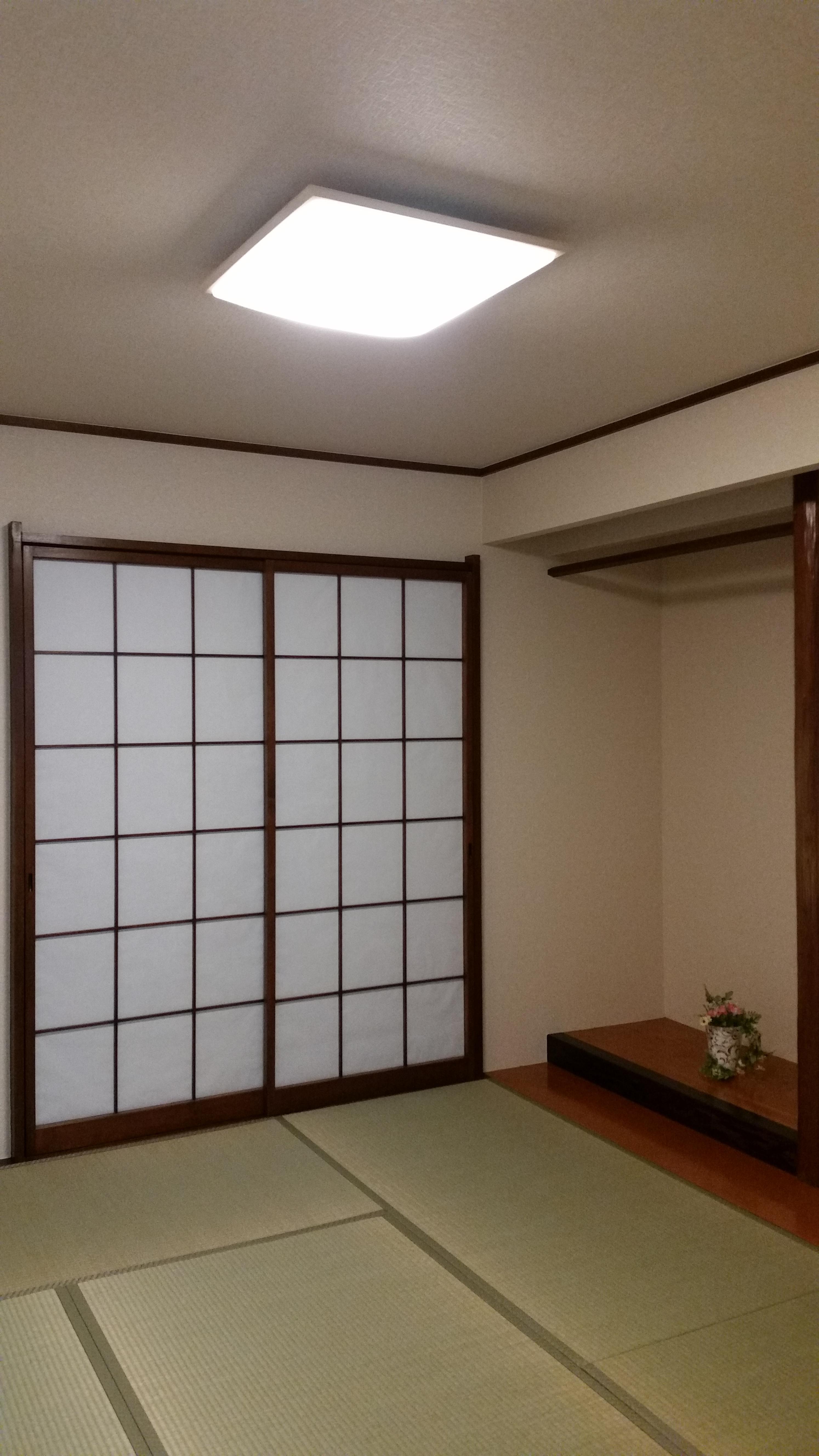 築30年の和室、天井板の張替えとじゅらく壁を和風クロスに貼り替え、永年の柱のアクやシミ取り工事も施し、見違えるほど明るい和室になりました。