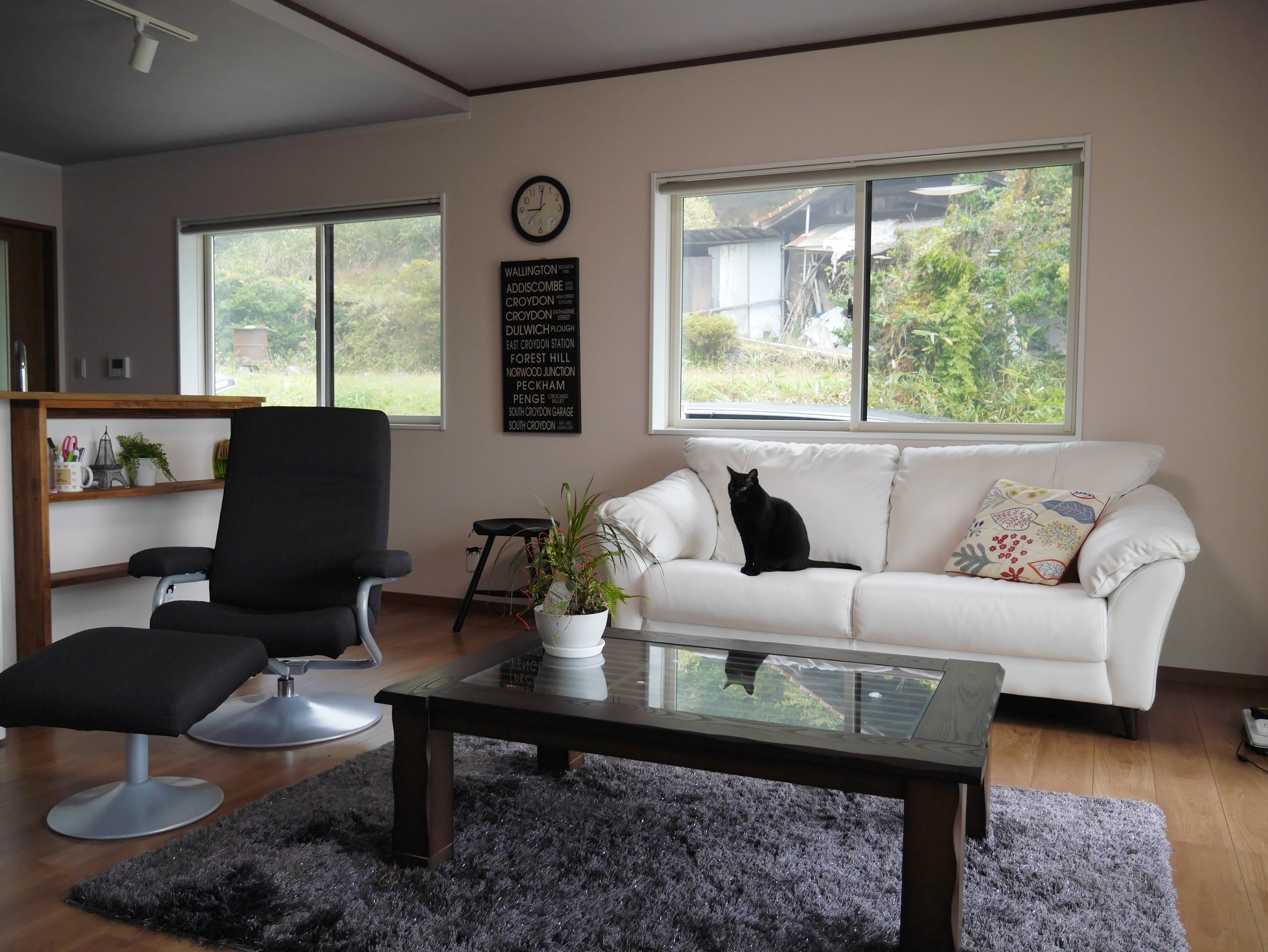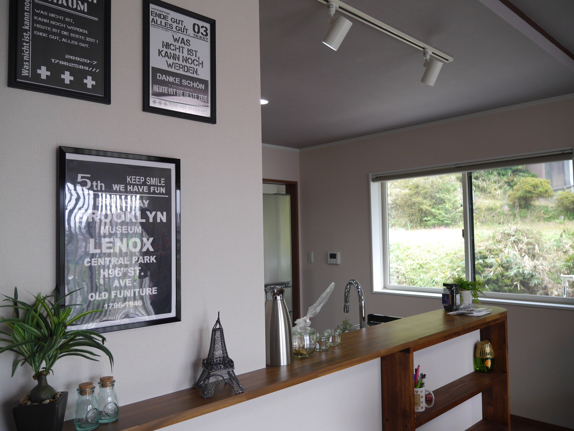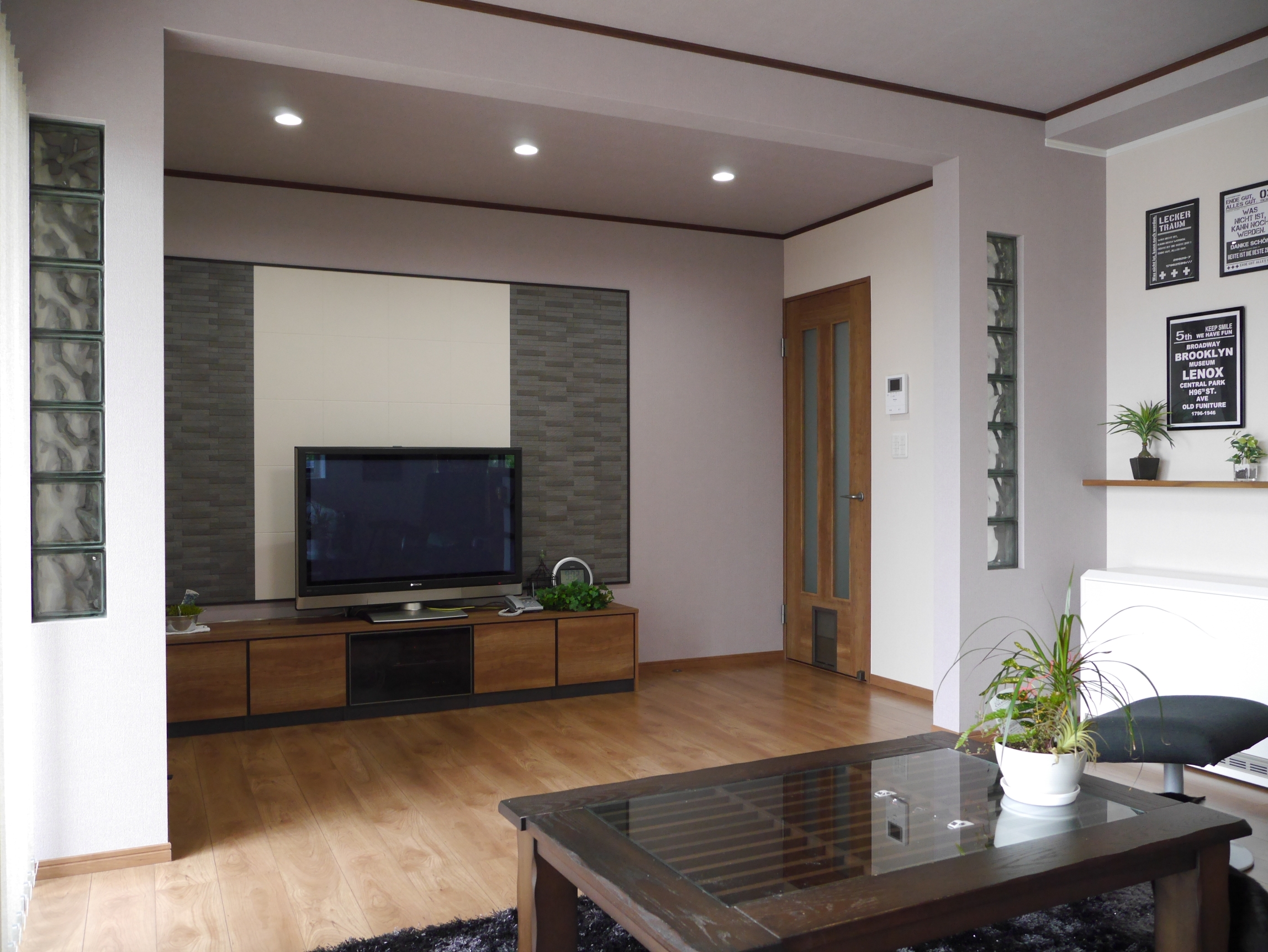 L.D.K.はインテリアにこだわってモダンテイストで統一しました。TV台の後ろの壁には機能性とデザイン性を兼ね備えたエコカラットがアクセントになっています。壁に埋め込んであるガラスブロックもお部屋のポイントになっています。