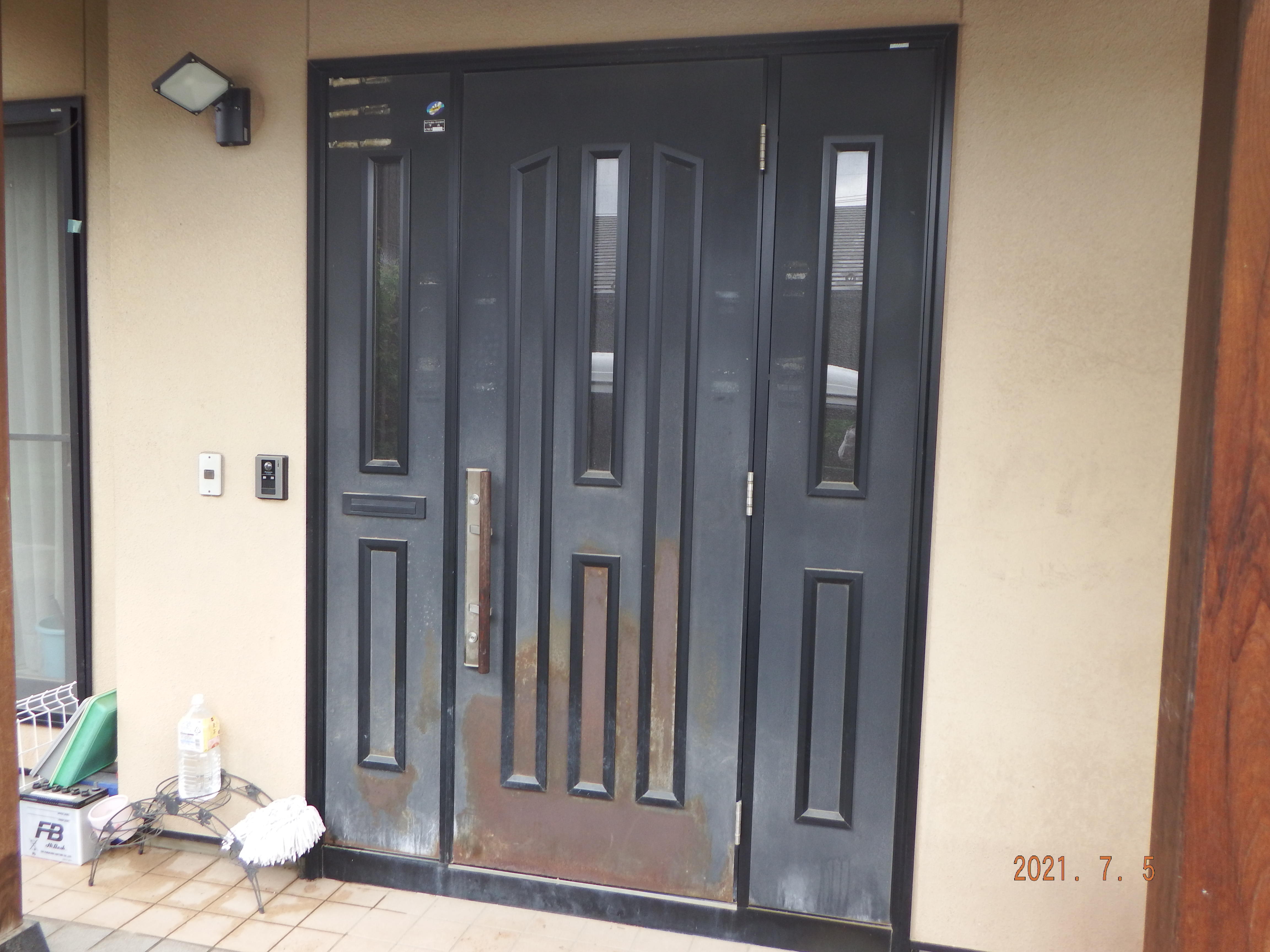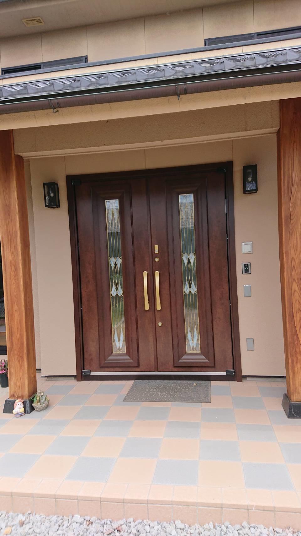 立派な玄関扉でしたが、表面が傷んでしまい、交換工事をご依頼いただきました。おしゃれで豪華なアバントス両開き玄関扉を付けさせていただきました。 廊下のサッシも樹脂サッシに交換のため、外壁工事もさせていただきました。
