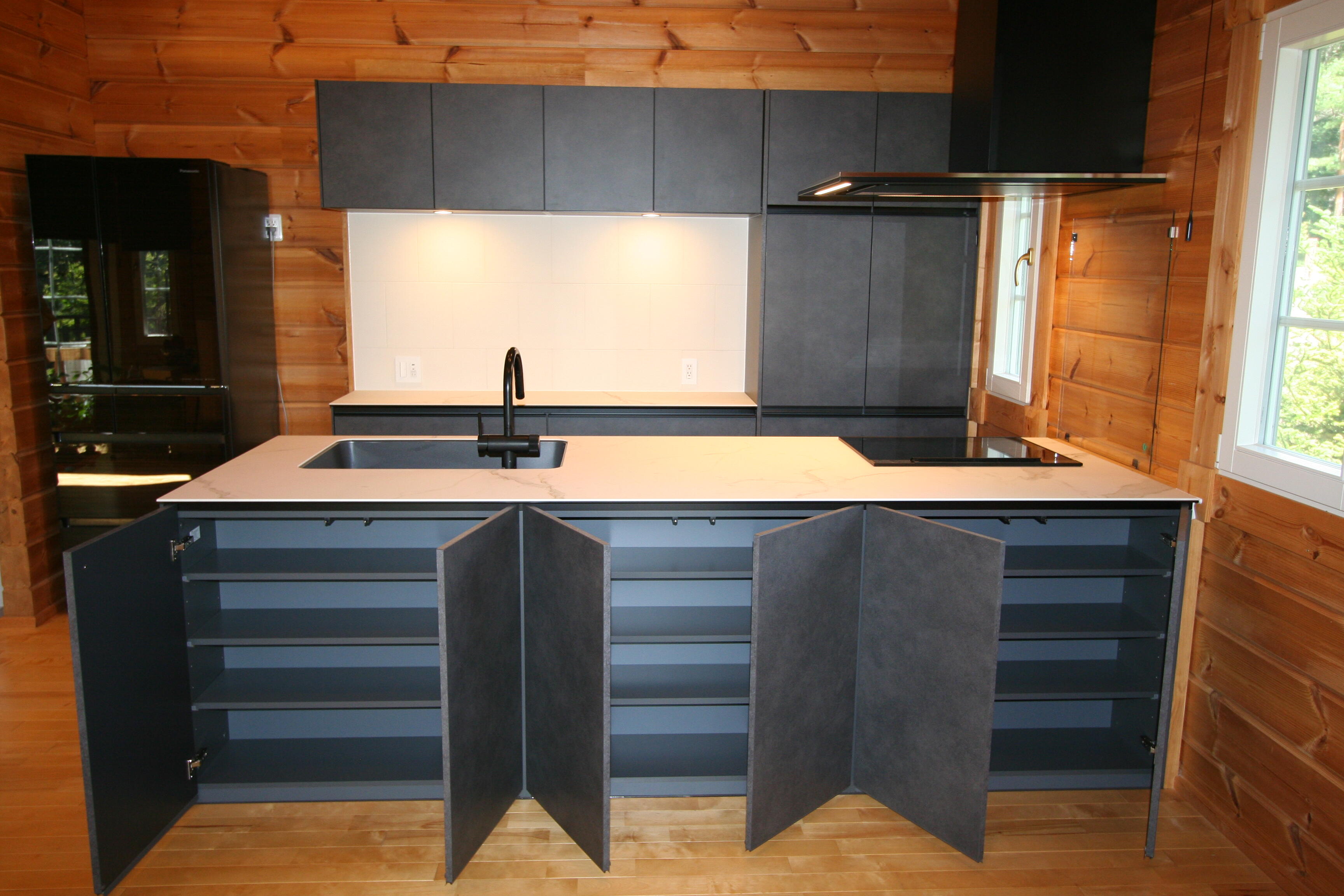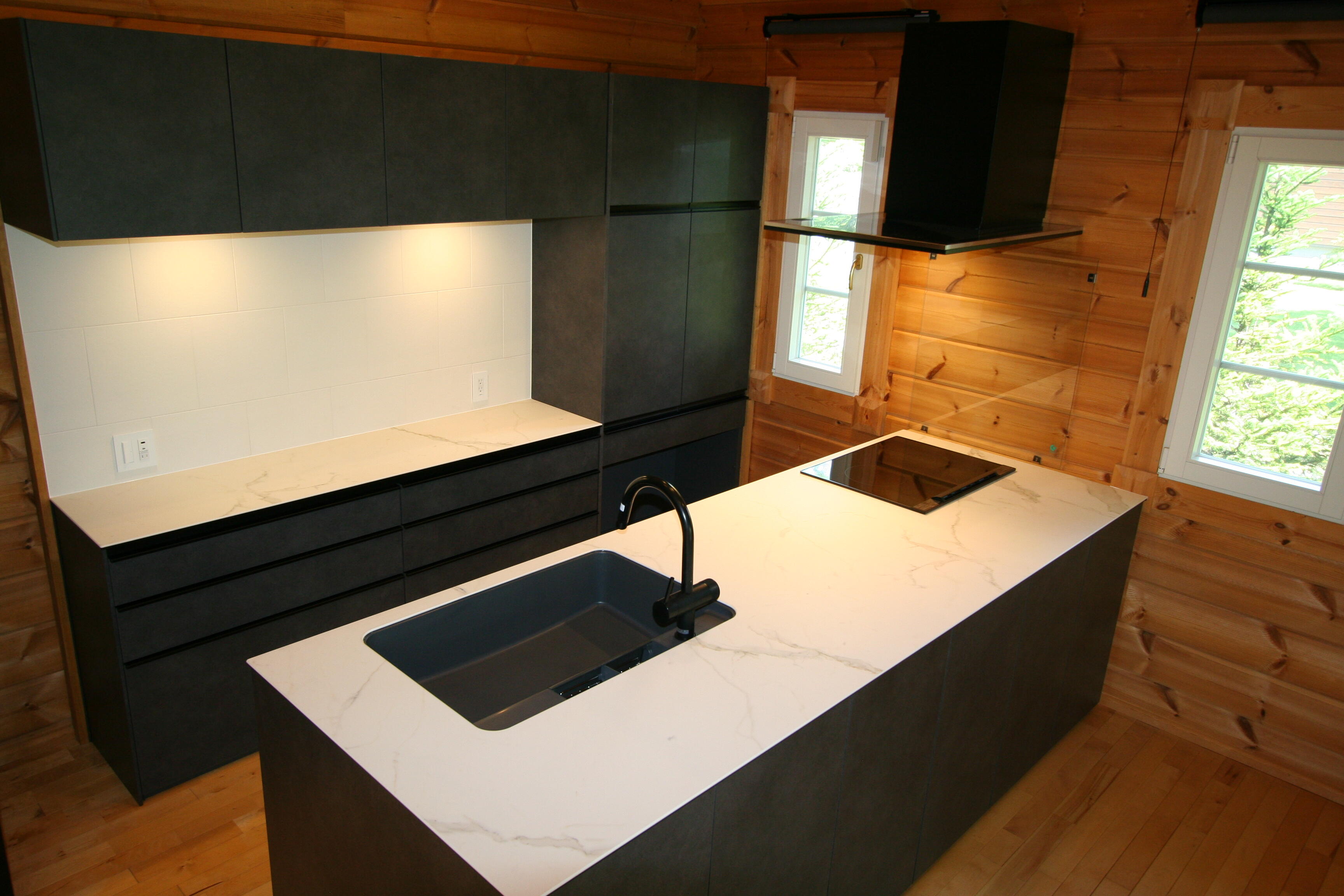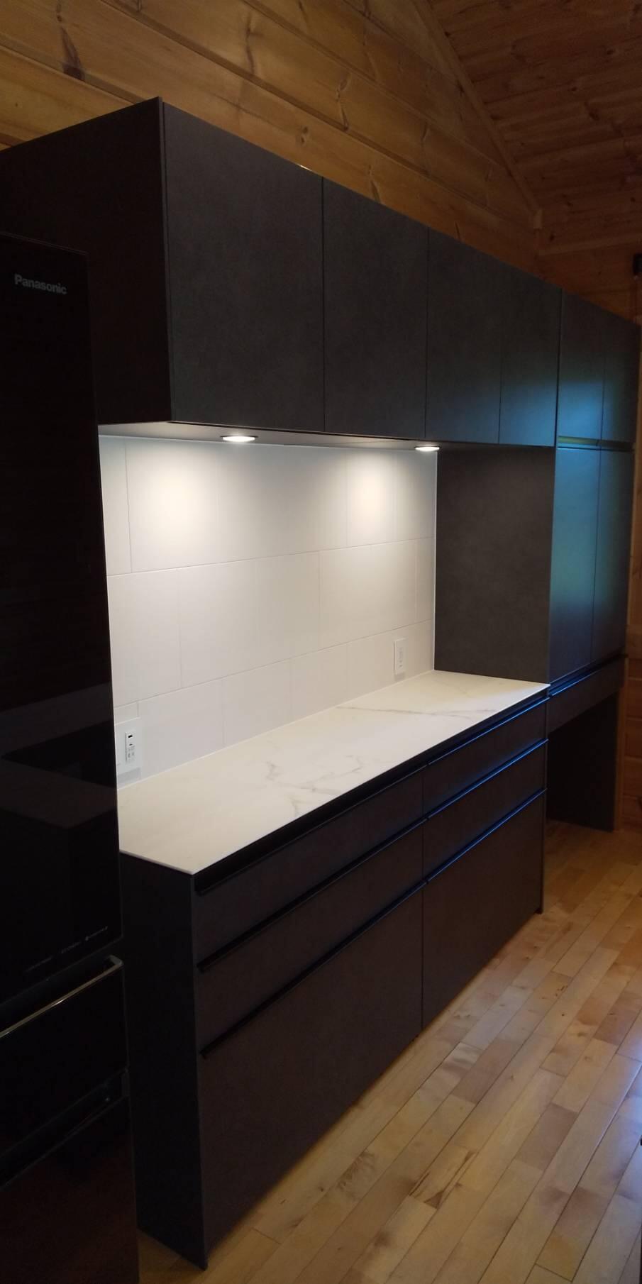 LIXILシステムキッチン リシェルのワークトップがセラミックトップで、カラカッタホワイトという新色がでて、とても気に入られて、発売を待って交換されました。家具はブラック系で揃えられたため、キッチンの扉カラーをブラックにすることが、一番のご希望でした。