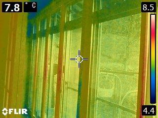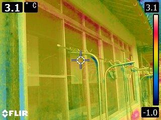 インプラス取り付け後 サーモカメラでサッシ外側の温度とサッシ内側の温度を測ってみました。スタッフもお施主様もビックリな結果が出ました。家全体に17ヶ所インプラス設置。温度差が楽しみです。
