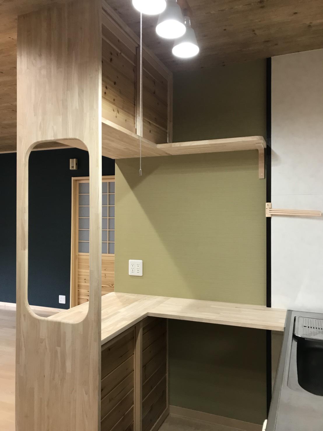 和風テイストを中心に考えながら、奥様の動線の使いやすさ・明るさ・広さを 重視したリフォームにしました。 部屋のアクセントになるよう、ドアにステンドグラスを入れ 少し洋風のイメージも取り入れました。 また、大工さんの腕を活かし 手作りのカウンター台や収納も作りました。