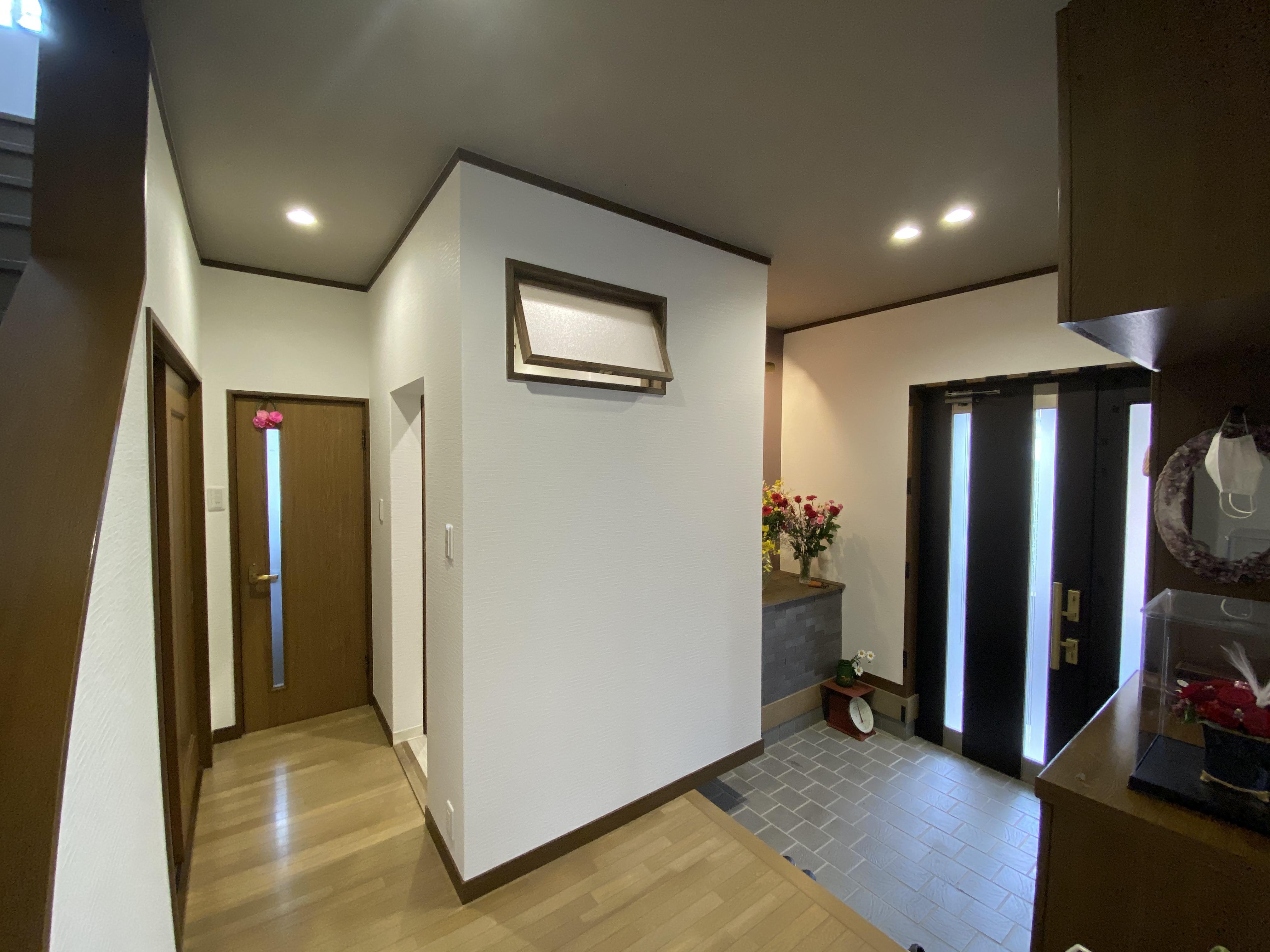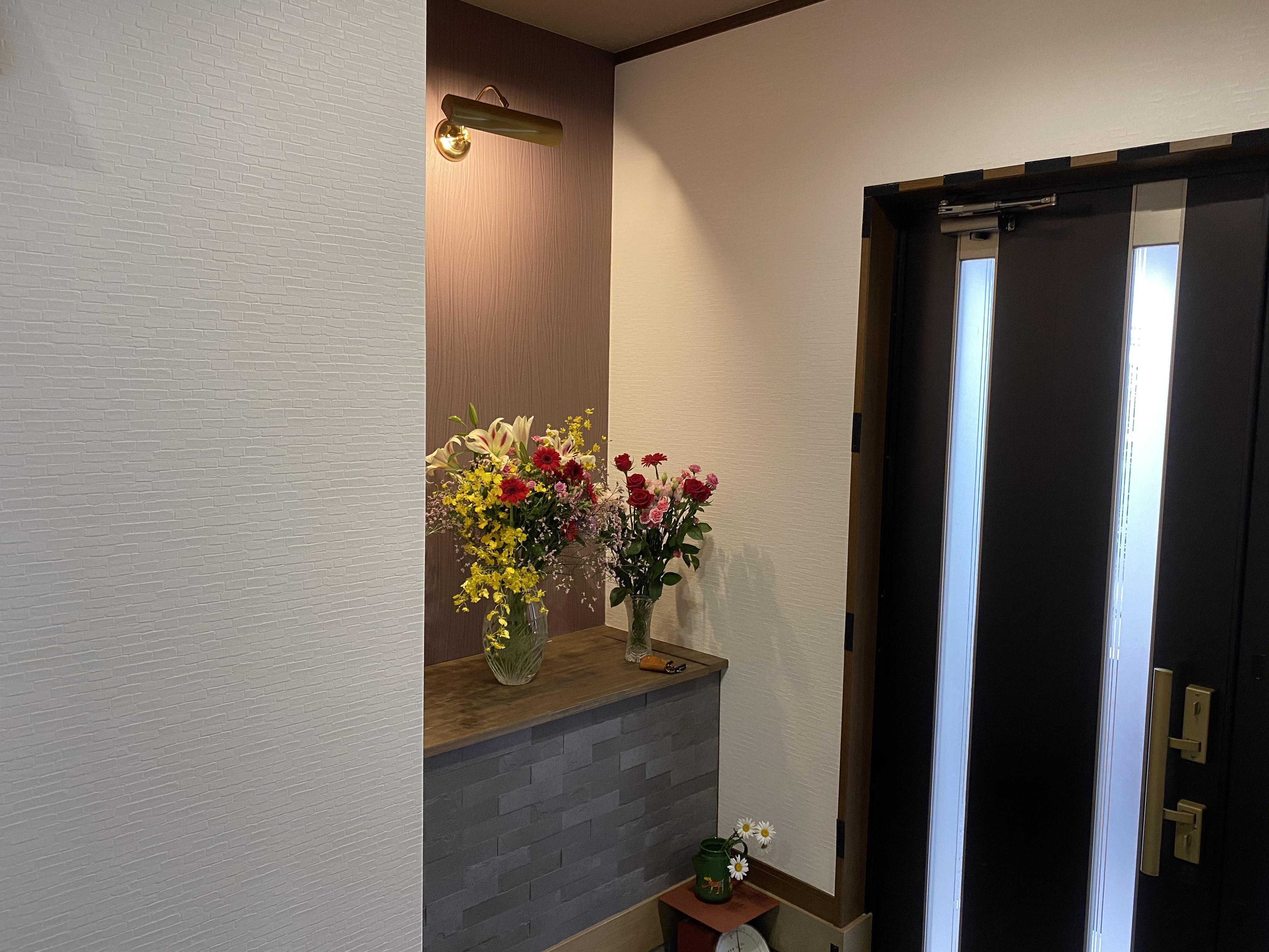 伴って玄関ホールが少し狭くなりますが 収納庫を備えた飾り棚&アクセントクロスと ちょっとお洒落な照明をプラス!