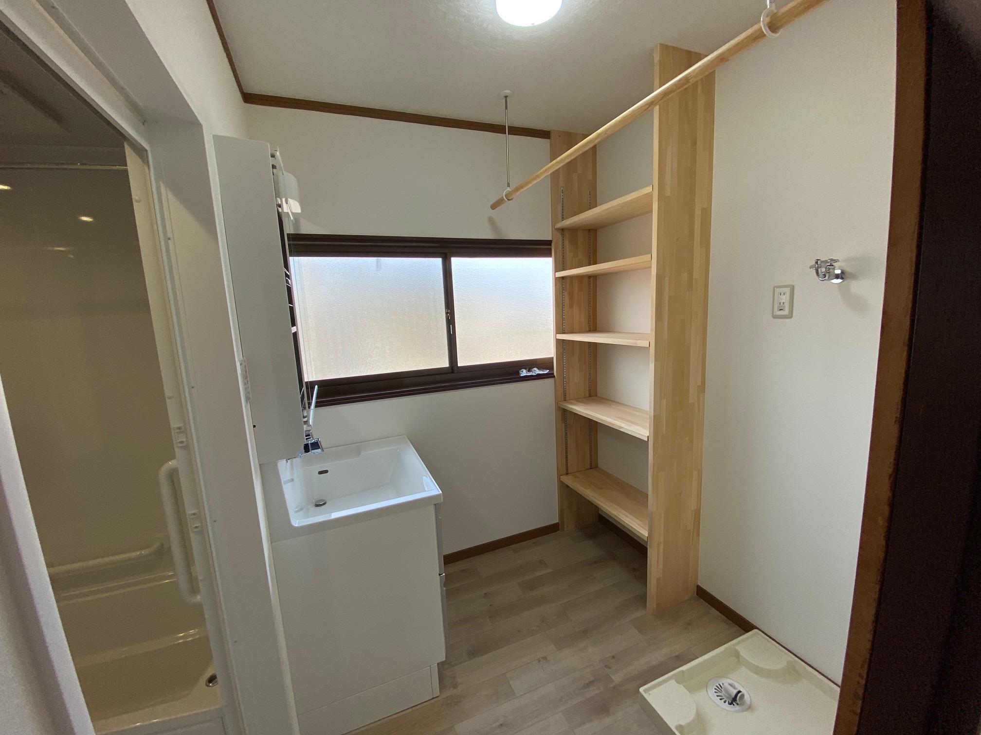 洗面脱衣室は 「造り付けの収納棚(可動式)」「物干し器具」「こだわりの配置計画」