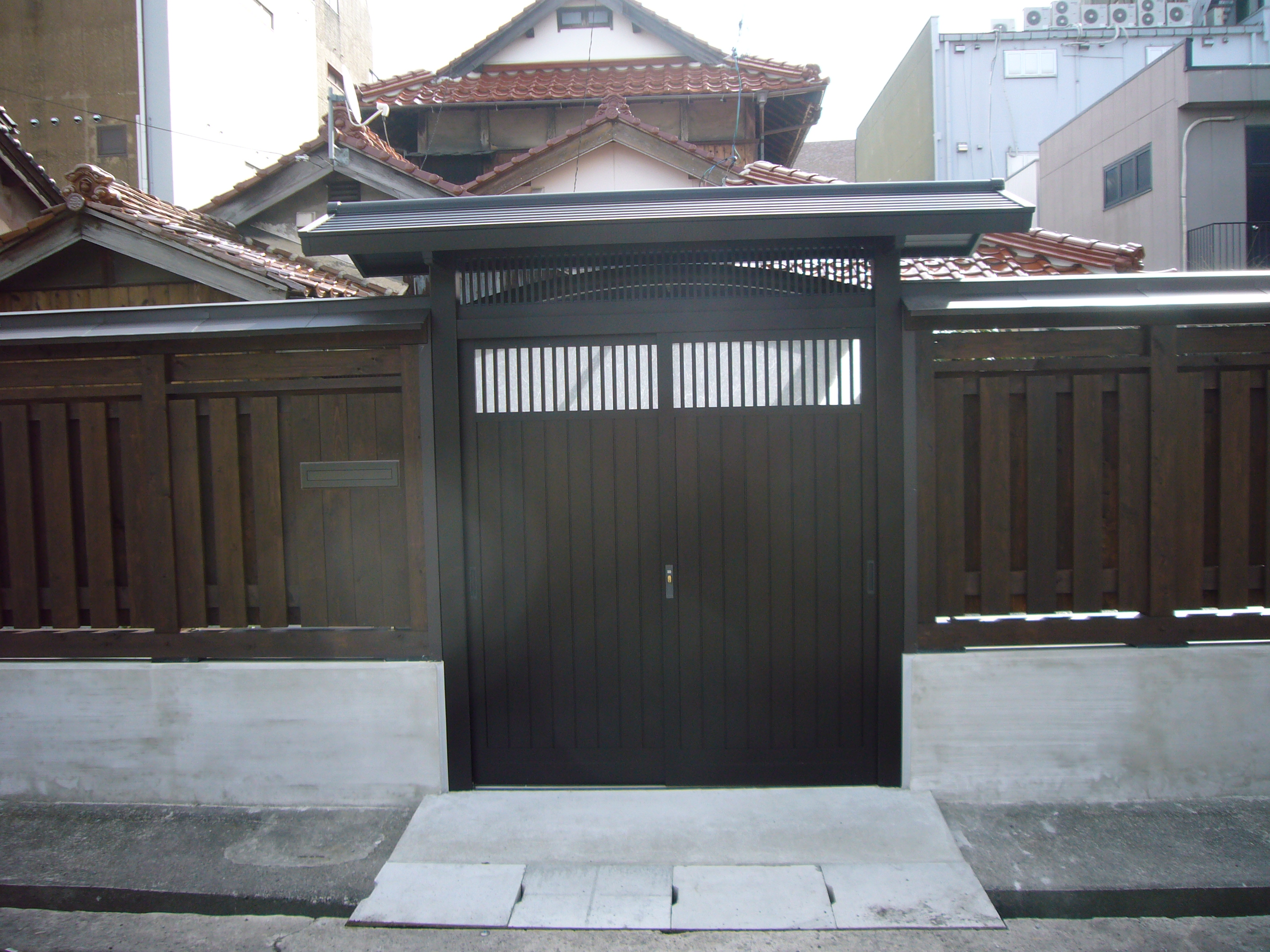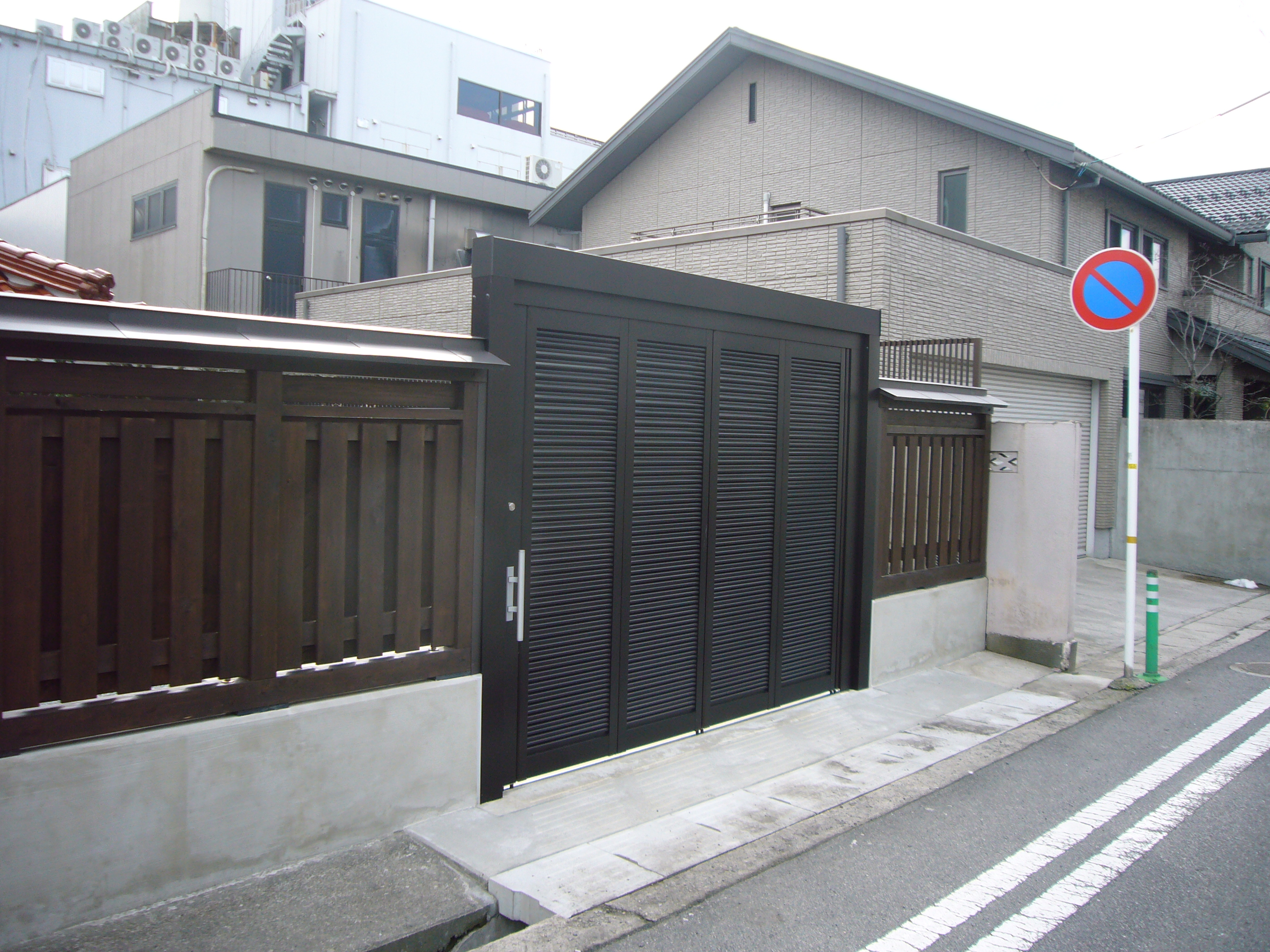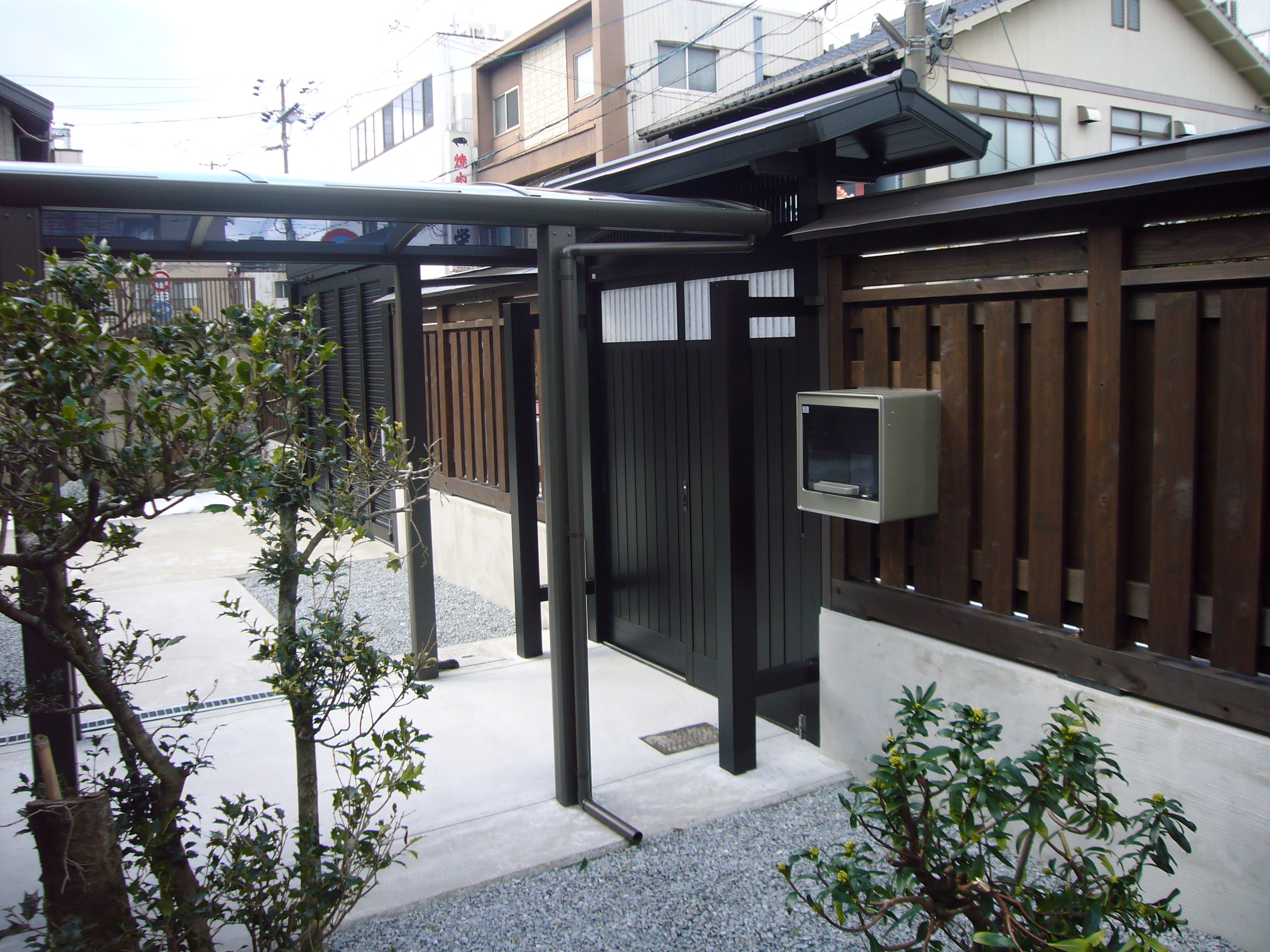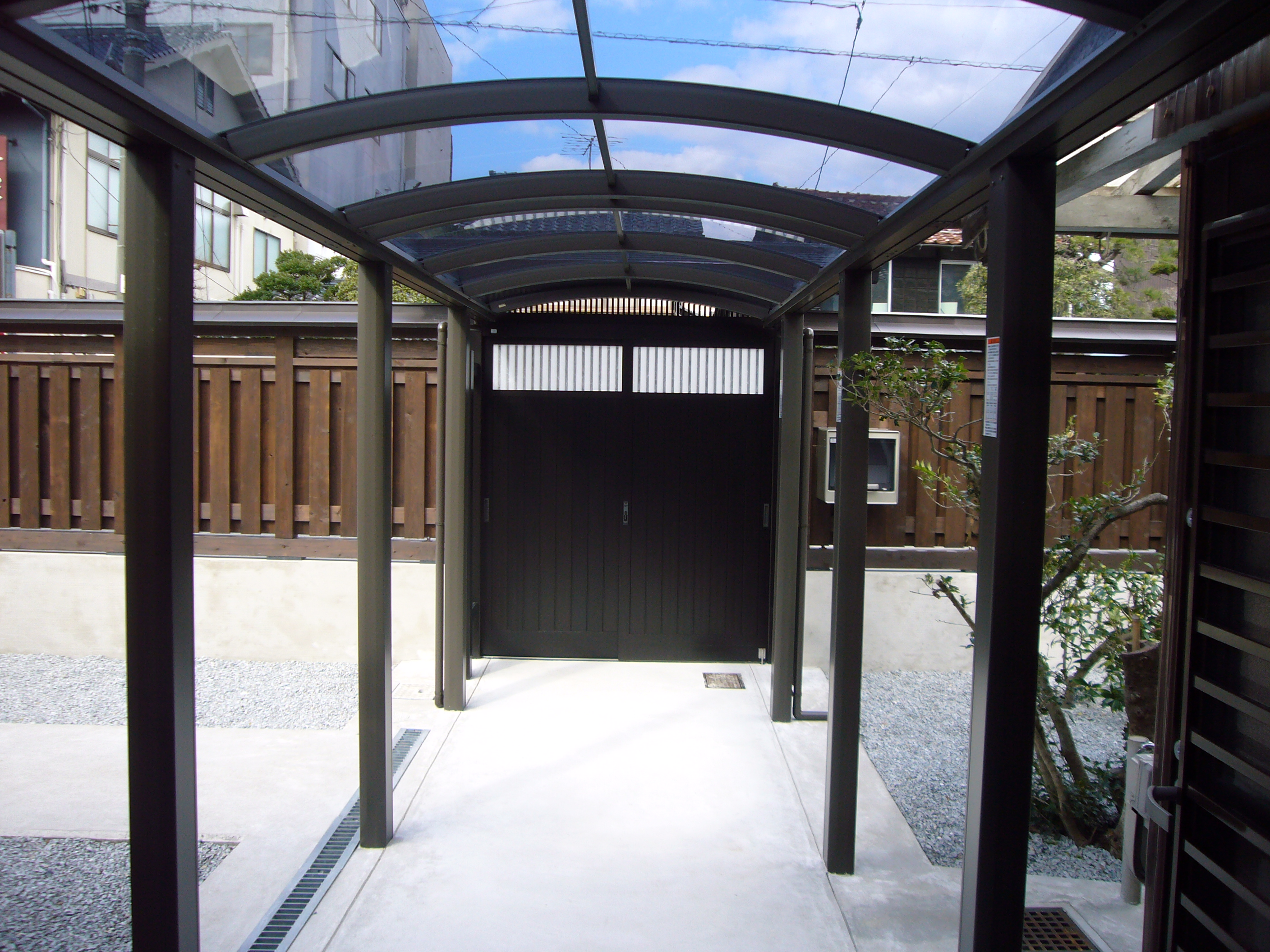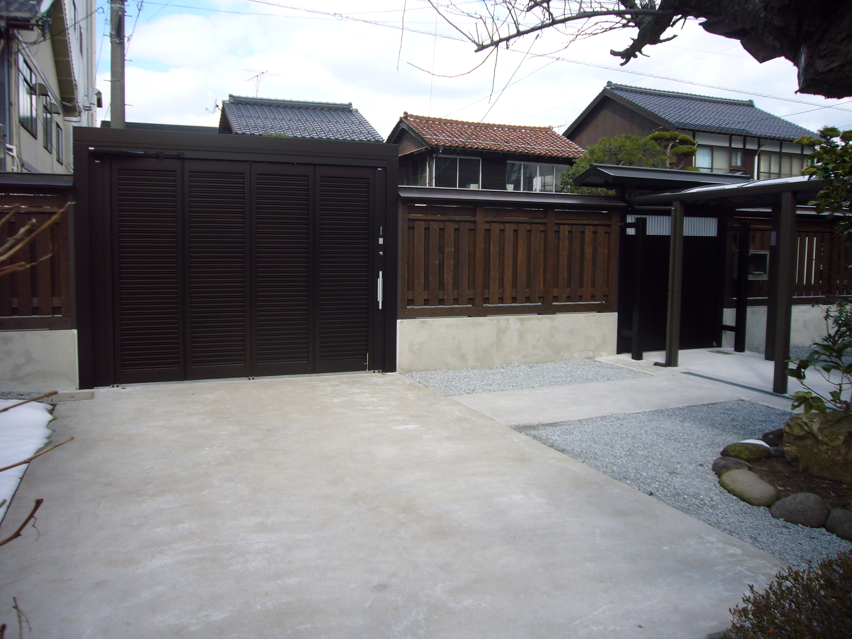 古い木製の塀と門を撤去し車が入れて玄関まで段差のない動線を確保し、庭内に砂利石を敷き詰め雑草が生えないようにしました。