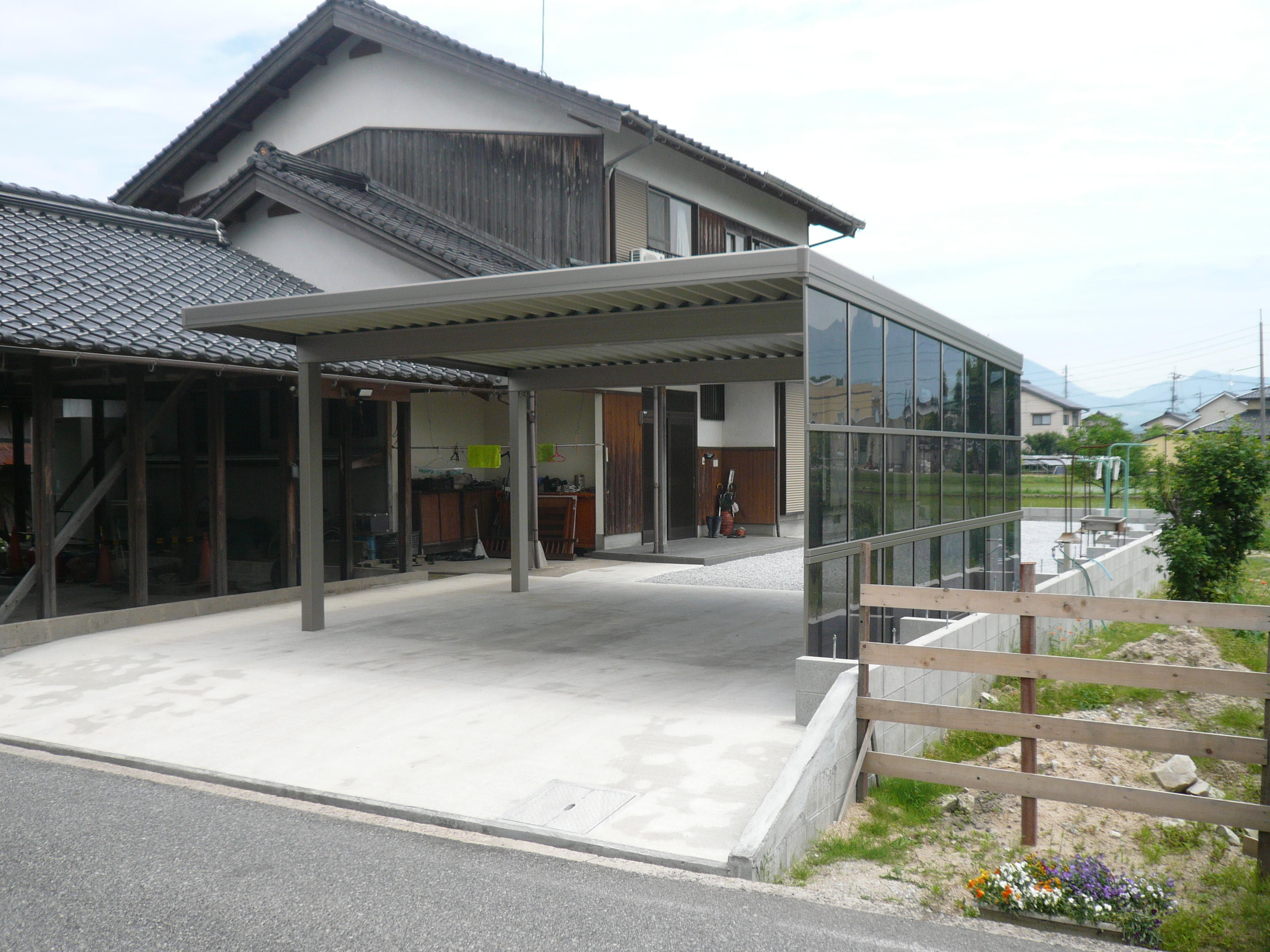 ご家族の車が増えて、玄関アプローチにカーポートを新設されました。豪雪地域にも対応する、LIXIL折板カーポート「テリオスポートⅢ」の積雪100㎝対応型の2台用で、西側からの風が強く、雨が吹き込むのでオプションのサイドパネルを3段付けて防ぐようにしました。