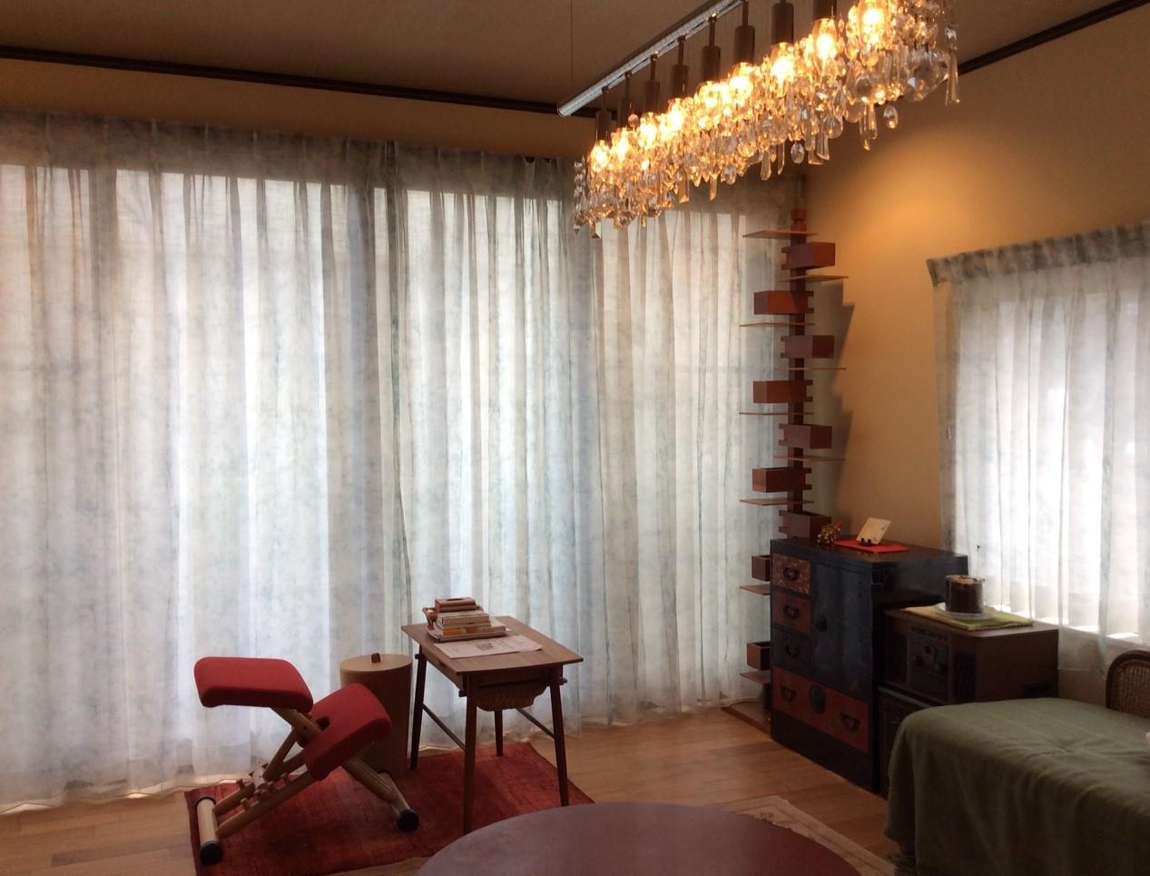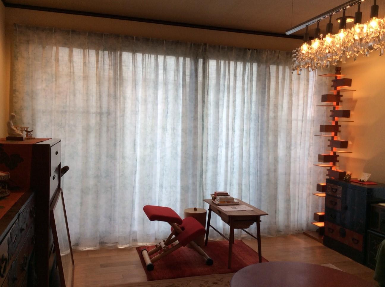 先日、カーテンの模様替えのお仕事をいただきお客様のお宅へ納品に伺いました。アクタスのオリジナルカーテン ファブリシアからお選びいただきました。こちらの生地は『HERBE(エルブ) のブルーミント』デジタルプリントでデザインされた淡いグリーンのグラデーションのレース生地です。2窓ともそれぞれレース生地を2枚吊しています。お客様の好みで厚手のドレープ生地は付けず、軽やかさを演出。お庭側へは目隠し度高めの白のレースを、薄地のこのグリーンのレースをお部屋側に架けています。美しく軟らかな布をまとった心地よいお部屋になりました。お客様のこだわりの家具コレクショや照明ととてもマッチしていました。お部屋のコーナーにはなんとタリアセンのフロアスタンド!弊社で以前ご購入いただいたヴァリエールのバランスチェアーやギャベもあります。このお部屋のテーマカラーは『緑』と『赤』にきめているとのことでした。無垢の床材、珪藻土の壁の内装に、窓面をこのエルブの生地で仕上げればまるで森の中で過ごしているかのような和みの空間に仕上がりました。私、納品作業をしながらこの空間づくりのセンスに感動させられたのでした。お店で数あるサンプルの中から、この生地を直感で選びだされたお客様の感性に。素敵なインテリアを魅せていただきありがとうございました。