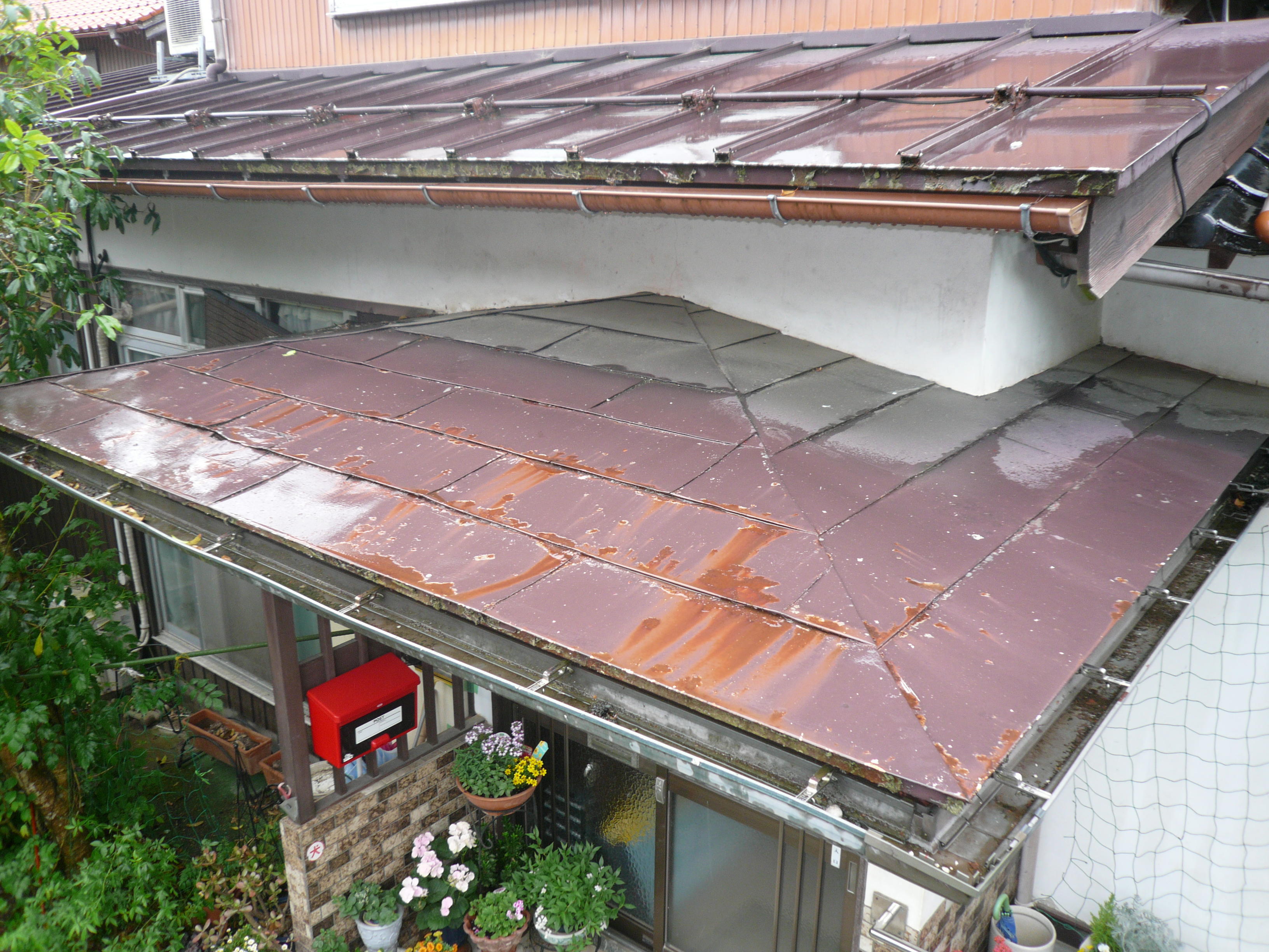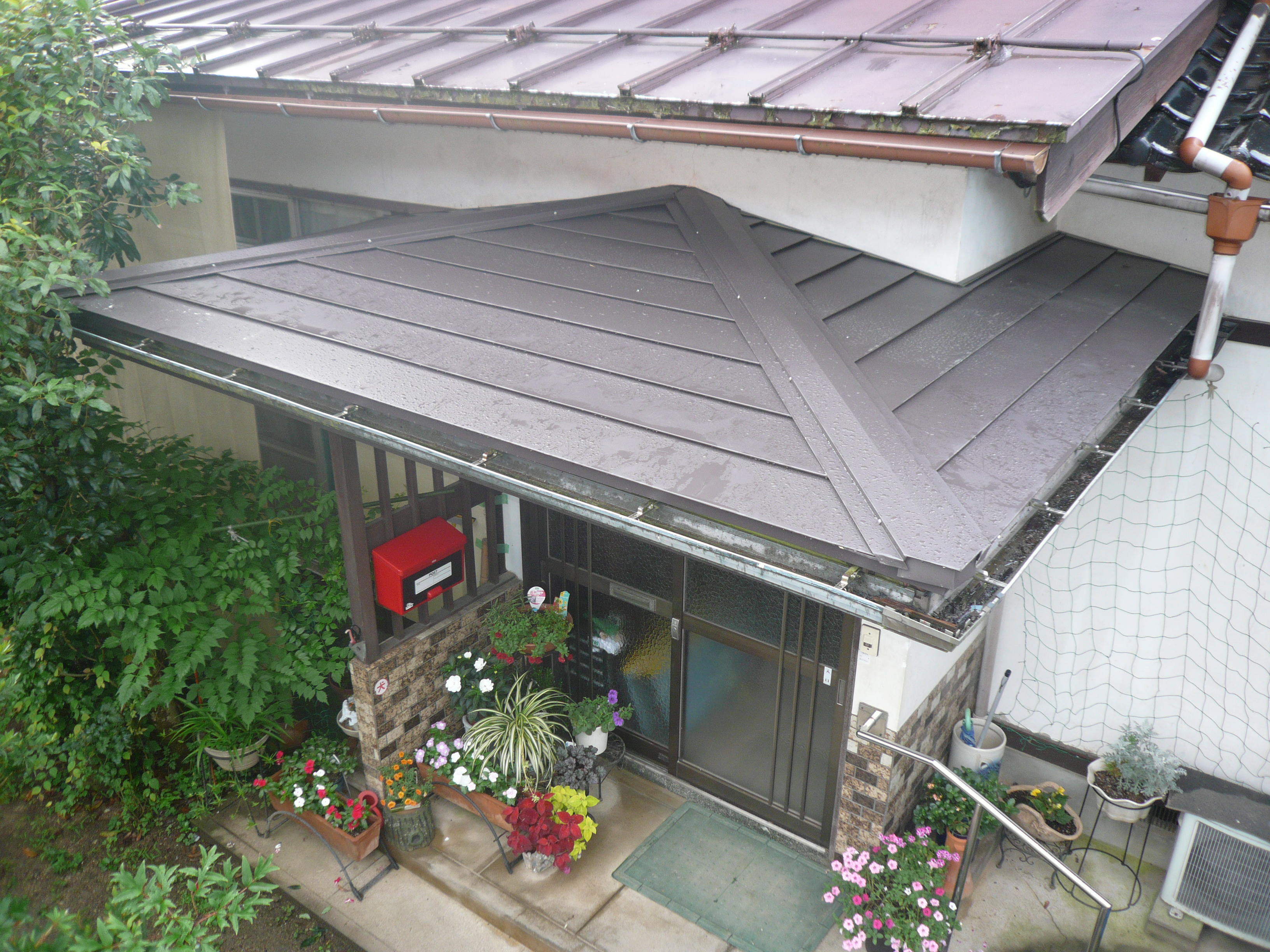 穴が開いて雨漏りしていた玄関屋根を、GL鋼板材で葺き替えました。