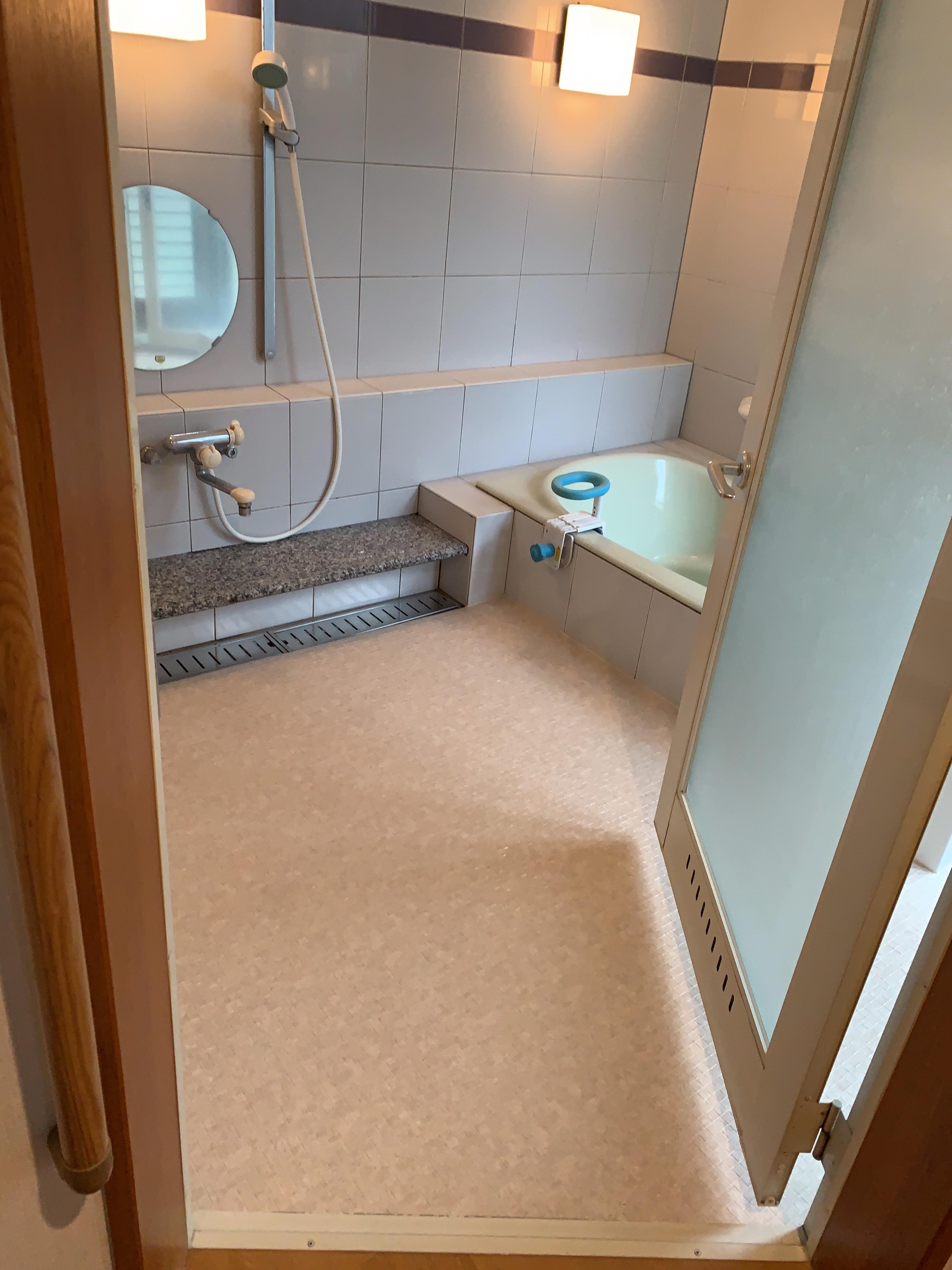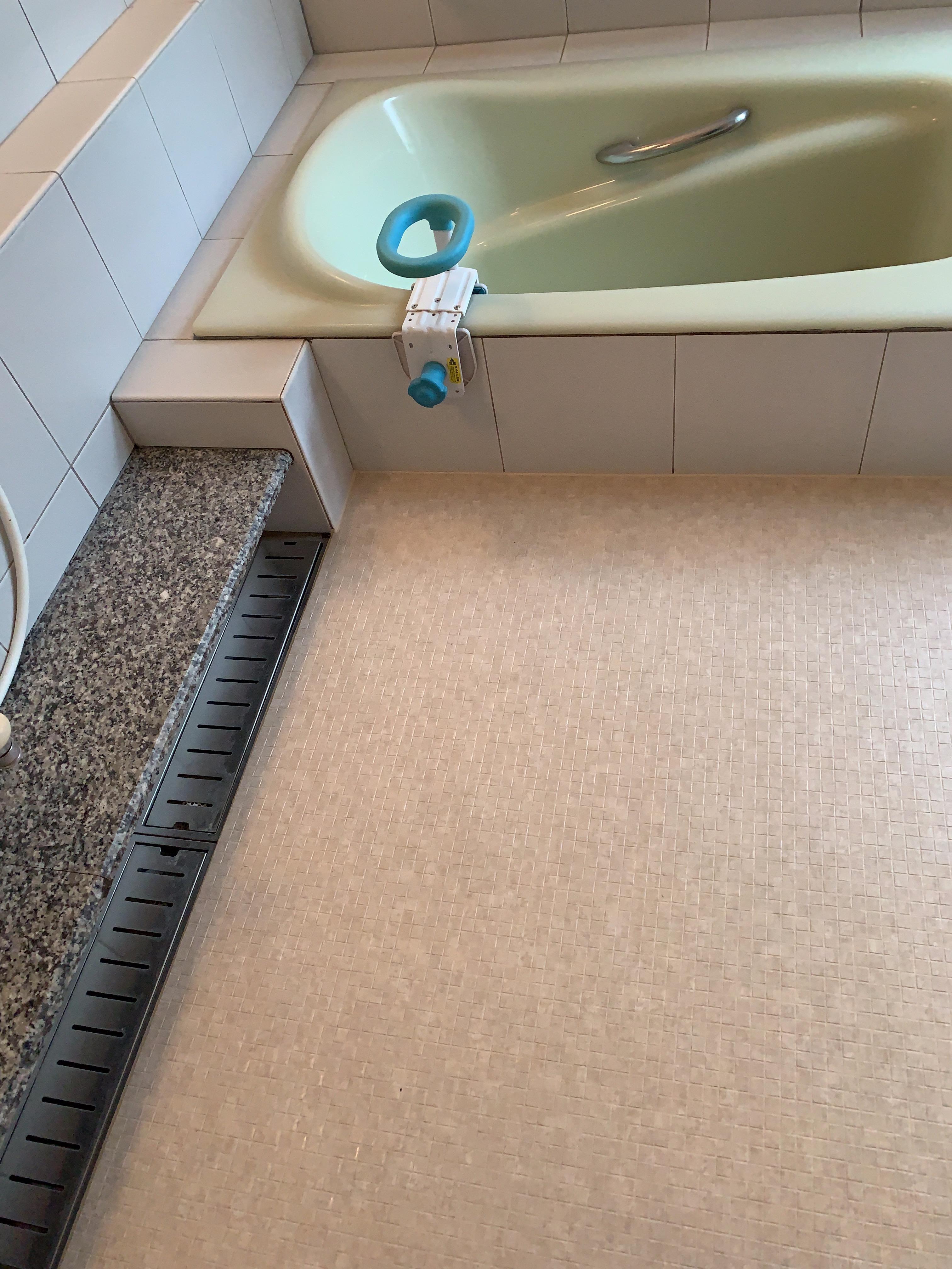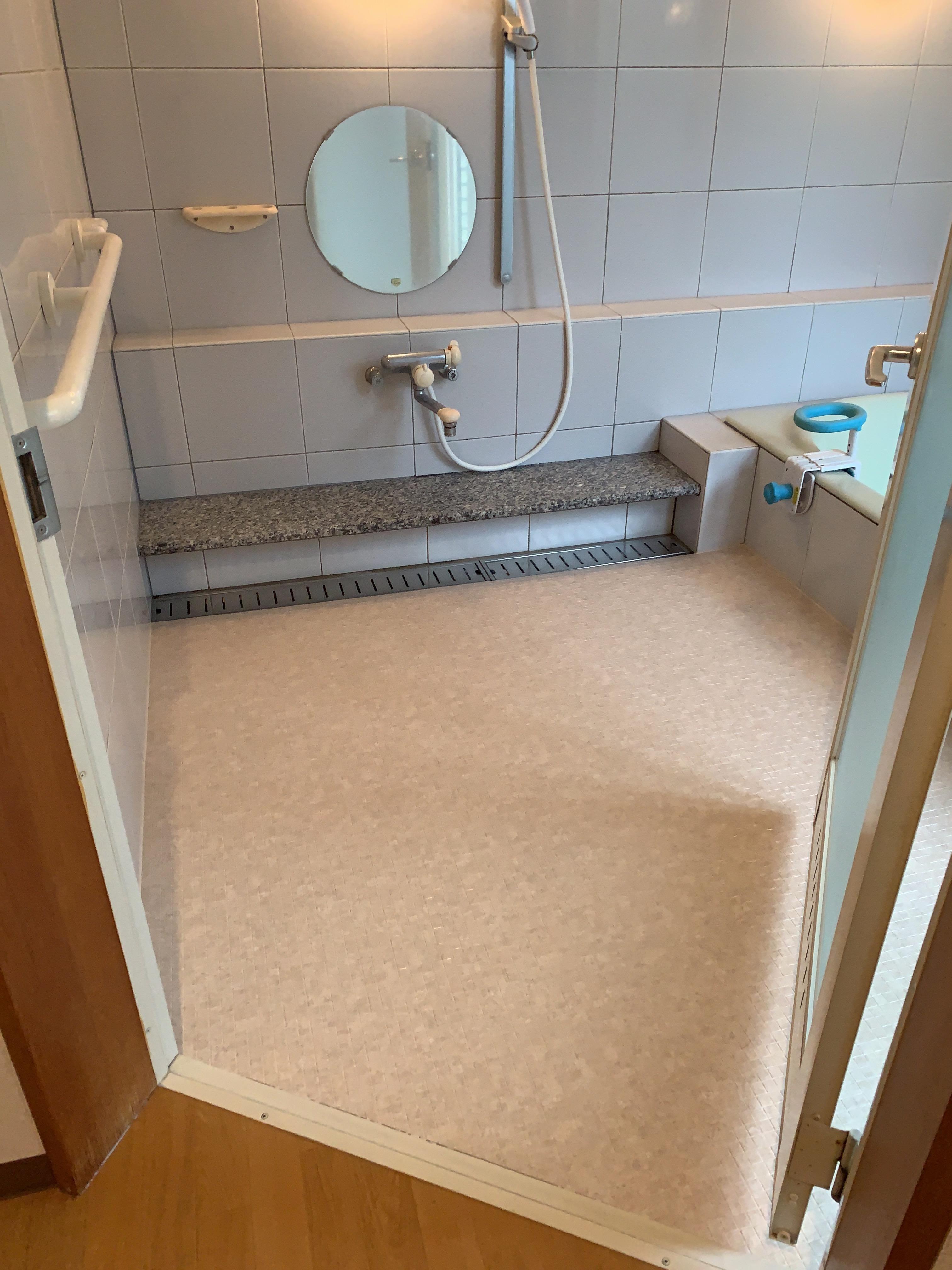 タイルの床が冷たいとコルクシートを洗い場に置かれていたK様。反ってきて縁が引っかかるので、良いものはないかとご相談があり、福祉施設などでも使われている浴室用のビニル床シートを施工しました。