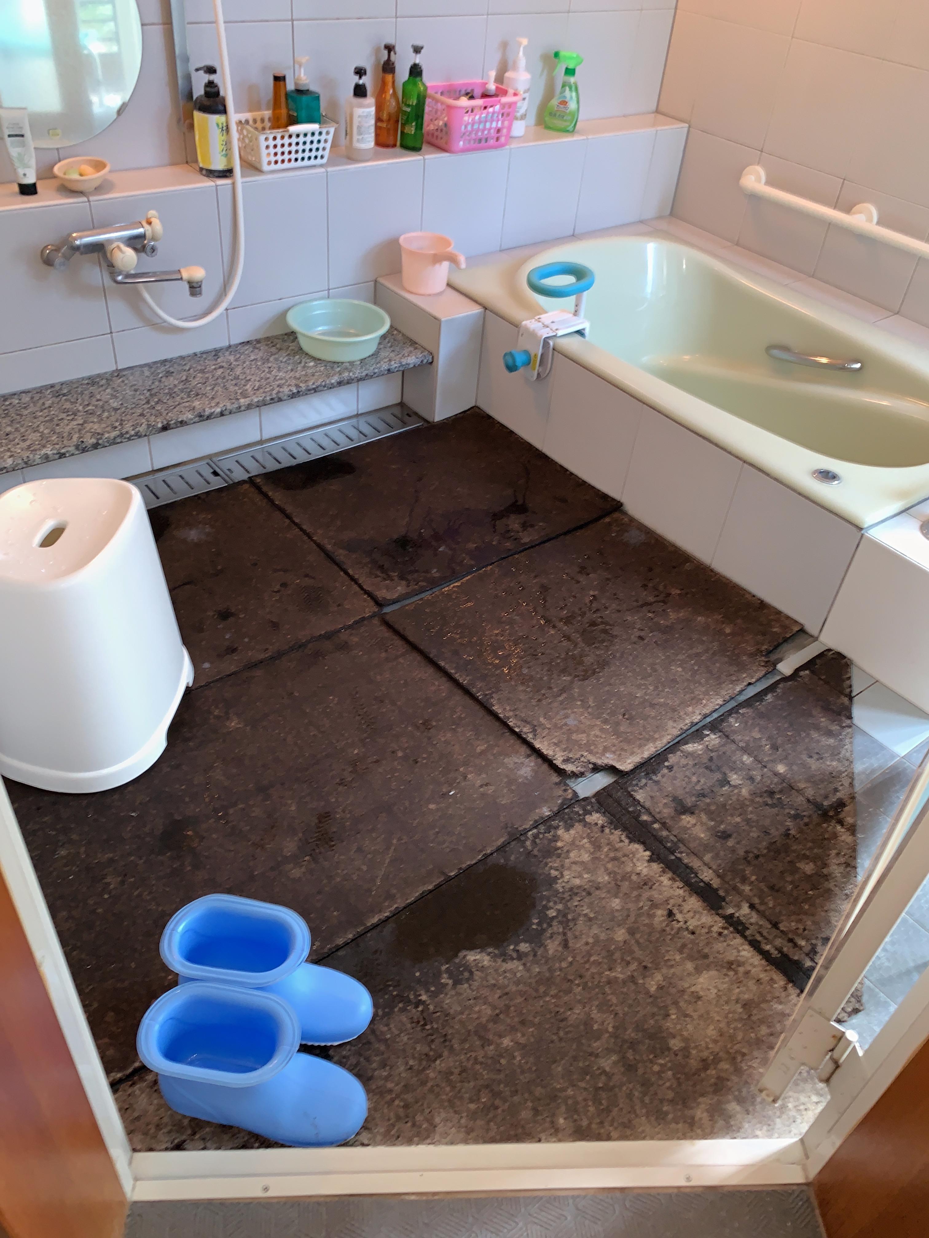 ご両親がお年を召しておられるので、転ぶことを警戒され、滑りにくいコルクシートを洗い場のタイルの上に敷かれていました。 濡れた状態が続くので、ぬめりが出てきたうえ、反ってきたので、ユニットバスのような床にならないかとご相談がありました。 浴室の床用の長尺シートをおすすめして、現在のタイルの床の上から施工しました。