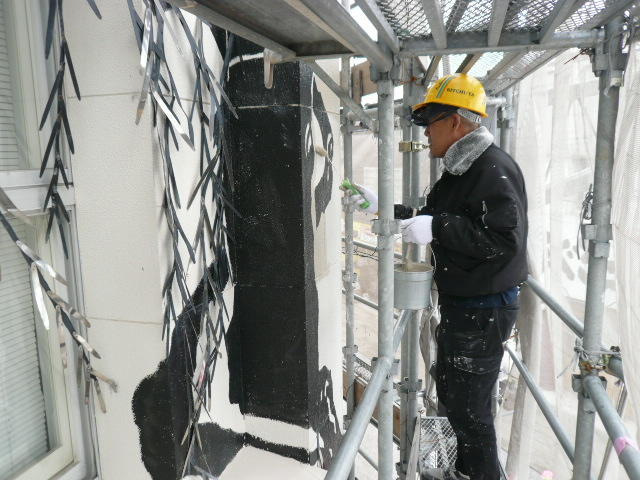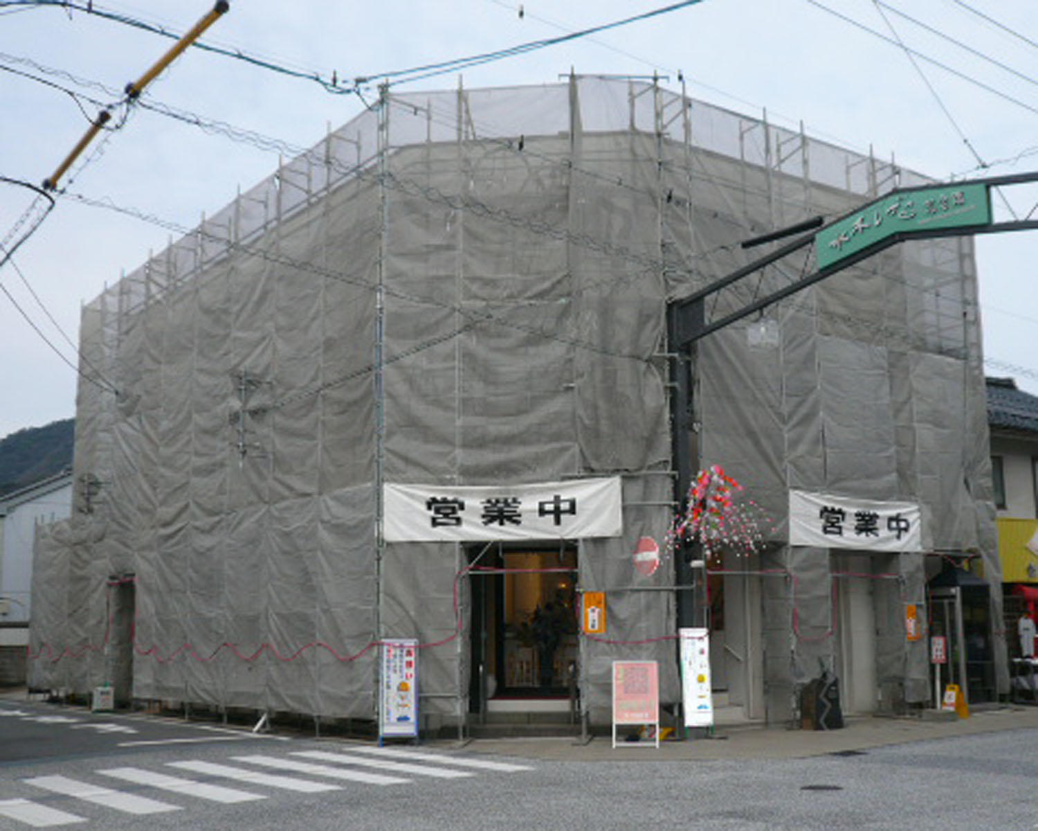 水木しげるロードに建つお菓子屋さんの改修で、街並み環境整備事業として、昭和20年代のイメージで外壁を塗装しました。当初、正面を残して2面を土蔵風にする提案もありましたが、レトロな石造りのイメージを再現した現在の形になりました。
