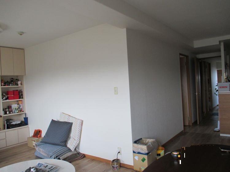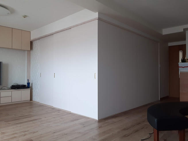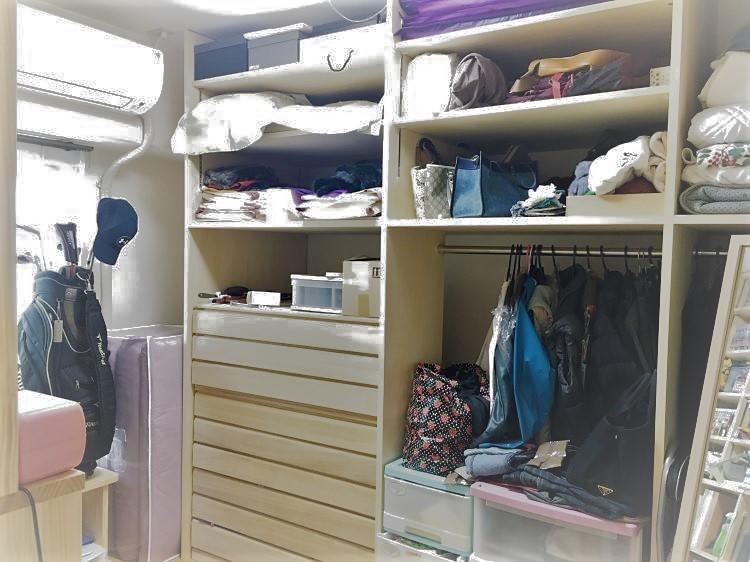 洋室をクロークルームにリフォームしました。壁いっぱいに棚を組み付け手持ちの桐タンスを収められるよう設計しています。向かいの棚は奥行浅めに書籍専用サイズの棚も造作しました。収納部屋をつくることでLDKや寝室もスッキリ片付きます。