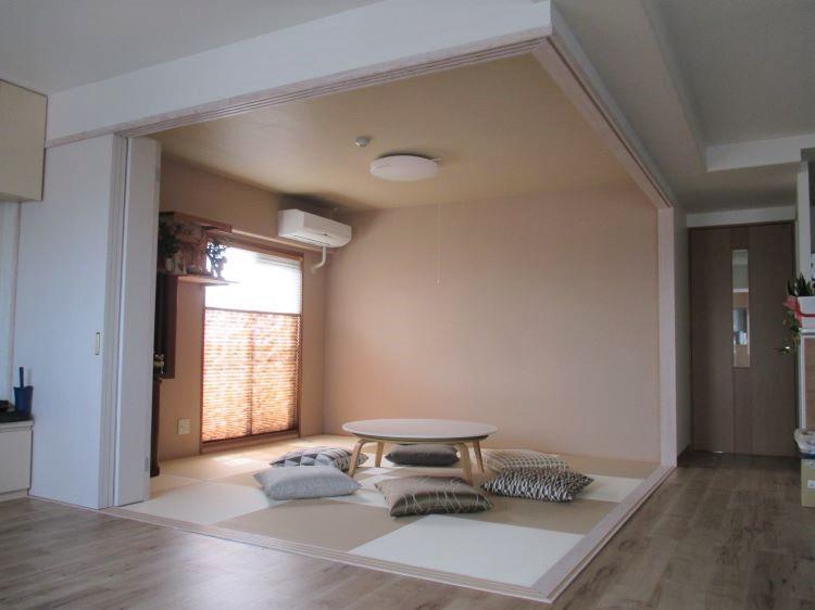 LDK隣接の洋室の壁を取り除き、和室にリフォームしました。お客様の一番のご要望は【シーン1:日常はLDKと一体感あるオープンな畳コーナー】と、【シーン2:LDKの間仕切りに建具をはめ込めば独立した個室に】2ウェイに対応できる和室にすることでした。ブラウンを挿し色に壁紙やプリーツスクリーン、座布団の小物に至るまでご依頼いただきました。普段は開け放していますが、LDKに接する2方向に建具をはめ込めば、プライベートな小部屋に早変わり。お泊まりでのお客様にも対応できます。