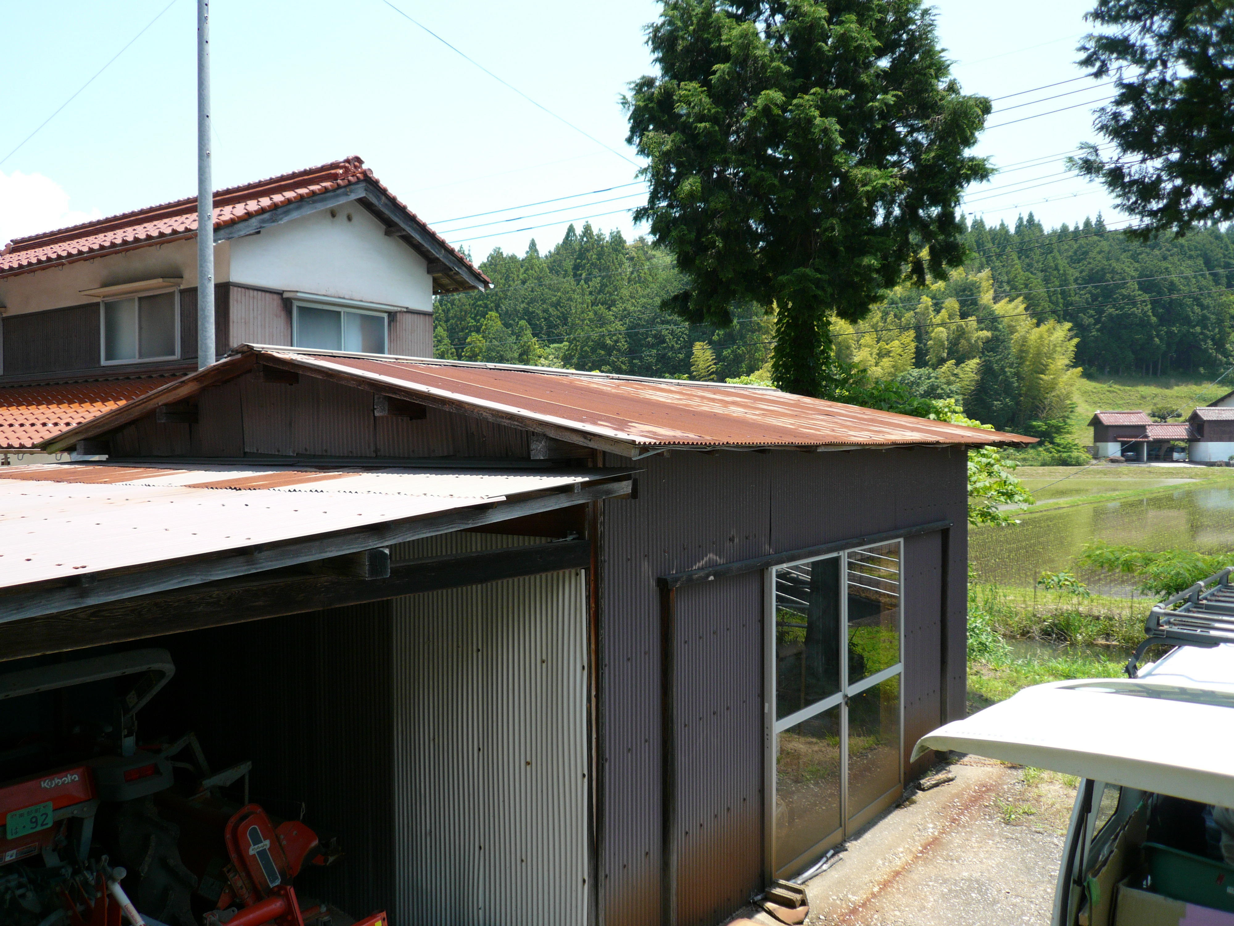 木が大きくなり、落ち葉も多く台風等の災害で倒木の恐れもあったため木の伐採を依頼されました。 農舎屋根は錆び、結露により下地も傷んでいたので防湿シートを貼り、波板を貼り替えました。