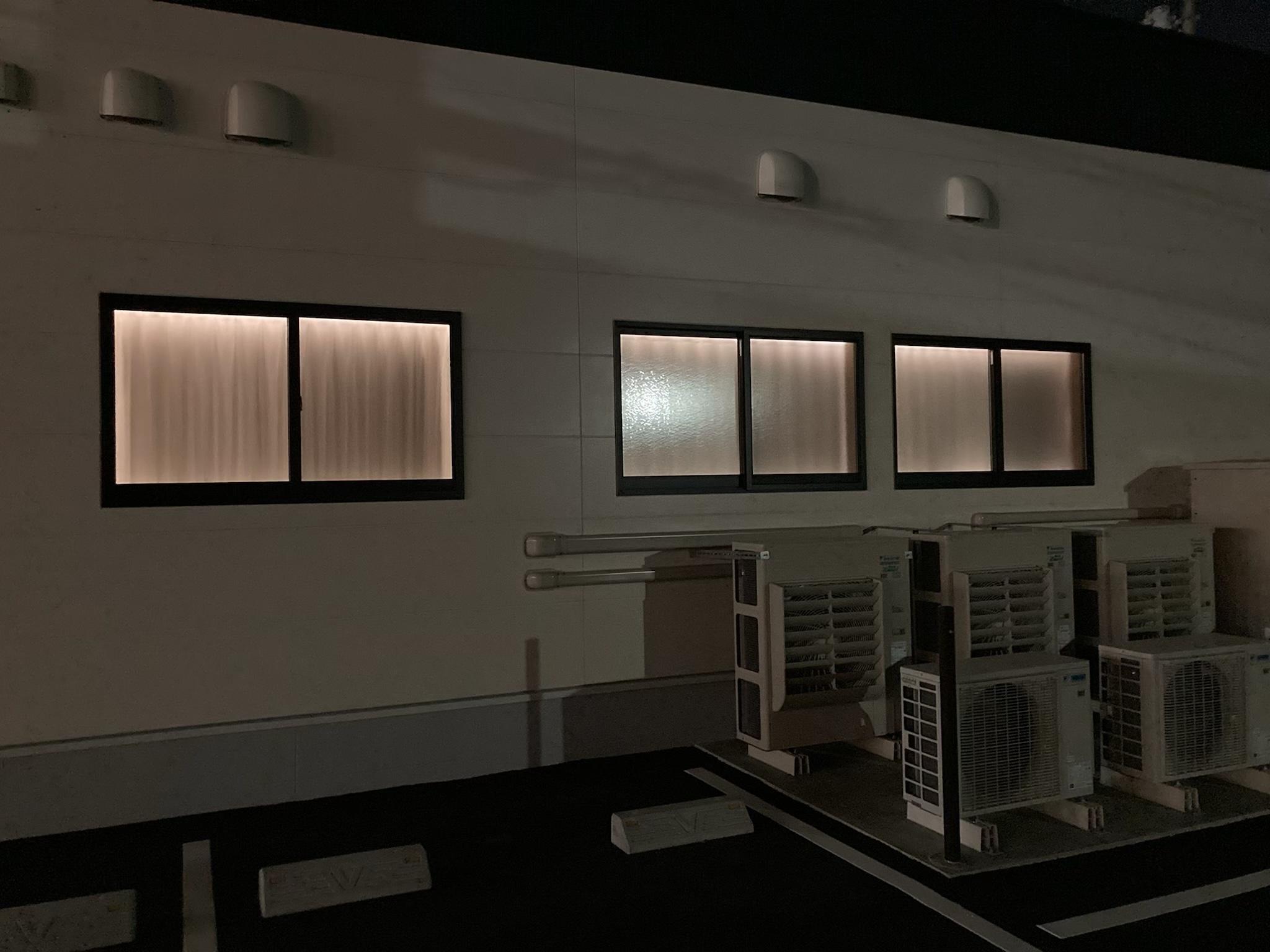 近隣住民への光漏れの配慮のため既存のカーテンに加え、 ガイドレール付きのロールスクリーンを追加で設置しました。