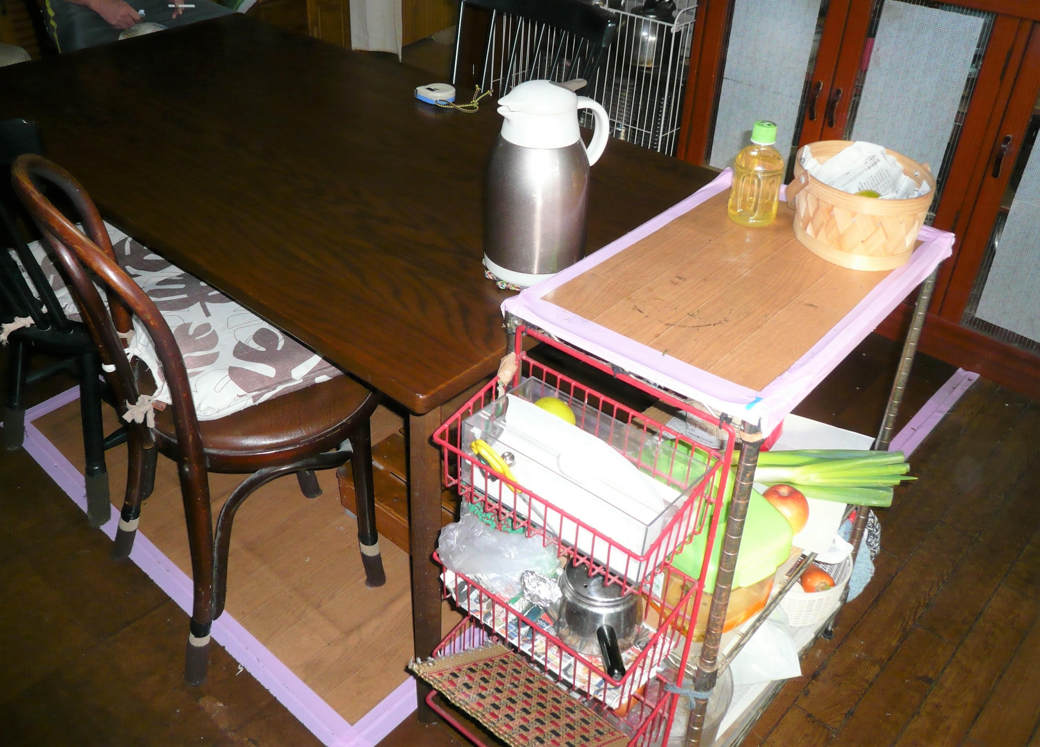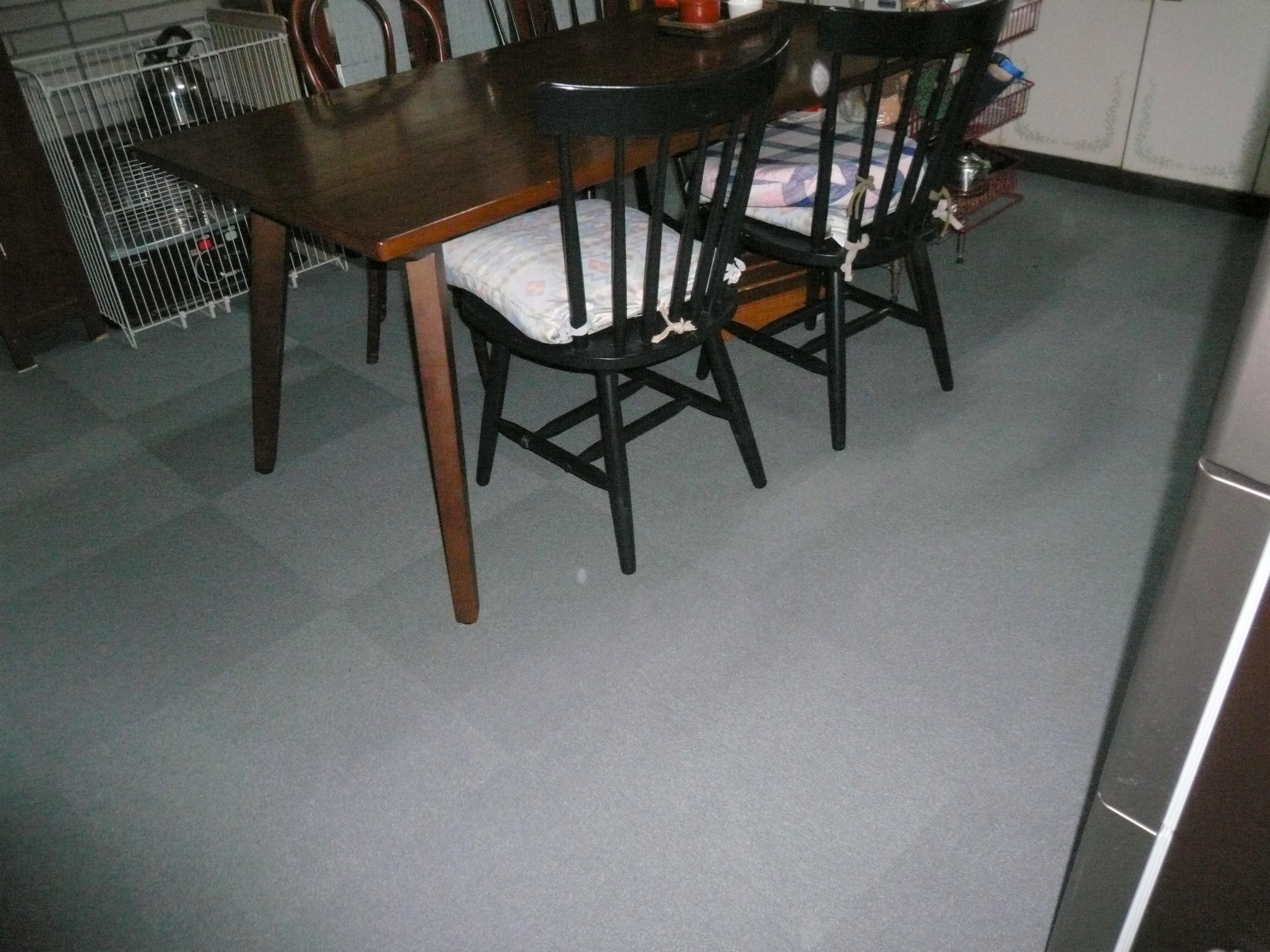 ダイニングキッチンの床改修工事をしました。 床のだわつきがあり、改修したあとフロア全体にタイルカーペットを敷き詰めました。 もし、汚れてもその部分だけ取り外して洗濯でき清潔に保てます。 生後6か月のお孫さんにとっても、冬は暖かく素足で歩けるのでお客様からとてもご満足いただけました。