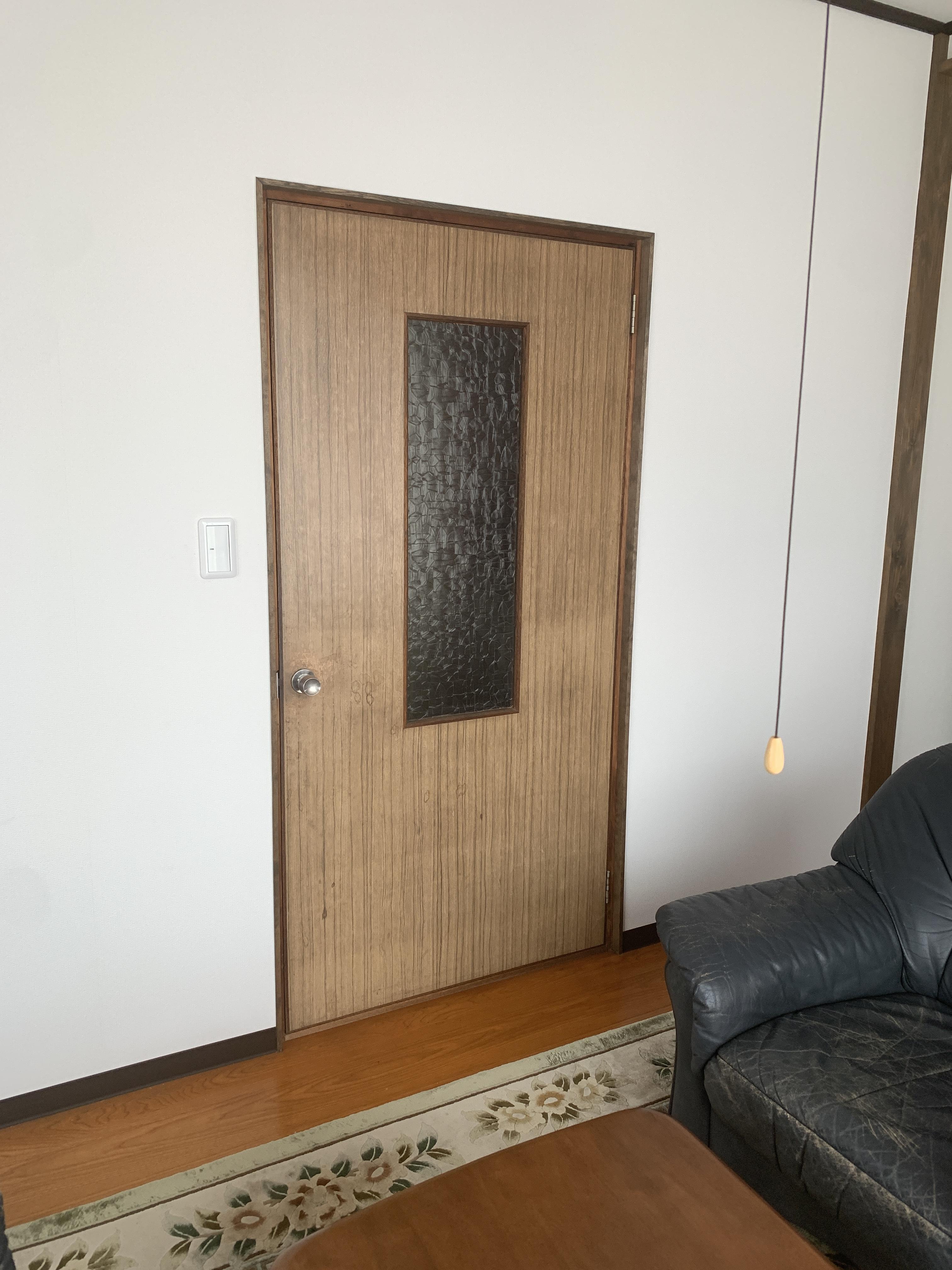 以前、リビングのクロス等のリフォームをされ部屋が綺麗になり、そのままにしていた扉が目立ち気になったので扉も一新したい。また、扉のガラス面が狭く廊下への採光が取れなくて暗いと感じているため、ガラス面を広く取って採光を確保したいとのご要望でした。