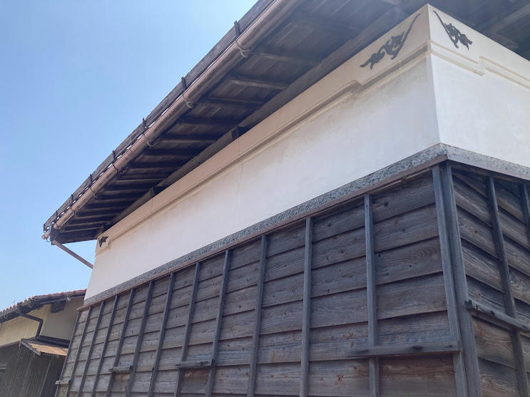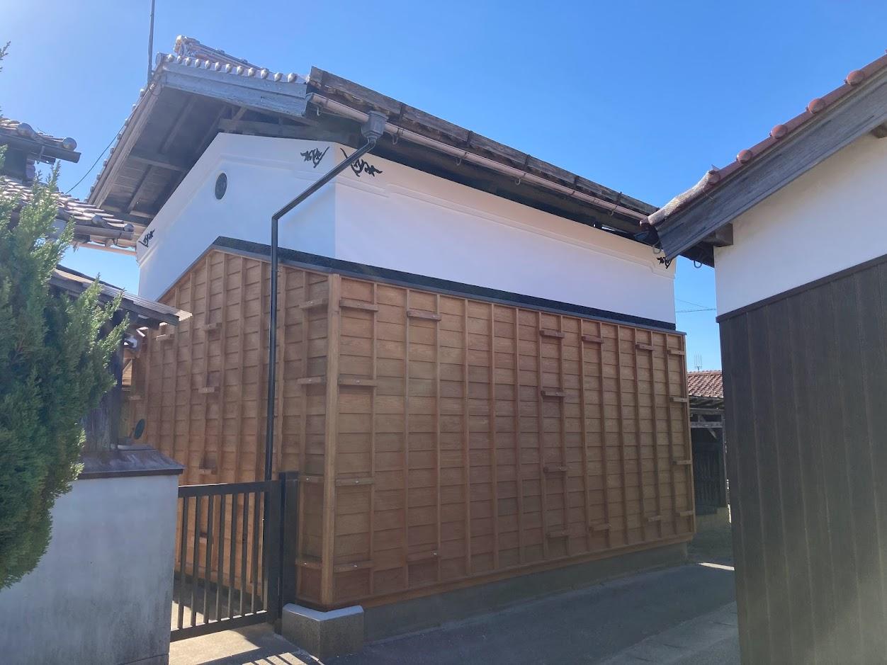 施主様より、40年位過ぎた蔵とつながっている塀の改修工事のご依頼がありました。 【内容】 ①木製簓子(ささらこ)下見板張が劣化してきたので張替えて木材保護塗装を行いました。 ②過去の地震で発生した土壁の割れなどを修復し、漆喰部分の塗料にて塗装を行いました。