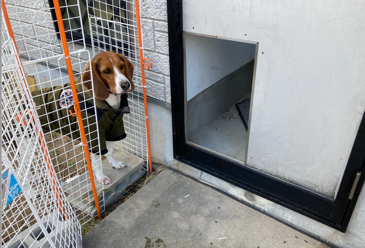 犬のビーグルを飼っている施主様より、庭への出入りが できるようにしたいとのご要望があり、来店されました。 ドアの端へ穴をあけ、自由に庭へ行き来ができるようになりました。また、切りっぱなしだとケガをする恐れがある為、普段はアルミ製の小口カバーを取付けますが、ステンレスに変更し取付けています。 穴が開いている部分は施主様が後で取り付けるとのことであけています。