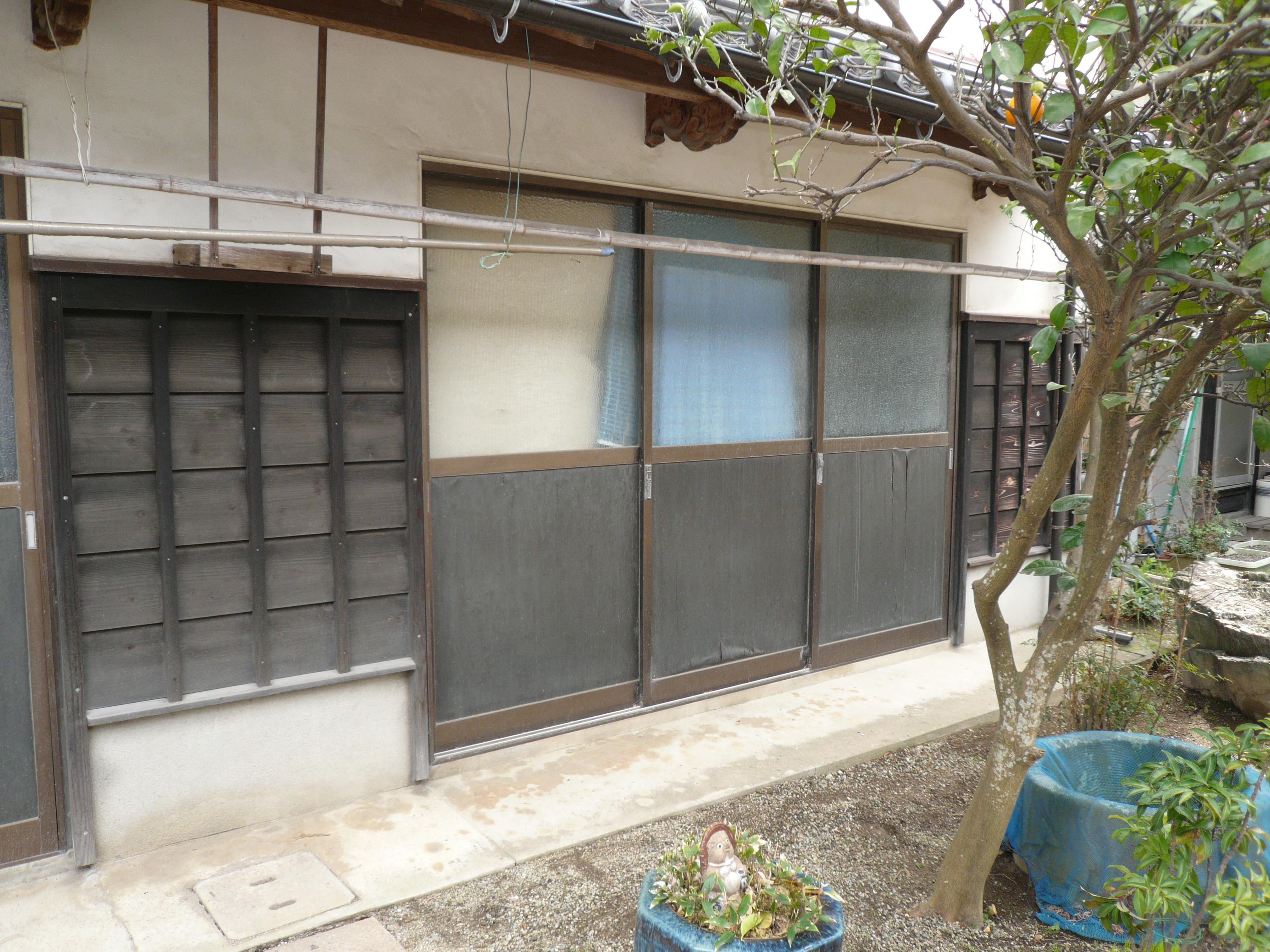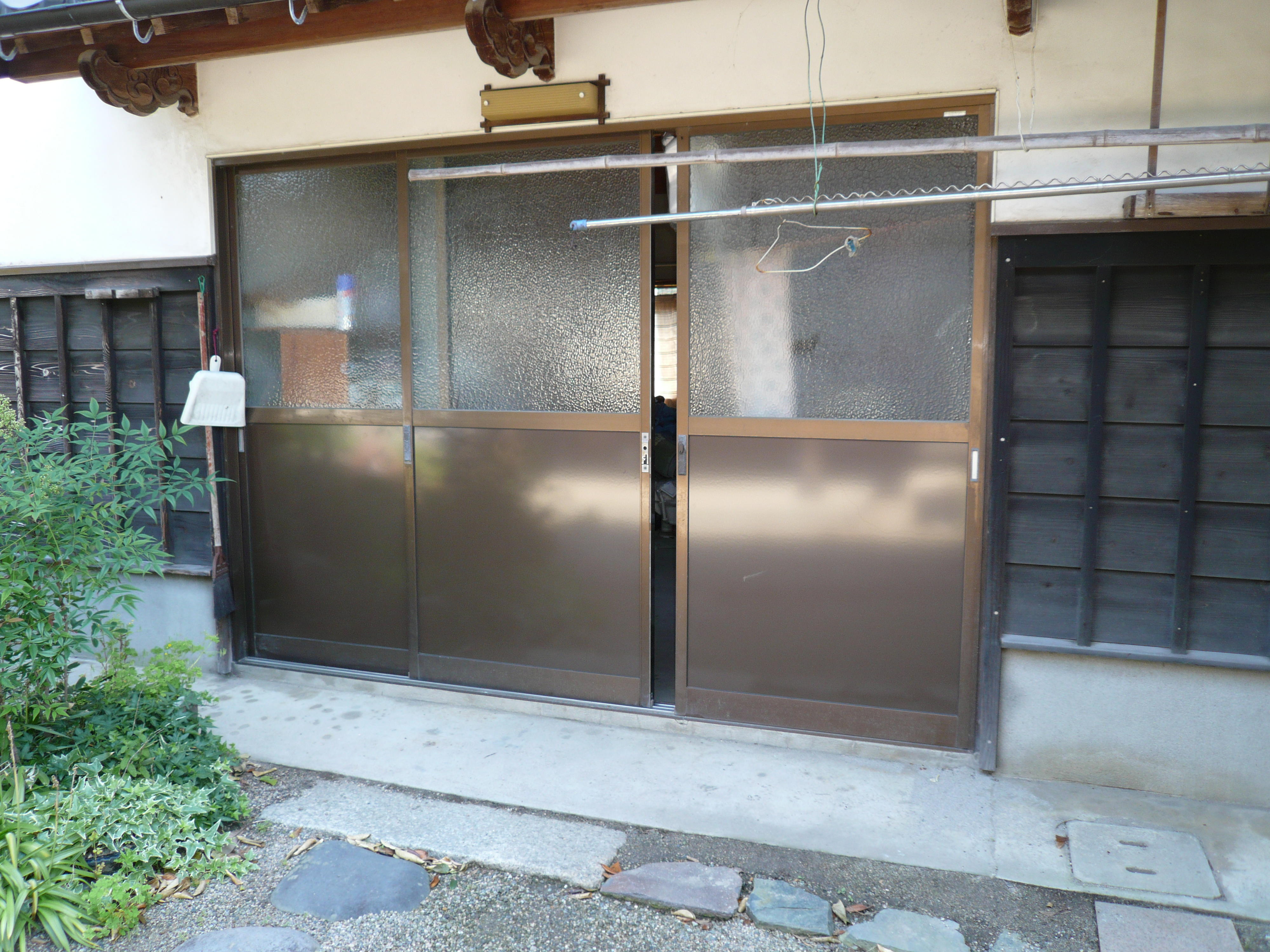 引きちがい扉の腰パネル部分の傷みがひどくなってきた為、取り替えのご依頼がありました。 べニア下地のパネルをアルミパネルに変更しています。