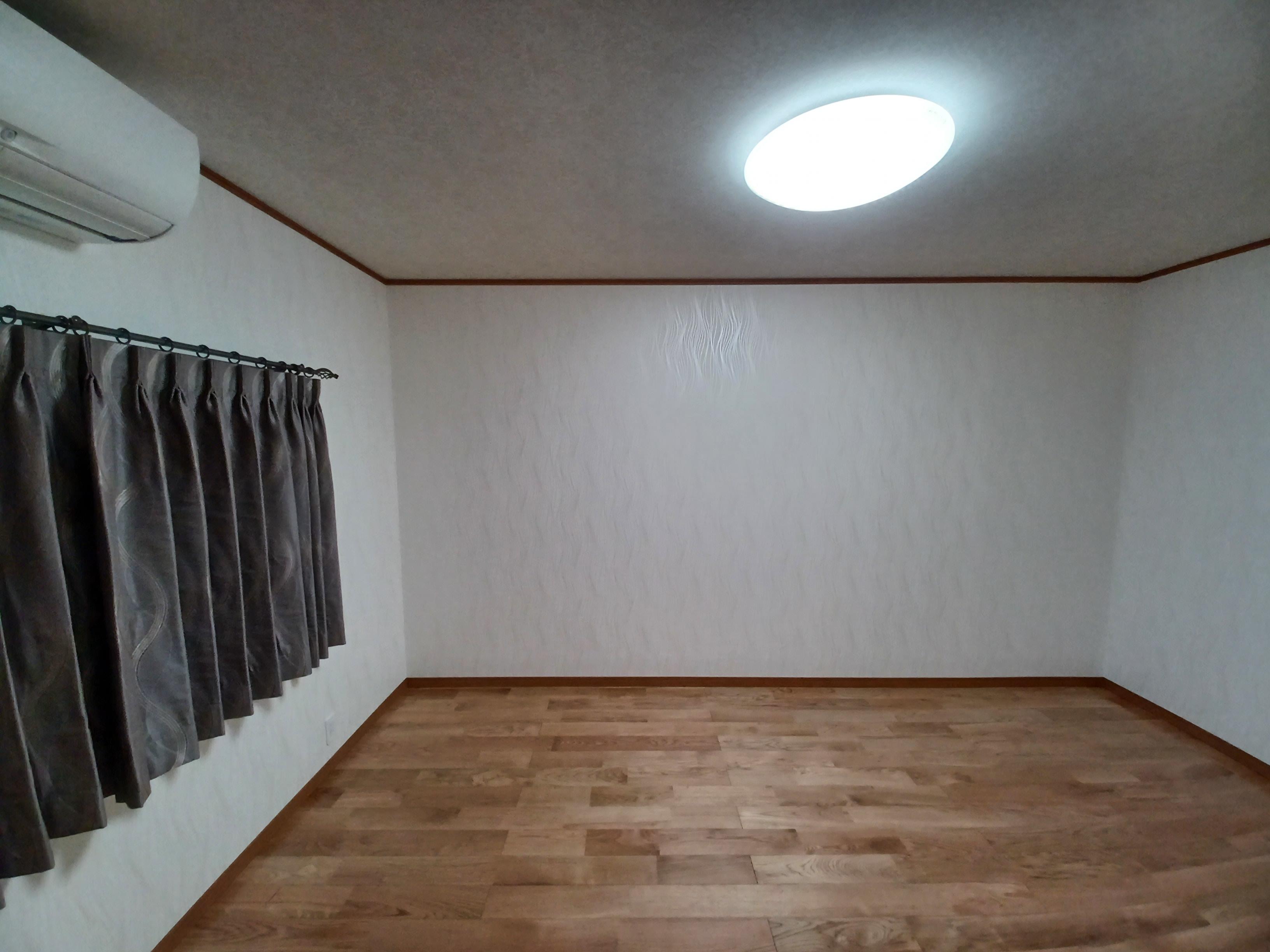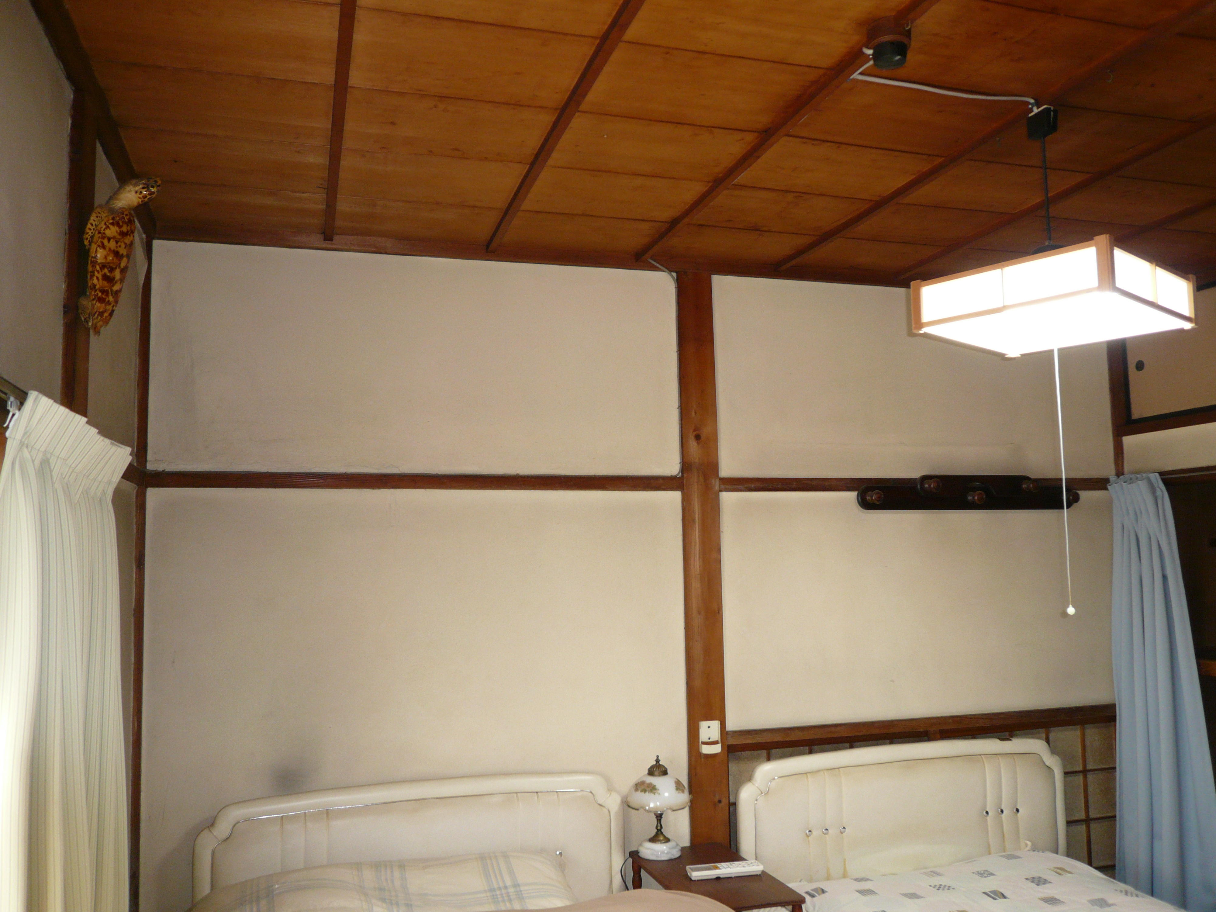 竿縁天井(さおぶちてんじょう)を壊して、新しく天井を作りクロスを貼りました。 また、壁は、漆喰からクロスを貼る為に板を新しく貼りました。