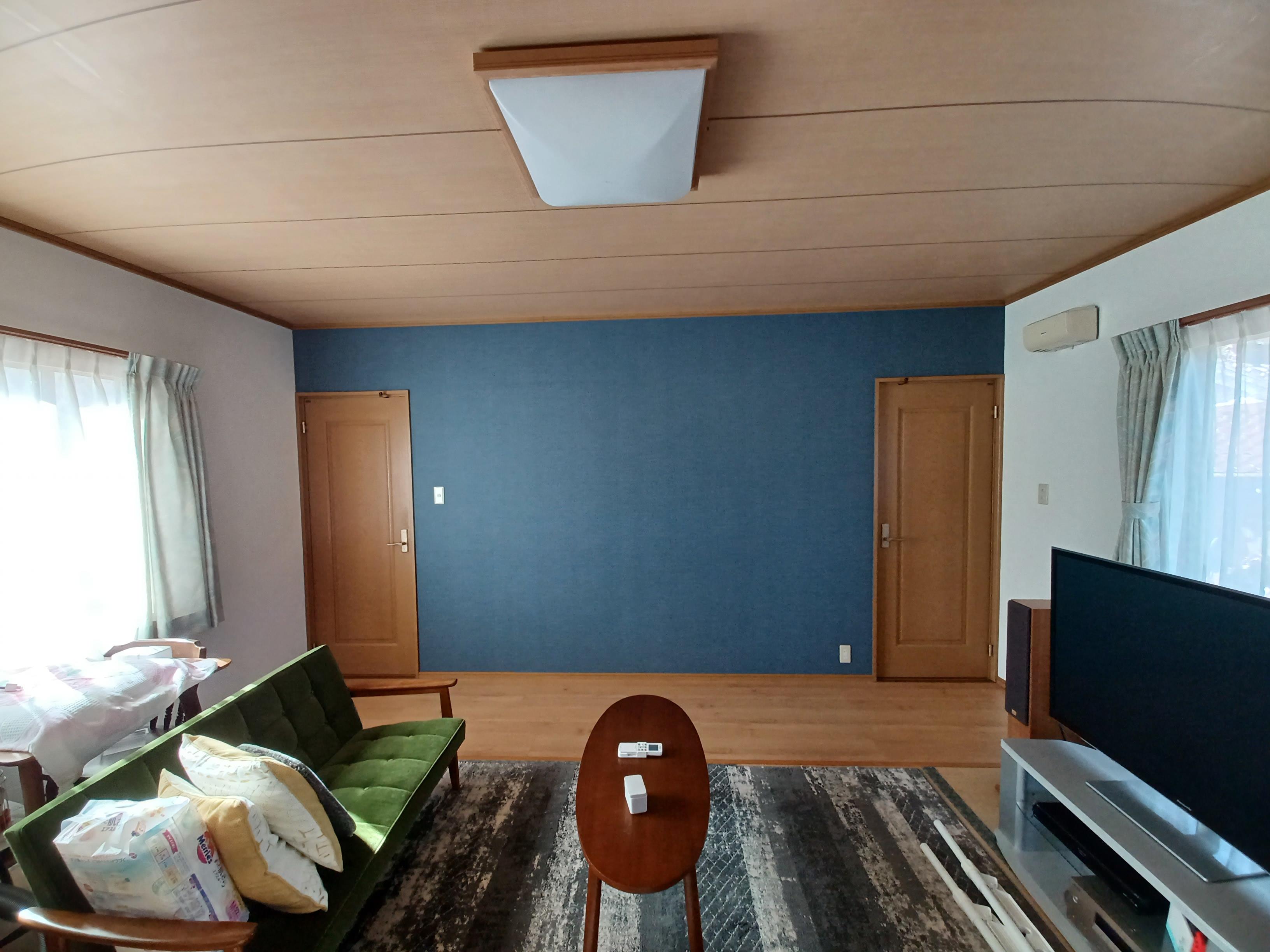 壁面収納が設置される予定の壁面は、紺色のアクセントクロスを貼ることによって、メリハリのある空間に仕上ることができました。