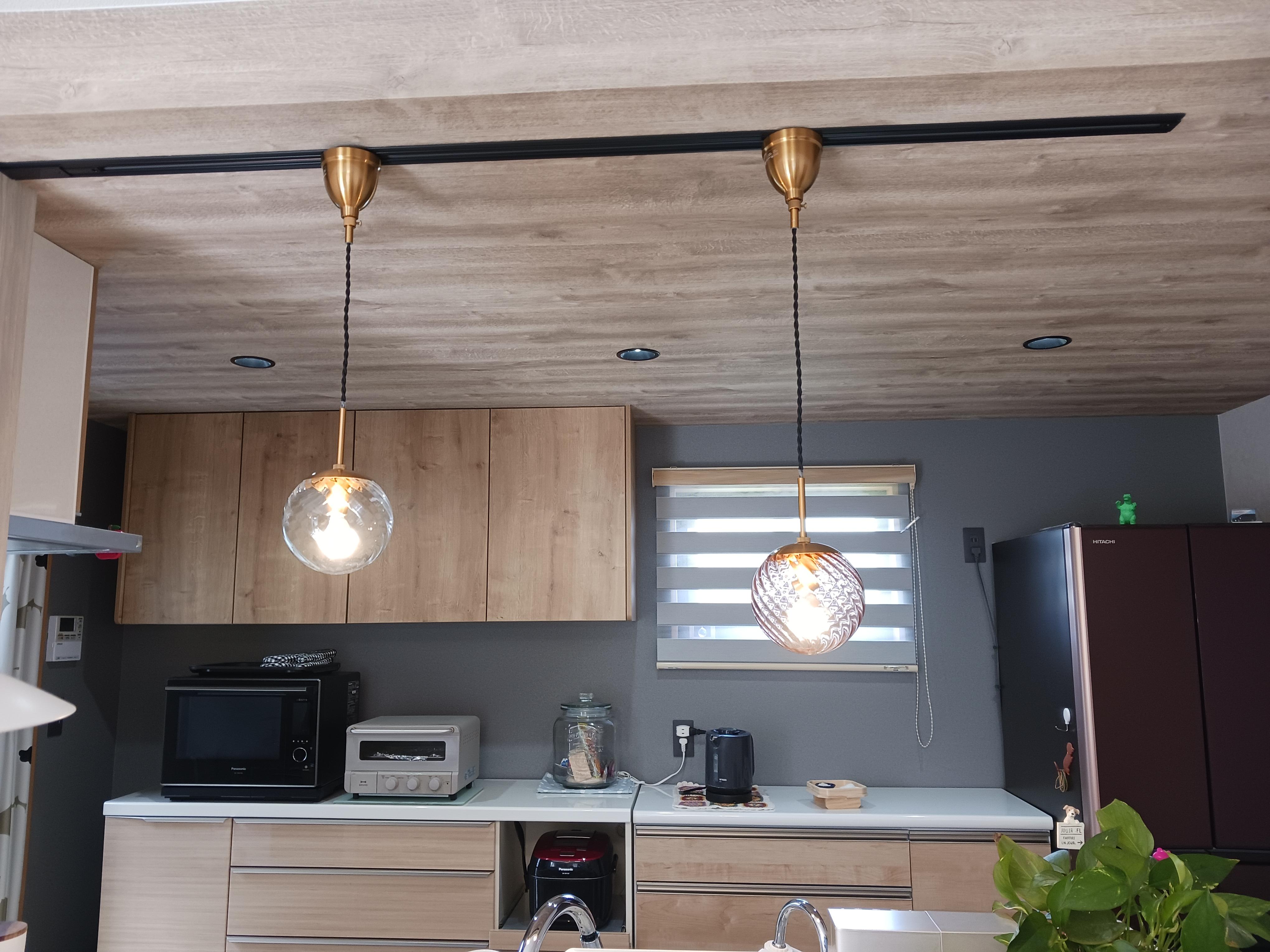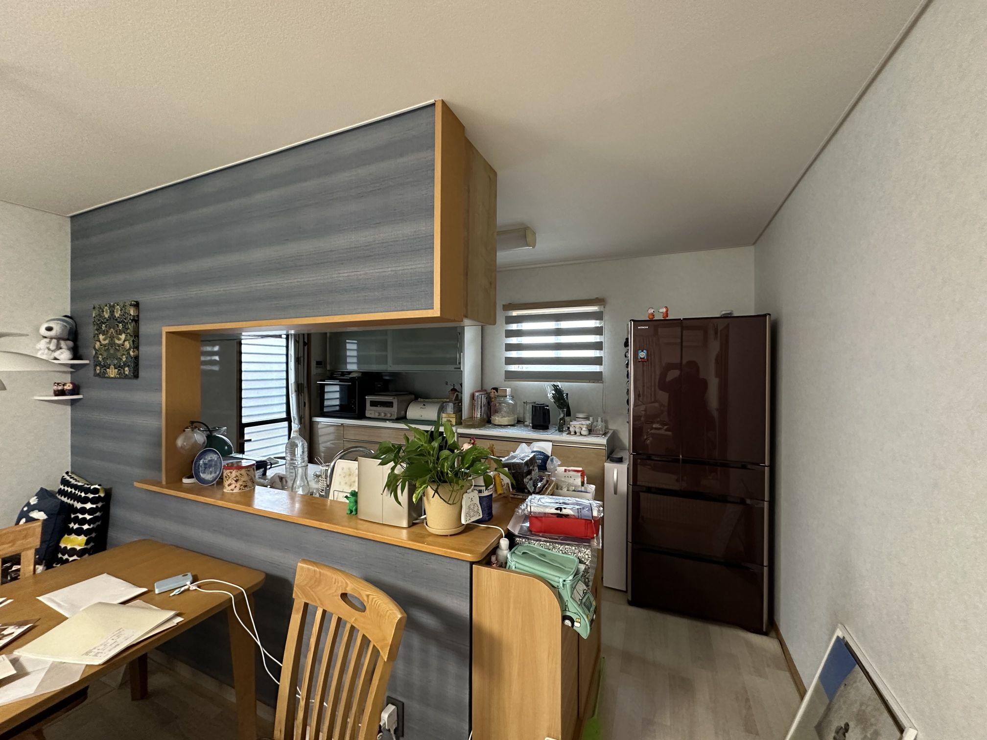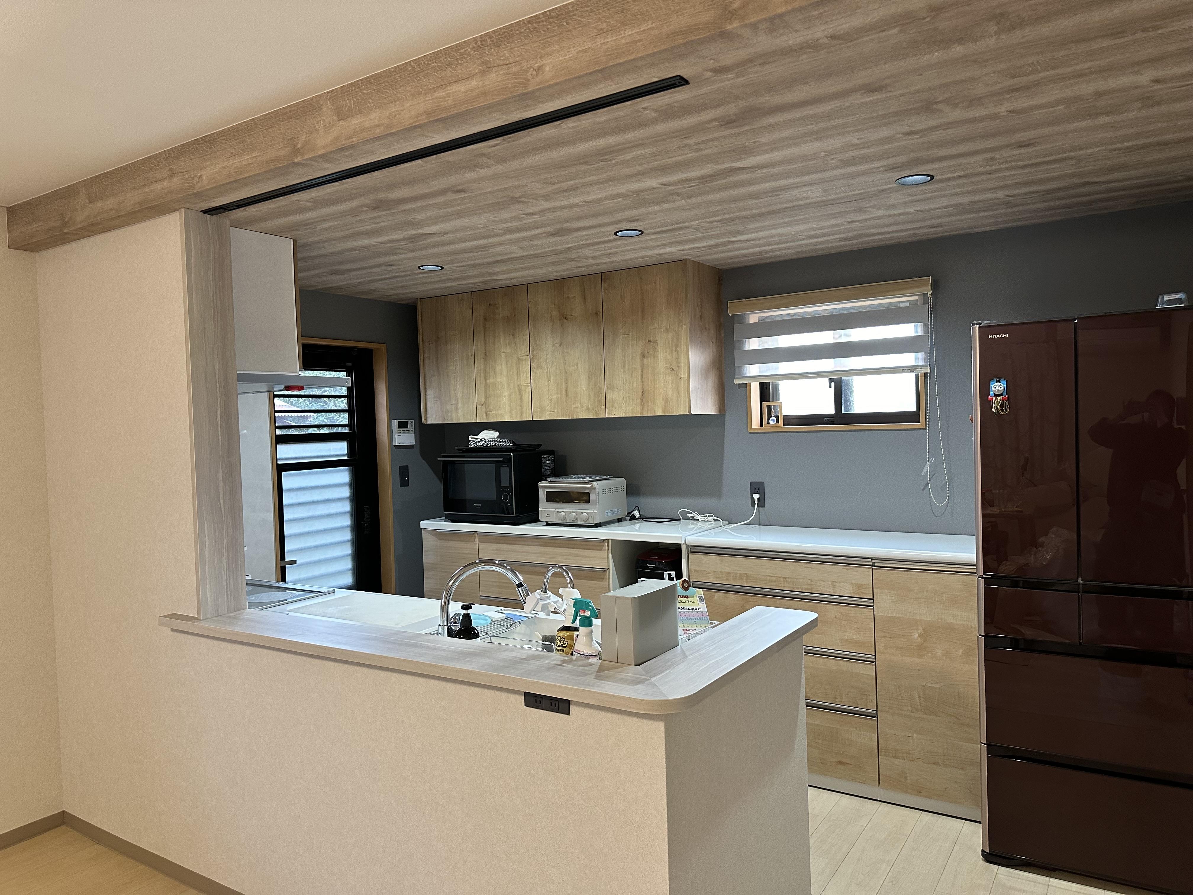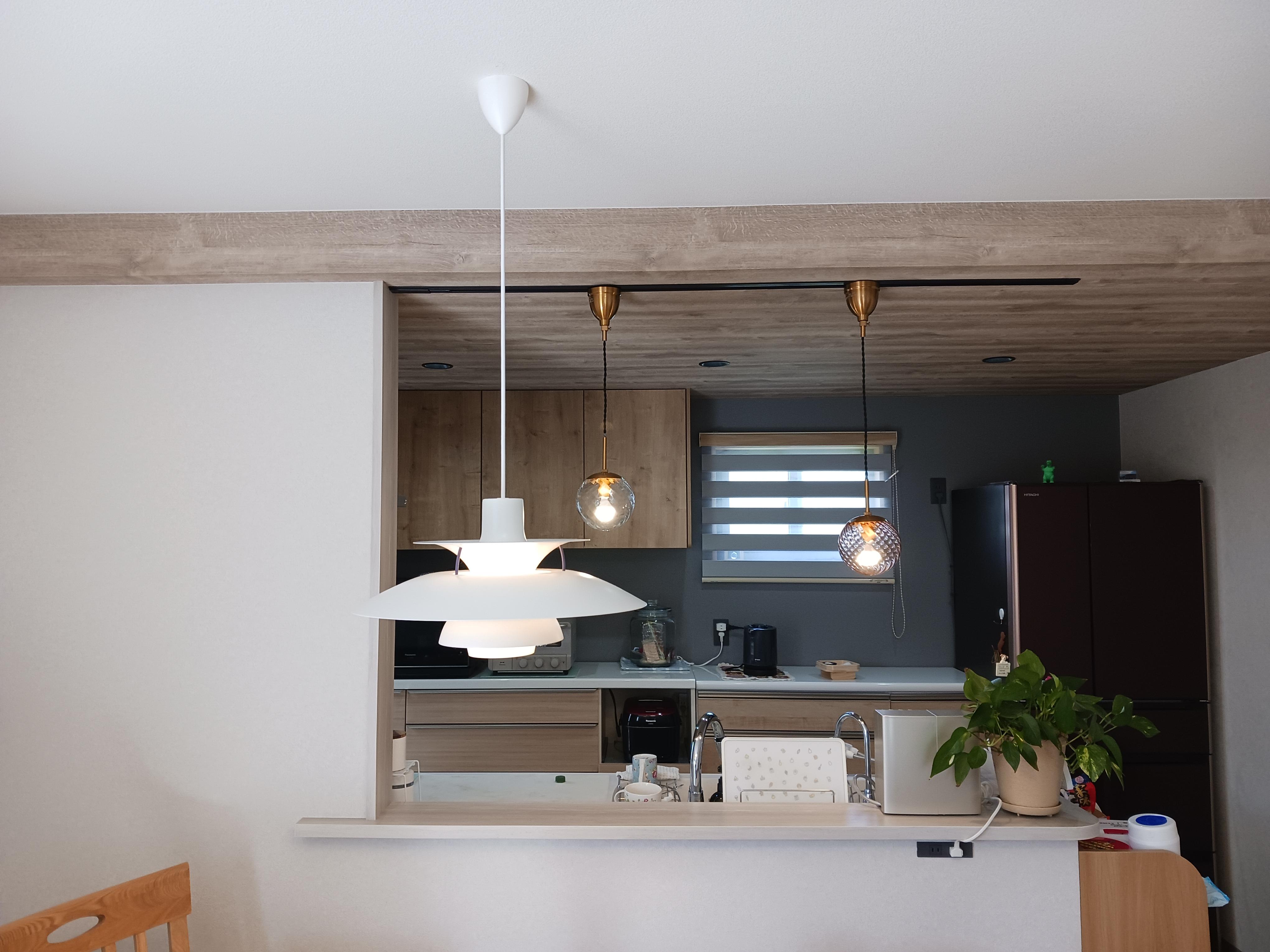 キッチン上の吊戸棚が使いづらくて、空間を遮り、暗くなりがちのキッチンでした。吊戸棚を取ったことによって、ダイニング側と繋がりを感じ、天井を下げたことによって、ググっと奥行きが出き、部屋全体に広がりが感じられ、明るくおしゃれなDKに生まれ変わりました!キッチンの天井を下げることで、見えない壁を作ったように空間が仕切られた印象になります。取り外した吊戸棚は、廃棄せず、背面カウンター上に取付けました。また、下がり天井側の天井・壁クロスは少し暗めにすることで、暗いクロスの視覚効果で、部屋に広がりをもせることができました。下げた天井全体にはダウンライトを利用してスッキリとした印象に。キッチンカウンターの上にはペンダントライトを利用することによって、オシャレな雰囲気を演出し、手元もきちんと照らしてくれます。ペンダントライトは、インテリアショップホバートで決めていただき、下がり天井の木目調とペンダントライトの融合で、おしゃれでありながら、落ち着いた雰囲気を演出してくれてます。
