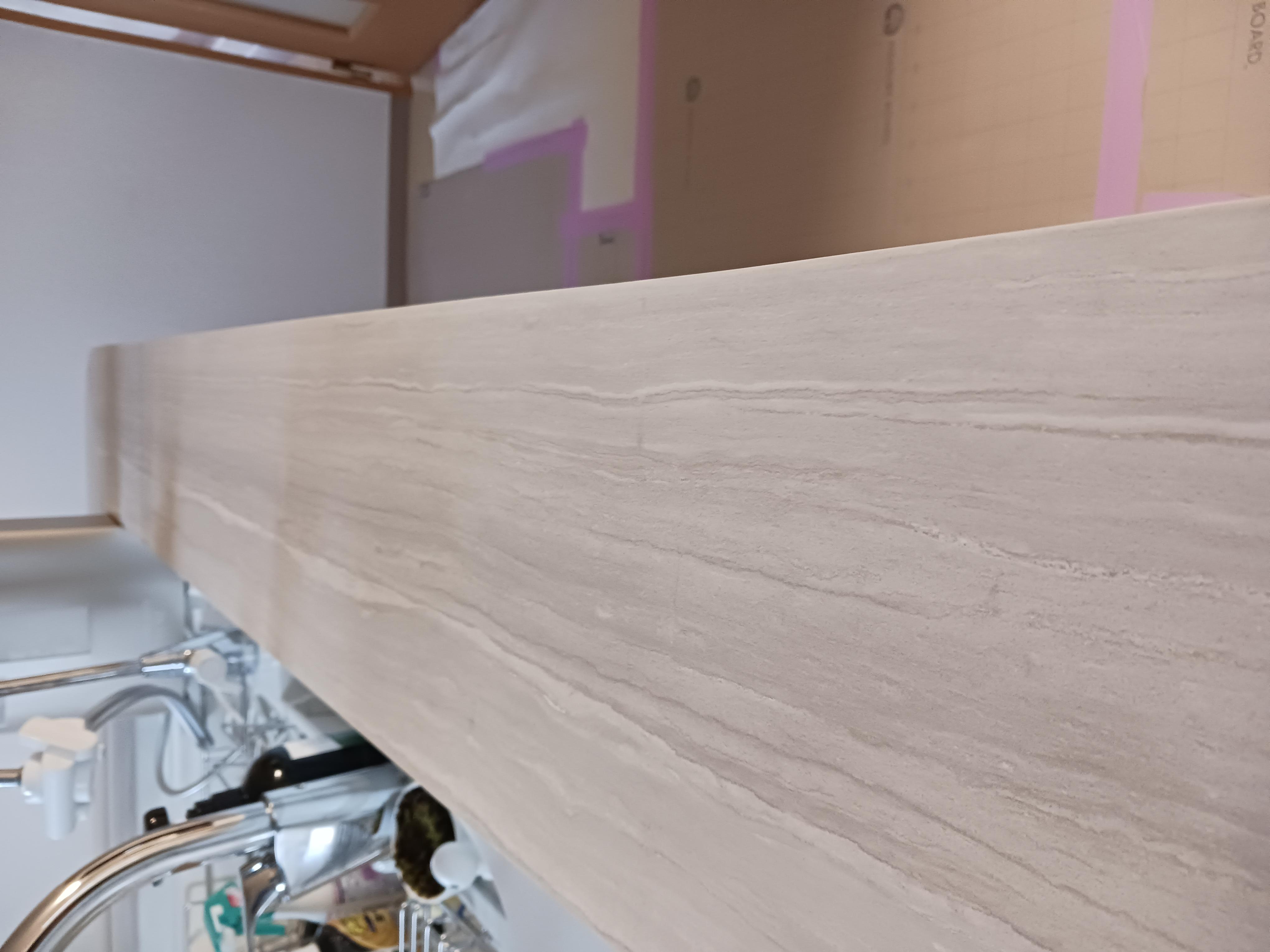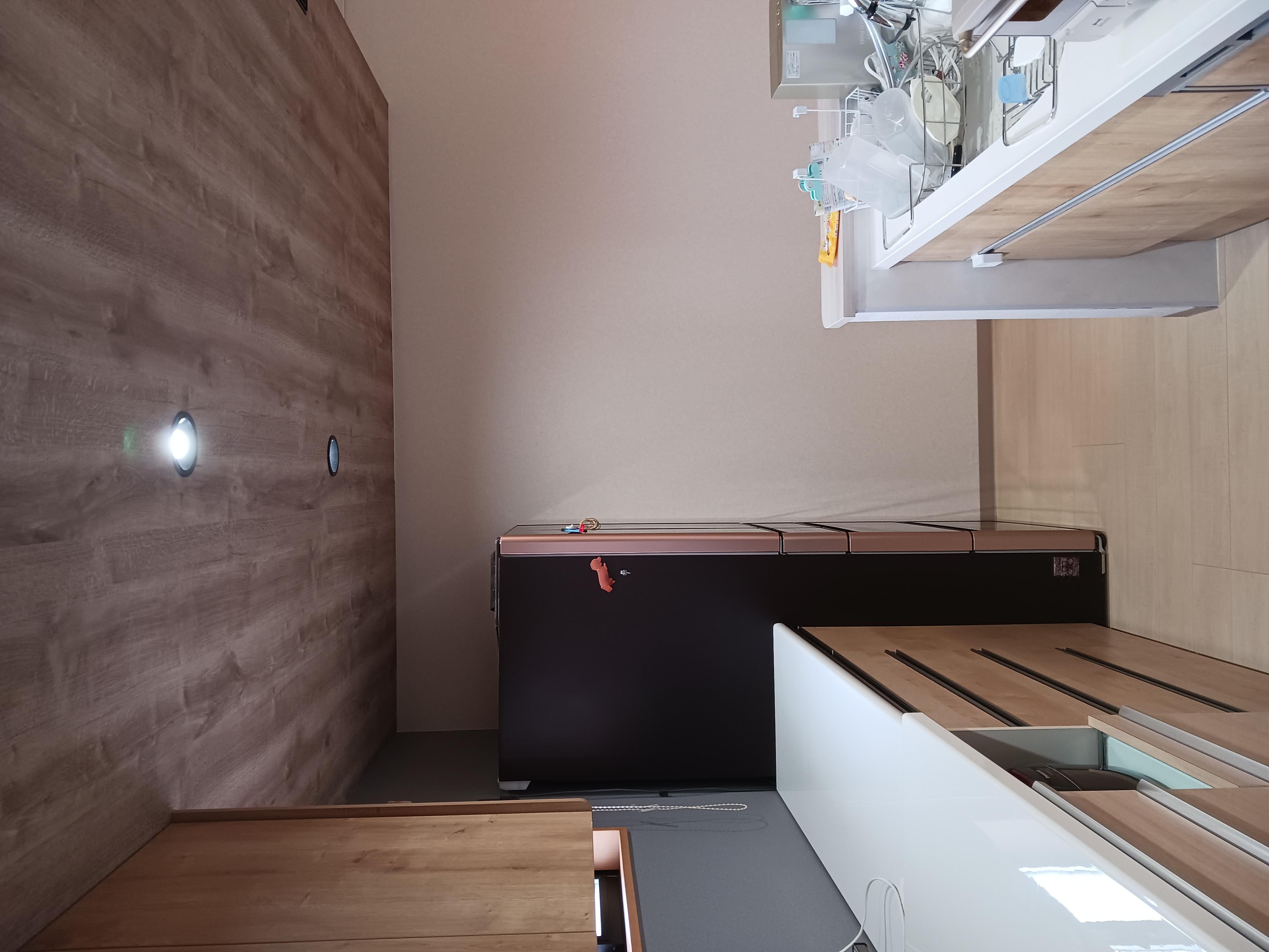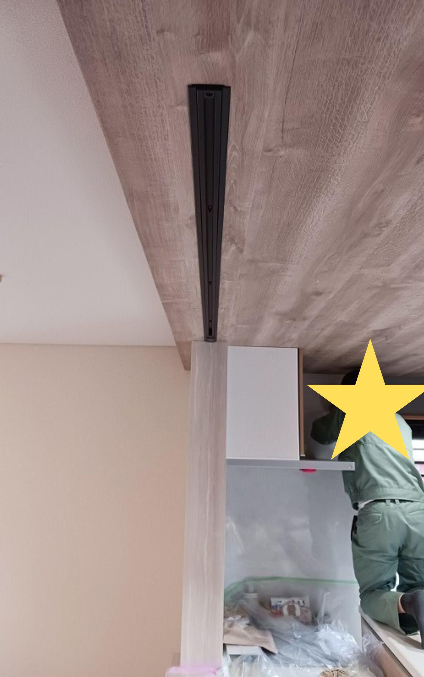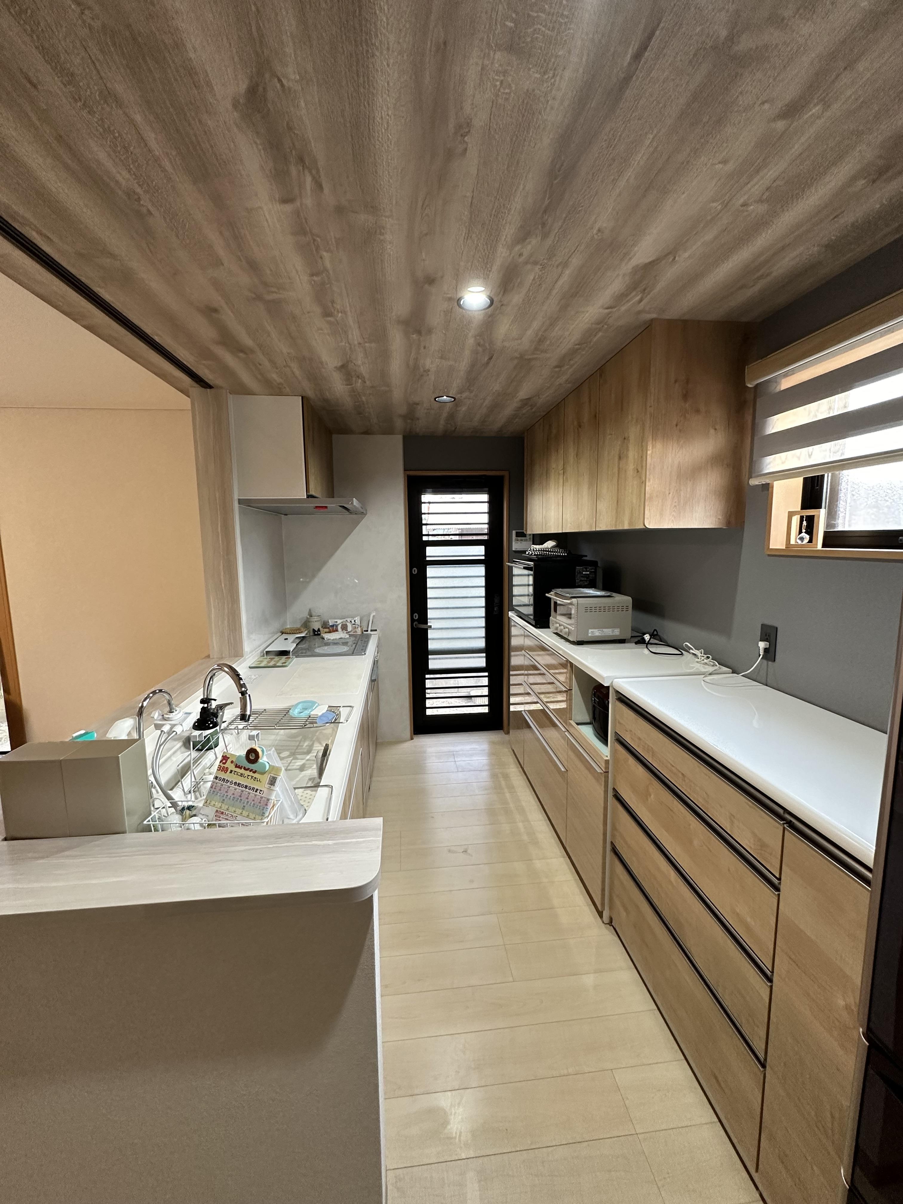 キッチン上の吊戸棚が使いづらくて、空間を遮り、暗くなりがちのキッチンでした。吊戸棚を取ったことによって、ダイニング側と繋がりを感じ、天井を下げたことによって、ググっと奥行きが出き、部屋全体に広がりが感じられ、明るくおしゃれなDKに生まれ変わりました!キッチンの天井を下げることで、見えない壁を作ったように空間が仕切られた印象になります。取り外した吊戸棚は、廃棄せず、背面カウンター上に取付けました。また、下がり天井側の天井・壁クロスは少し暗めにすることで、暗いクロスの視覚効果で、部屋に広がりをもせることができました。下げた天井全体にはダウンライトを利用してスッキリとした印象に。キッチンカウンターの上にはペンダントライトを利用することによって、オシャレな雰囲気を演出し、手元もきちんと照らしてくれます。ペンダントライトは、インテリアショップホバートで決めていただき、下がり天井の木目調とペンダントライトの融合で、おしゃれでありながら、落ち着いた雰囲気を演出してくれてます。