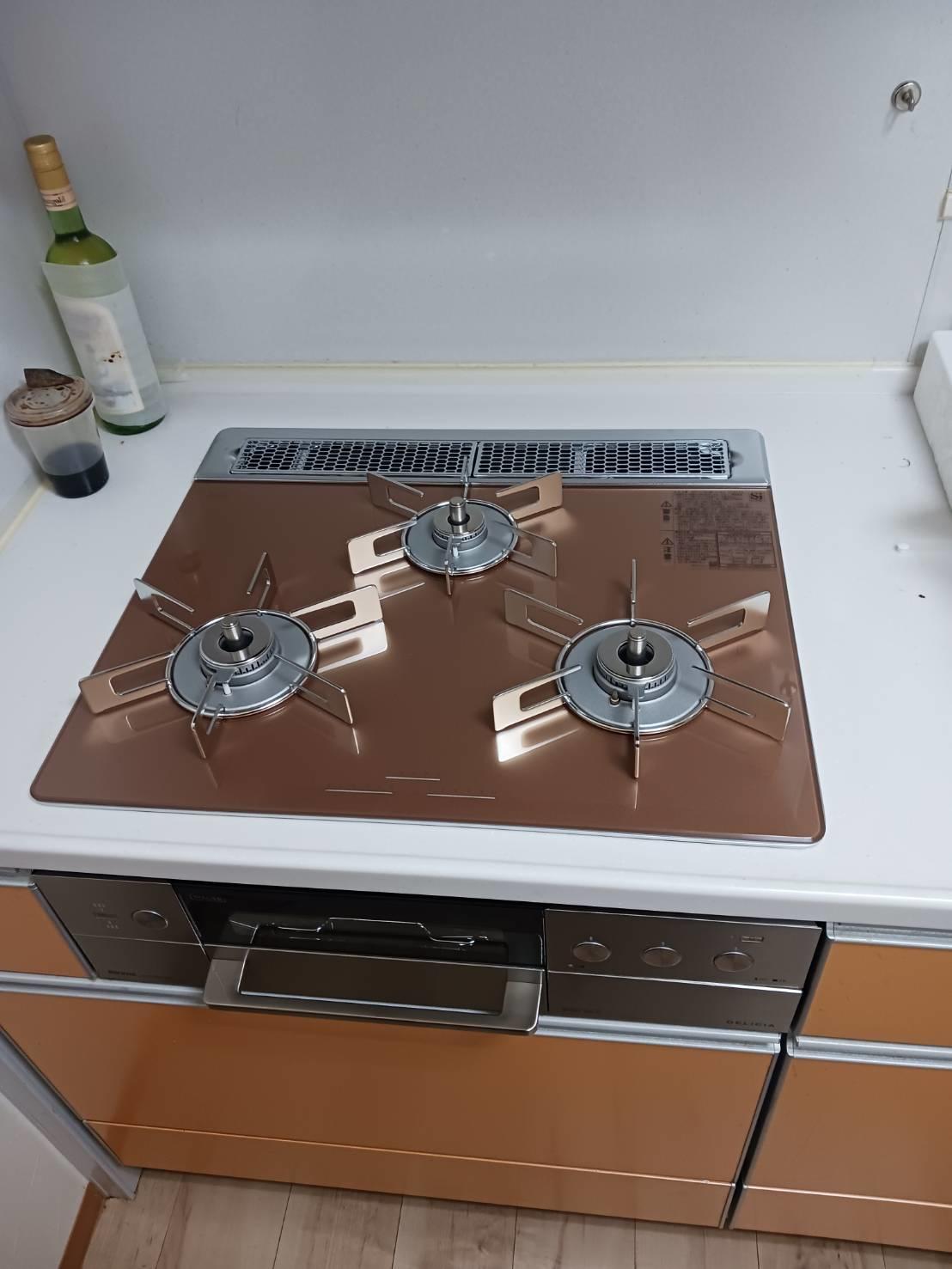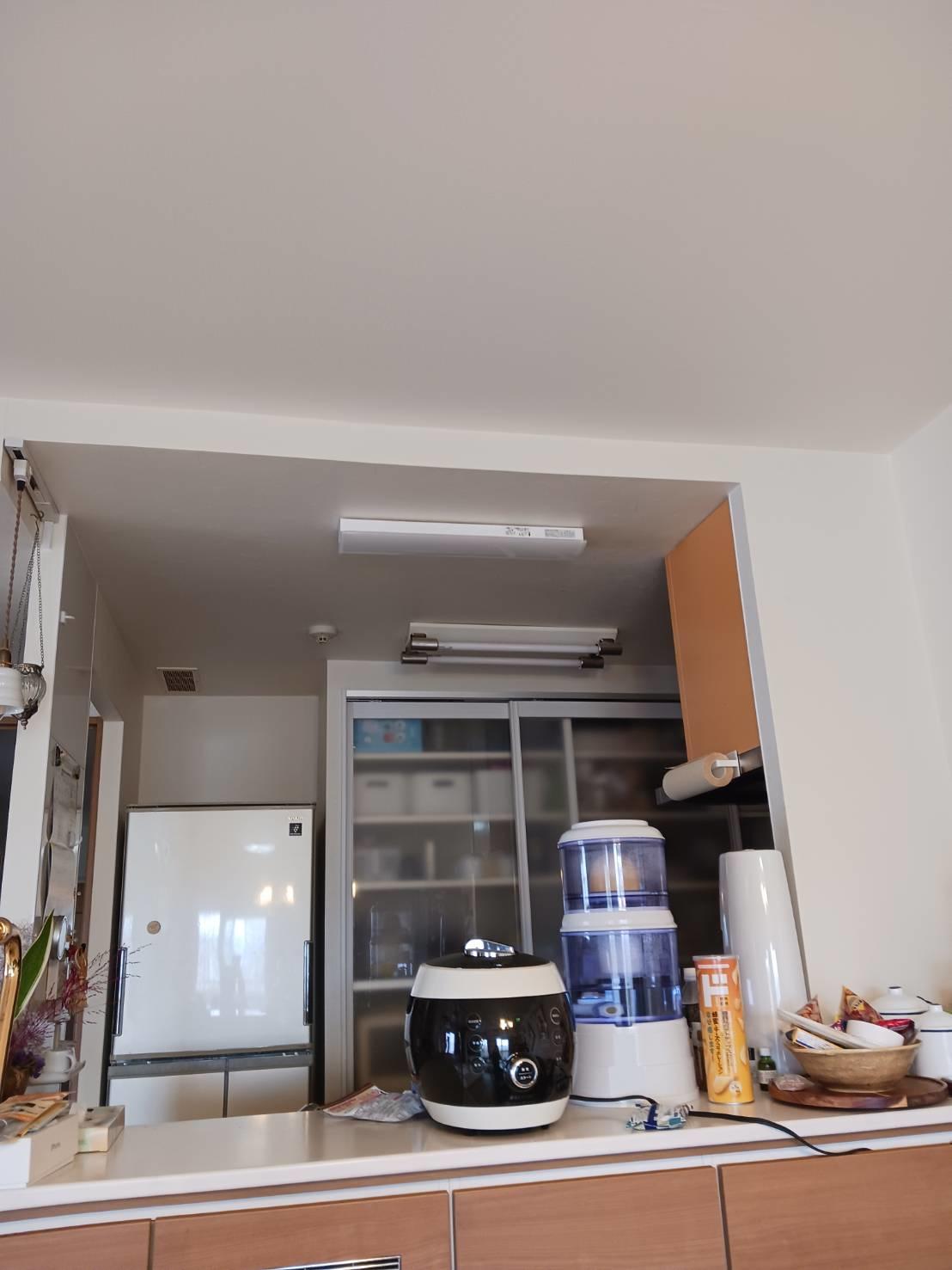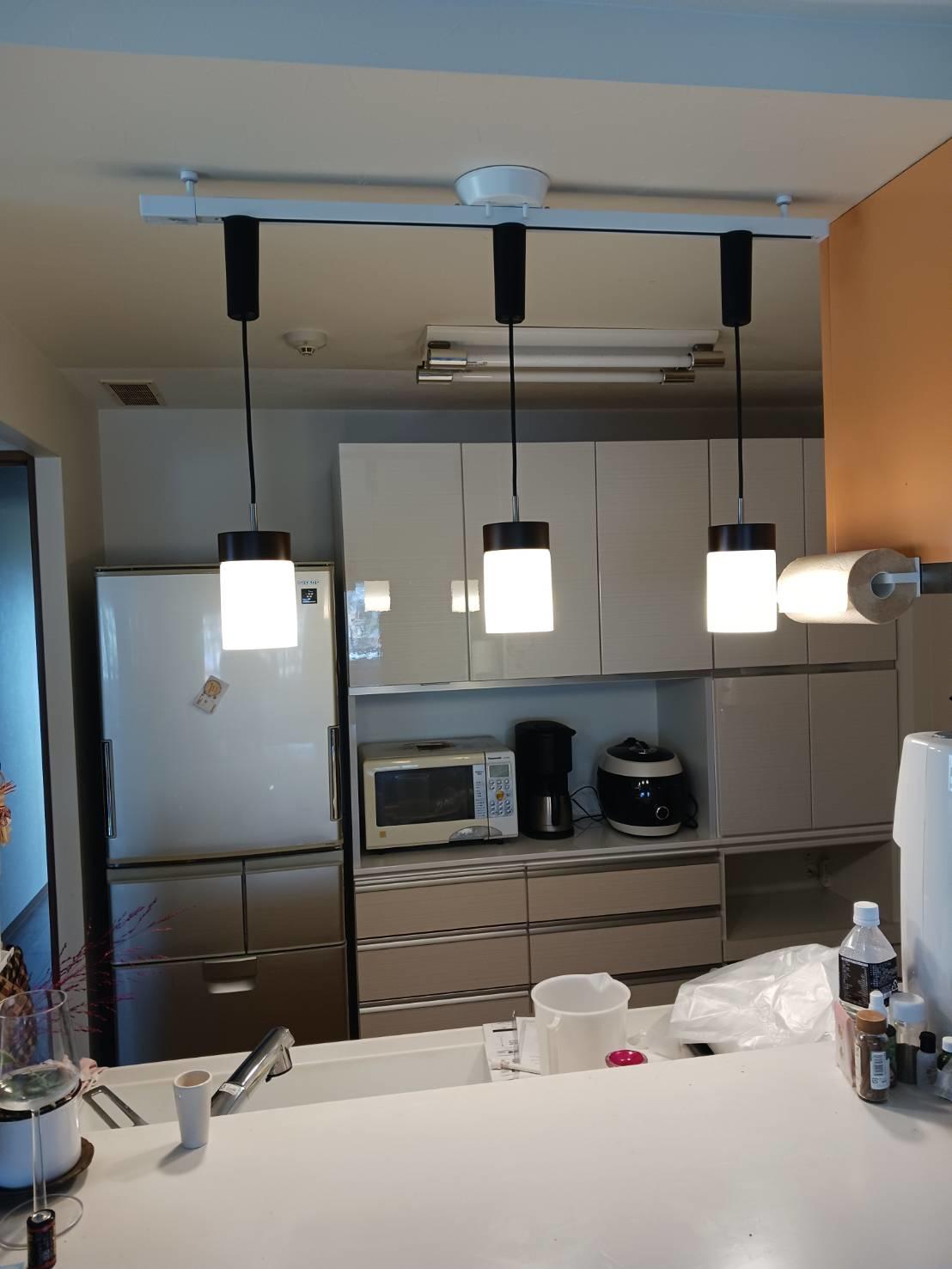 カウンター上には、新しくレールを付けてペンダントライト3連灯を取付ました。 今までカウンター上にあった物が、食器棚に全て収まりお部屋がスッキリしました。