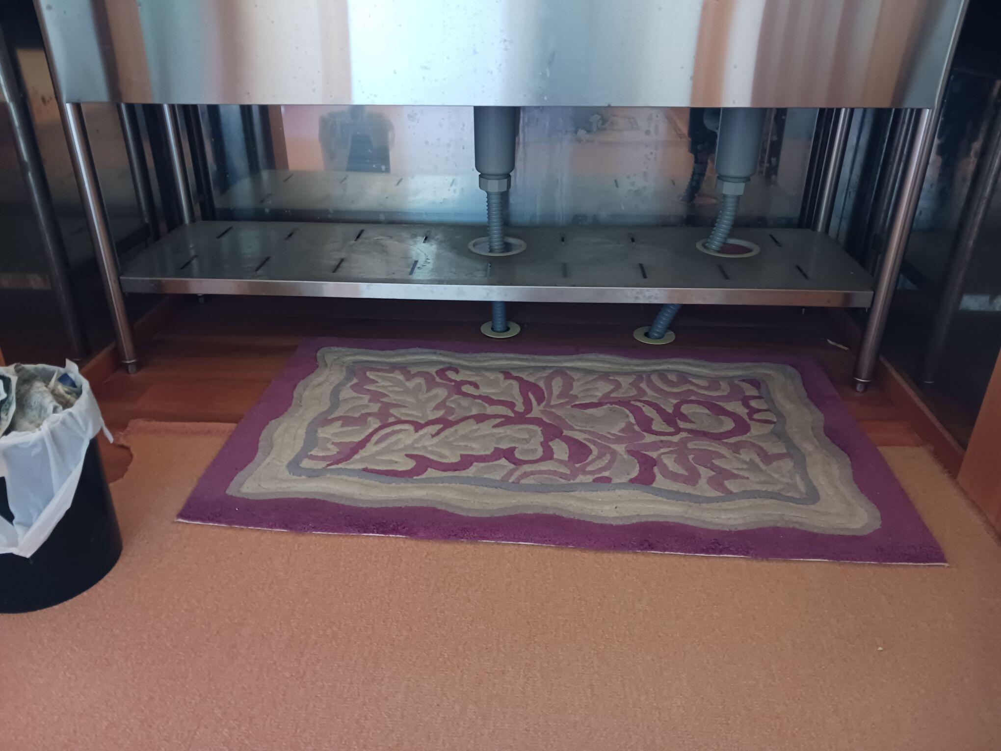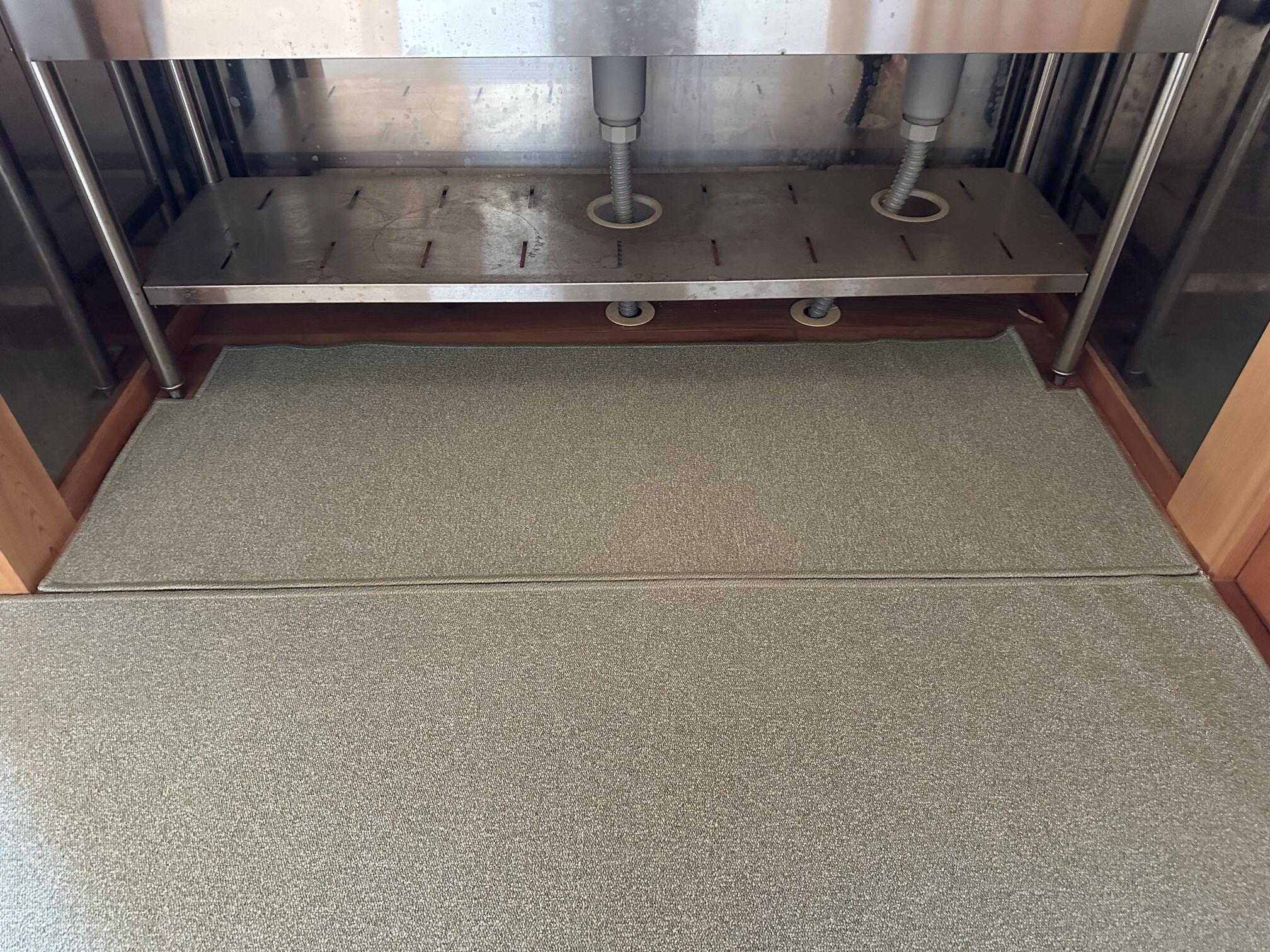 オーダーカーペットの特徴としてフリーカットの対応ができ、カタログに記載にないサイズやあらゆる形に対応が可能です。今回はシンク下に敷くカーペットをフリーカット対応で作成しました。水をこぼされて汚れたりしても、その部分だけ取り外して洗えます。