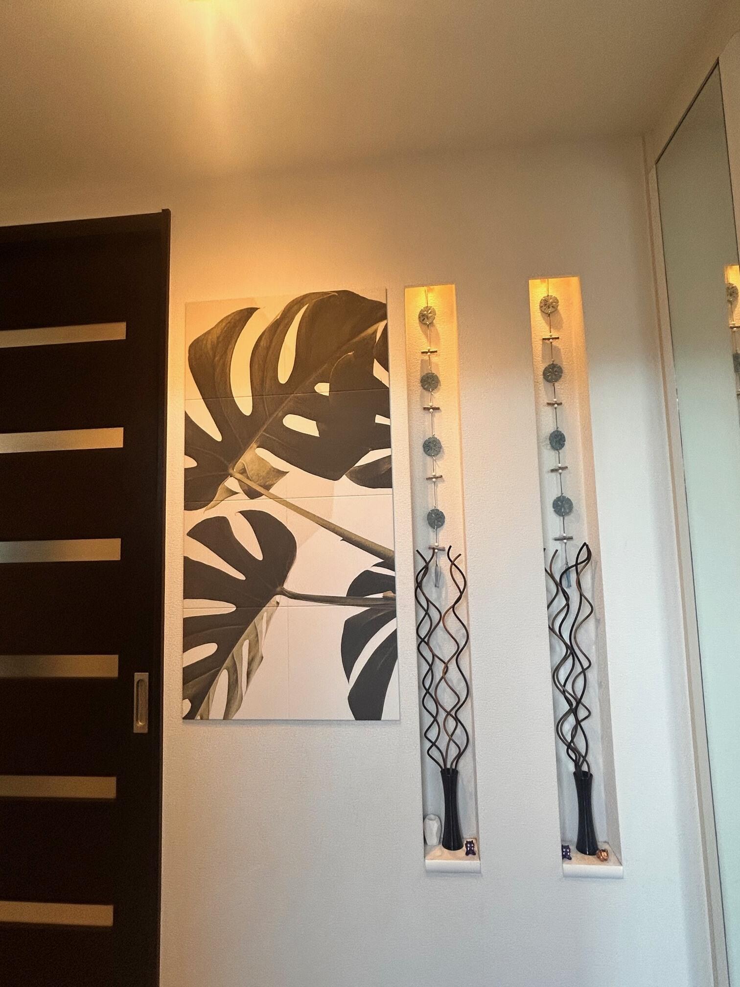 玄関の湿気やにおいが気になるとの事で、絵を飾る感覚でエコカラットセルフを飾りました。マグネットで簡単に取付られるので、お好きな柄をその時の気分で楽しめます。