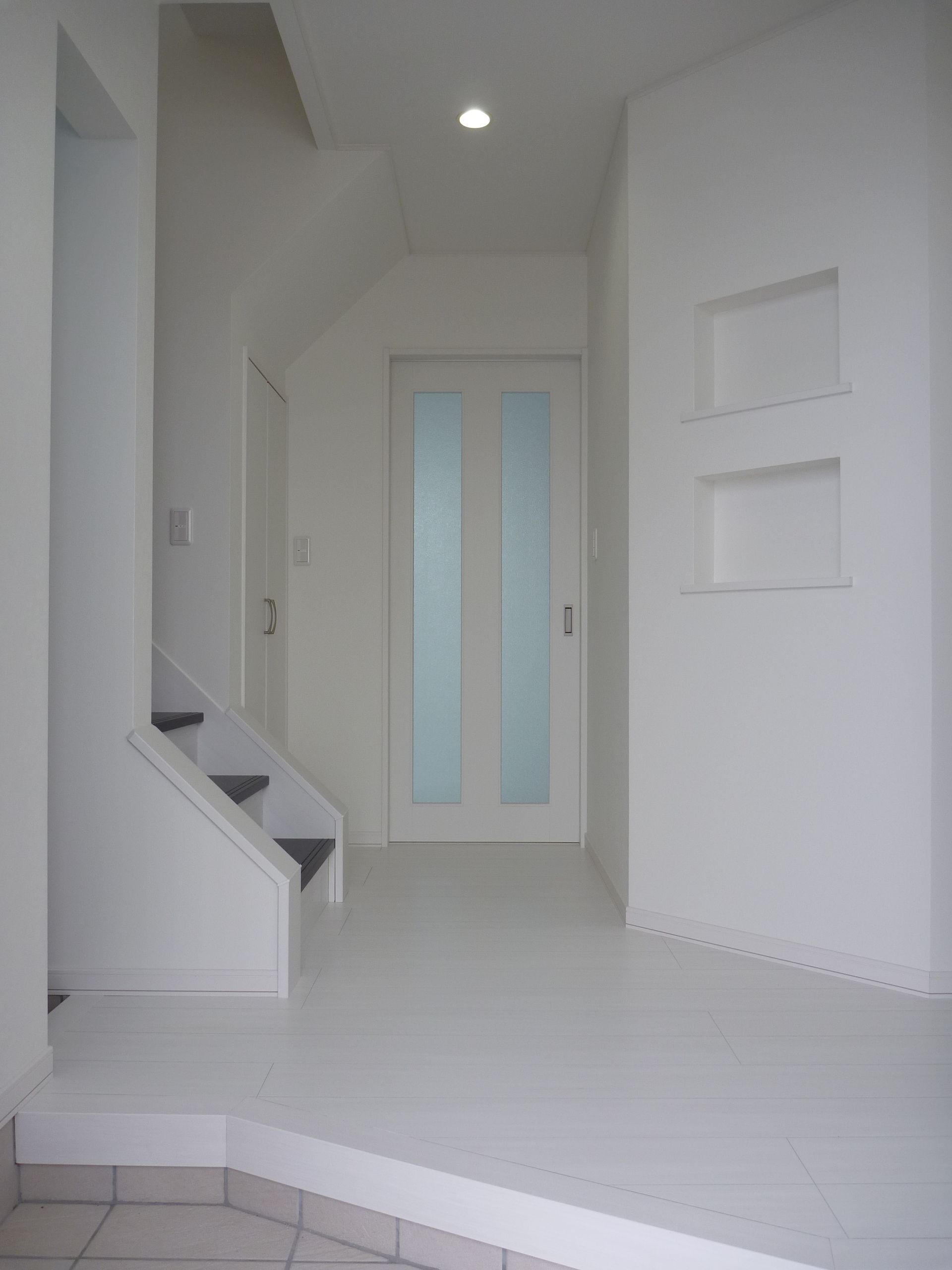 ホワイトの中にクリエダークが映える、シンプルモダンな玄関ホール!!