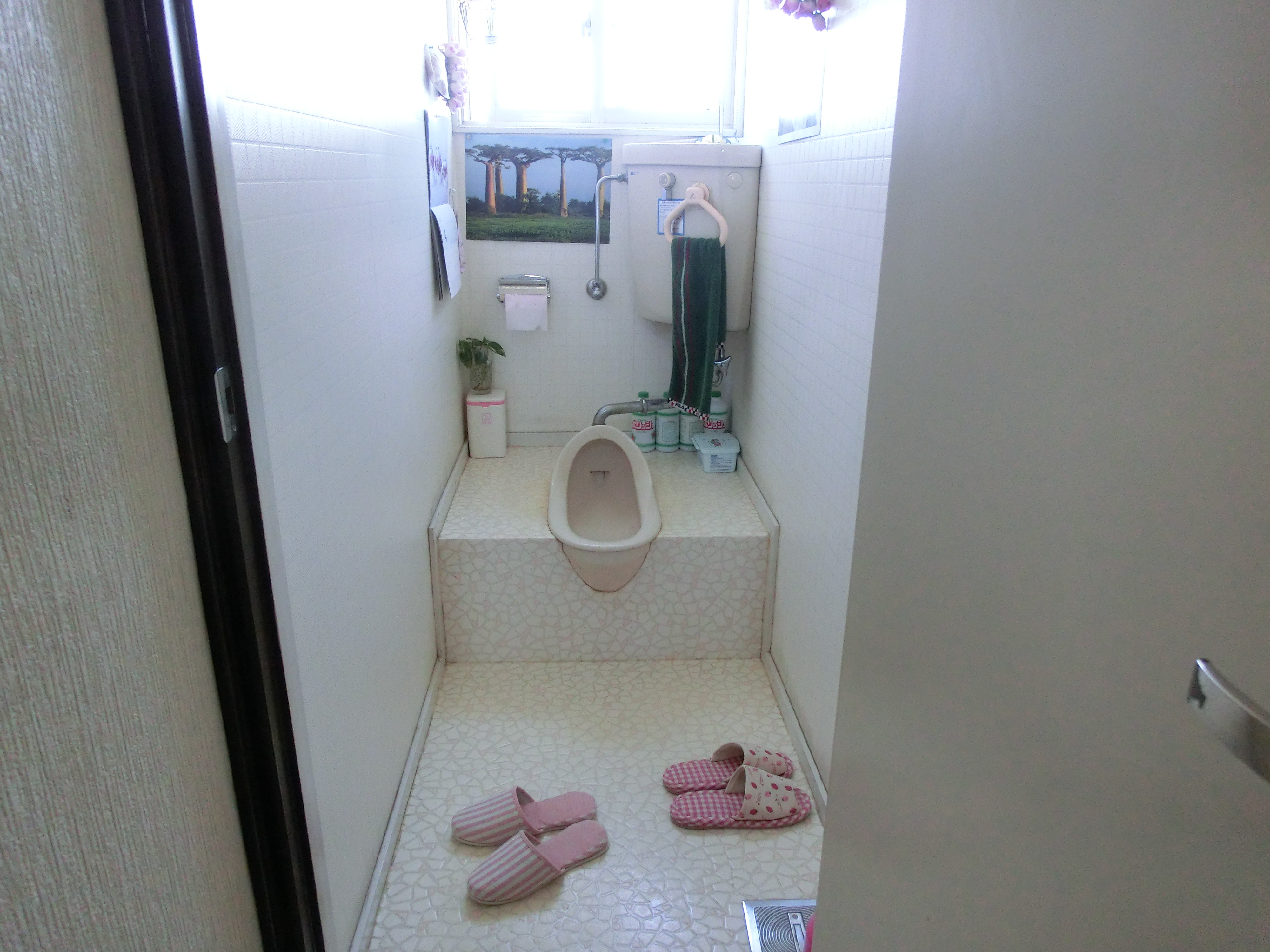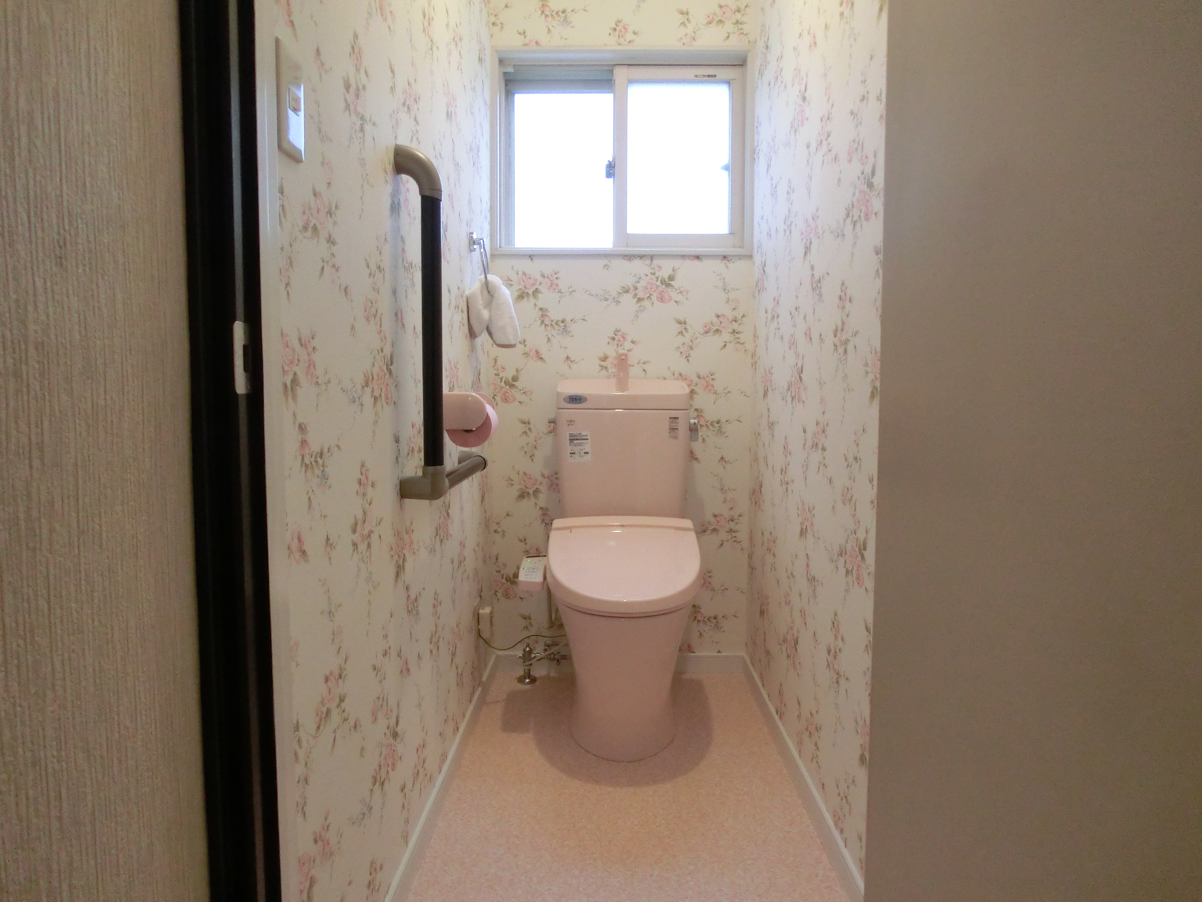 築25年の和式トイレをリフォーム! ピンクの便器に合わせて床もピンクに! クロスもホワイトをベースにピンクの花柄に(*^^*) そして手すりも取付、立ったり座ったりがとても楽になりました。