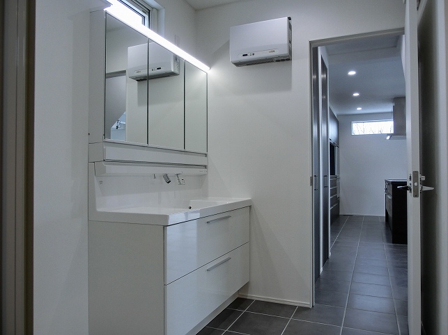 洗面器一体のカウンターはつなぎ目がありません。水栓まわりにも水がたまらないので、拭き掃除が簡単です。大容量の収納に加え、メイク小物などすぐに取り出せるスマートポケット付きです。また、LEDライン照明が洗面室を明るくしてくれます。キッチン・洗面室・浴室と水廻りの集中で家事動線が短くなりました。