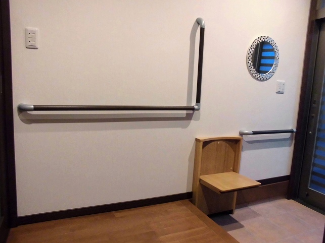 壁付き折りたたみ椅子と手すりを設けました。風除室も設置し、とても暖かく明るい玄関になりました。