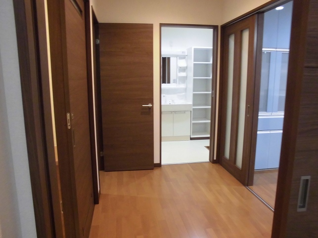 全ての場所を変え、水廻りを集中し一つの動線にしました。水廻り動線をつなぐ廊下には、納戸も設けて収納力も抜群です。