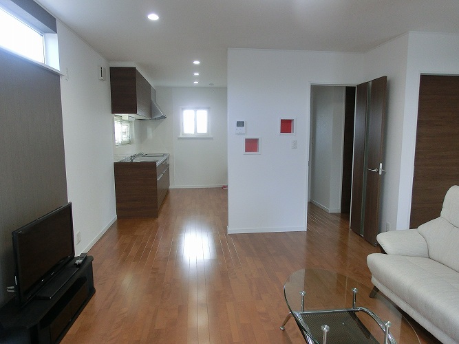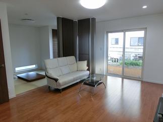 キッチン・リビング・和室と仕切りを無くし、開放的な大空間にしました。いつでも家族の存在を感じられます。大きな窓を設け、陽当たりの良い明るく暖かいリビングになりました。