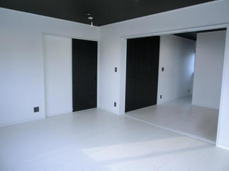 寝室と洋間が続いています。奥には大容量のウォークインクローゼットが設けられています。照明のスイッチやコンセントのカラーがアクセントになっています。