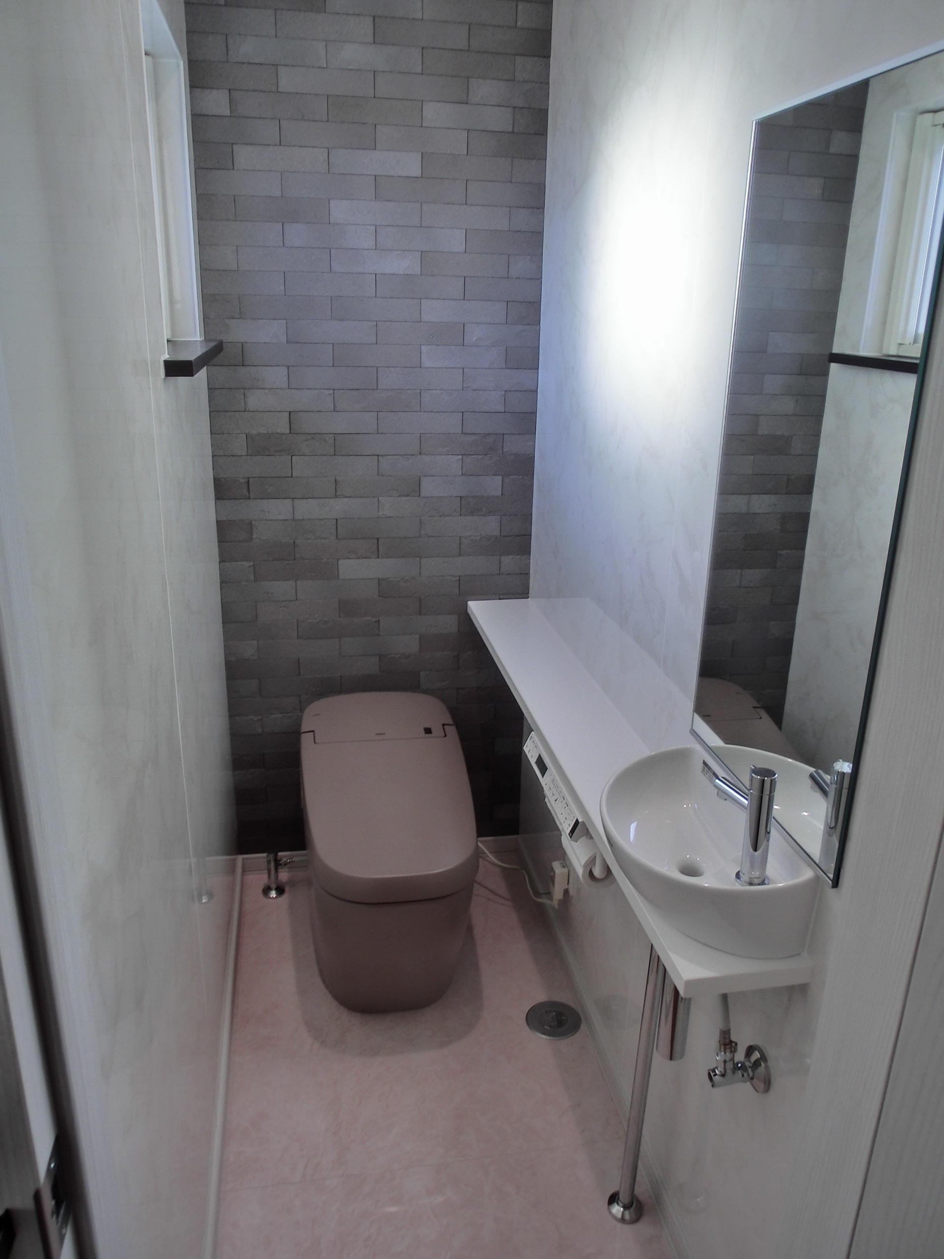 トイレ、床、エコカラットなど一つ一つどれも素敵で、エレガントな空間になりました。ドアを開けた瞬間ノーブルトープのトイレが目を引きます。美しさだけでなく、掃除のしやすい便器になっています。エコカラットプラスがトイレ臭の原因となるアンモニアを消臭してくれるので、清潔で心地よい空間を保ってくれます。