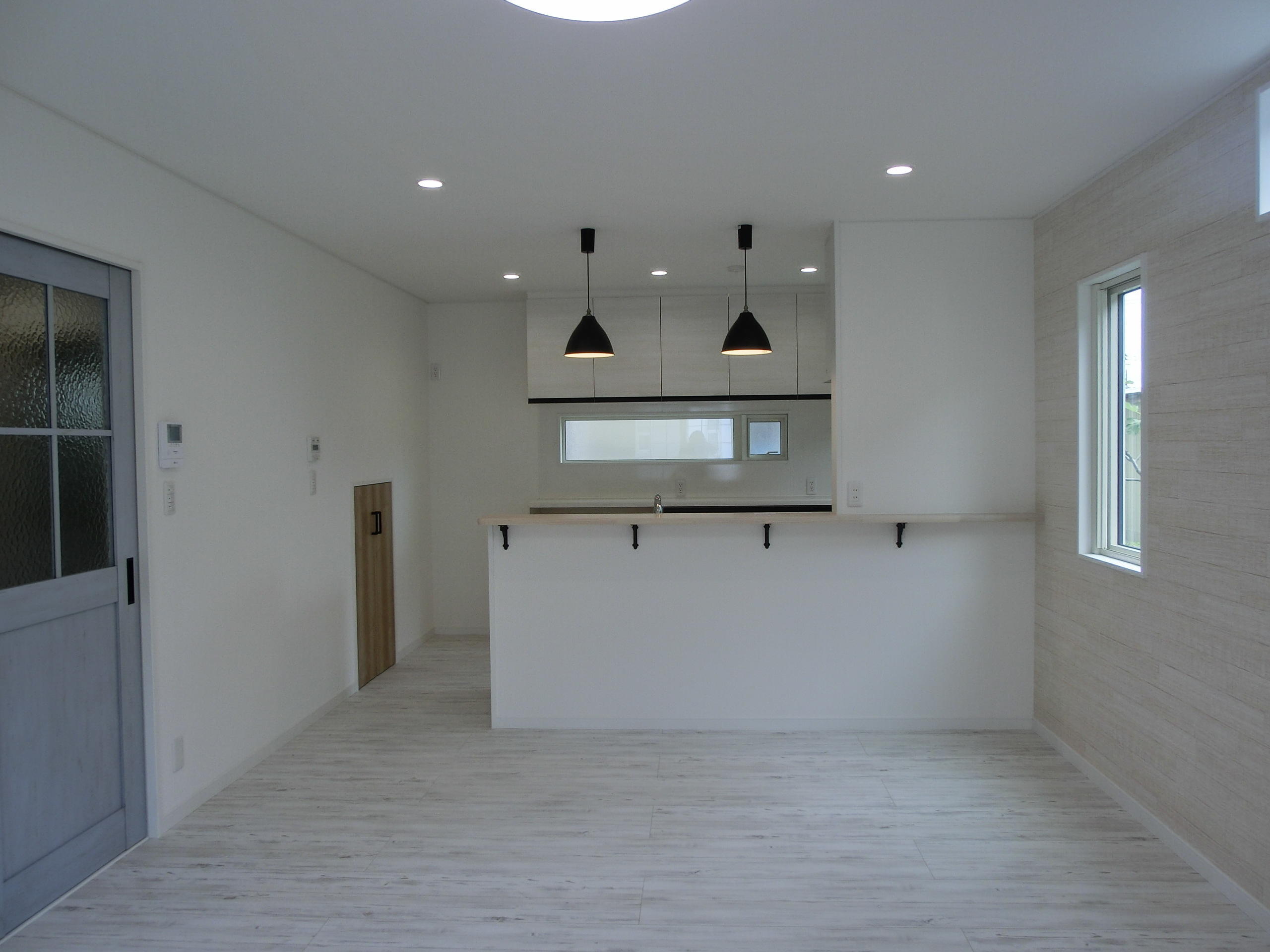 施工前は、リビングとキッチンが分かれていました。隣家に面して4枚建ての掃き出し窓がありましたが高窓にし、プライバシーを確保しながら光をとりこめます。片引戸は、ラシッサDパレット、ブルーペイントを使用しています。