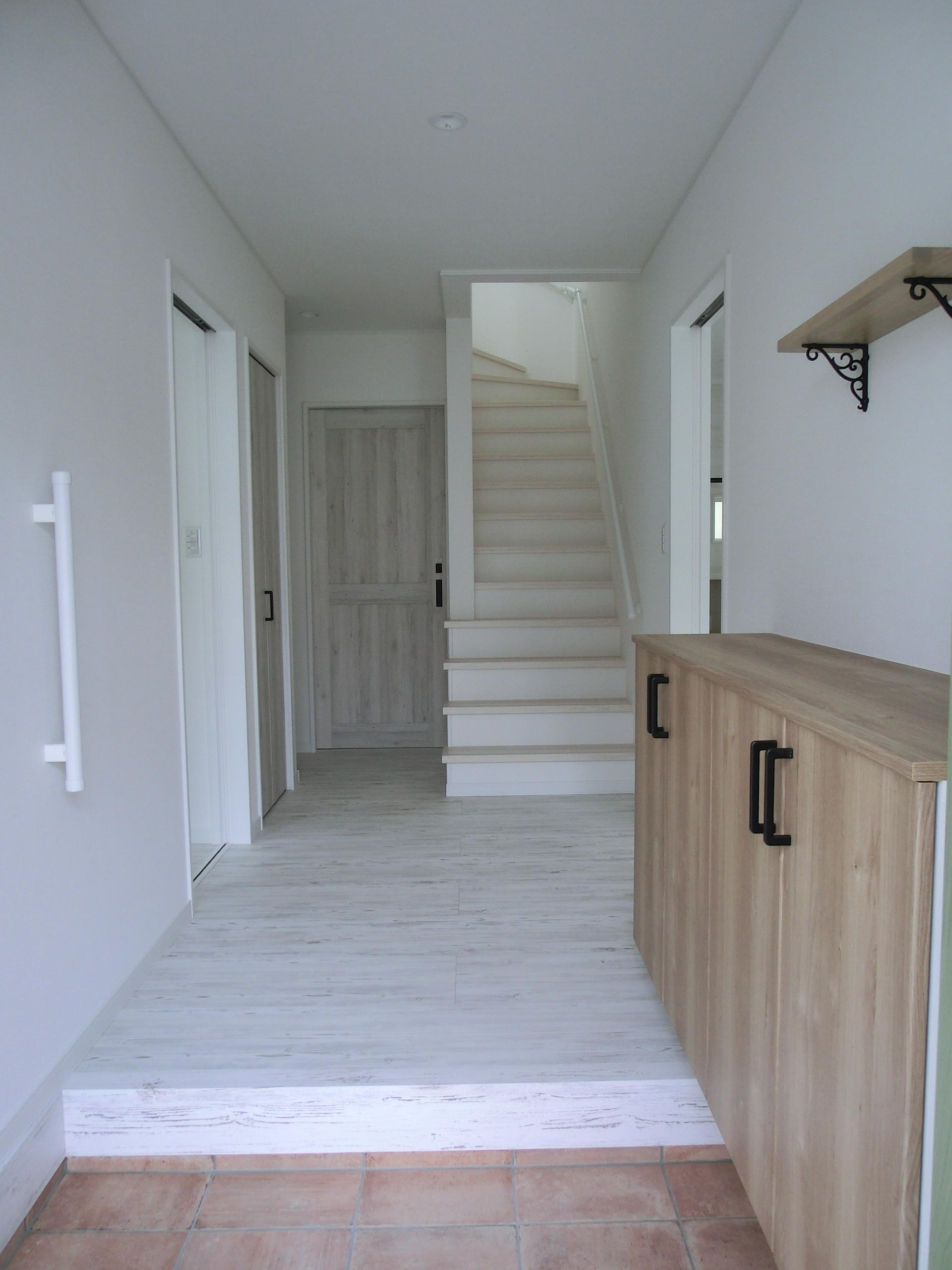 玄関ホールには、手すりを設置しました。ホール横の和室にあった、押入の向きをホール側に変え、物入れにしました。