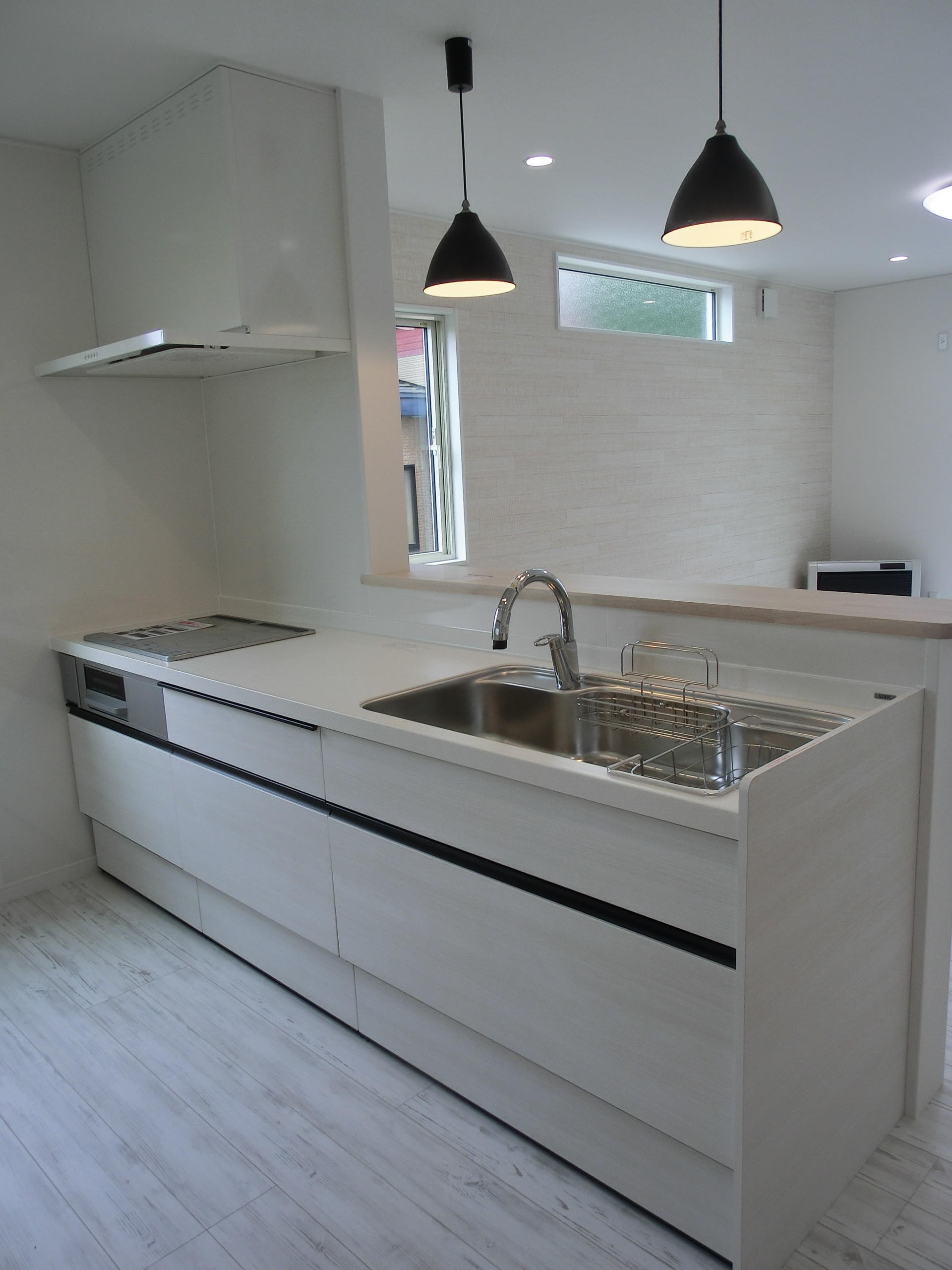 対面式キッチンには、カウンターを取付け、手元が隠れるようにしました。カウンター下も有効に使用できます。